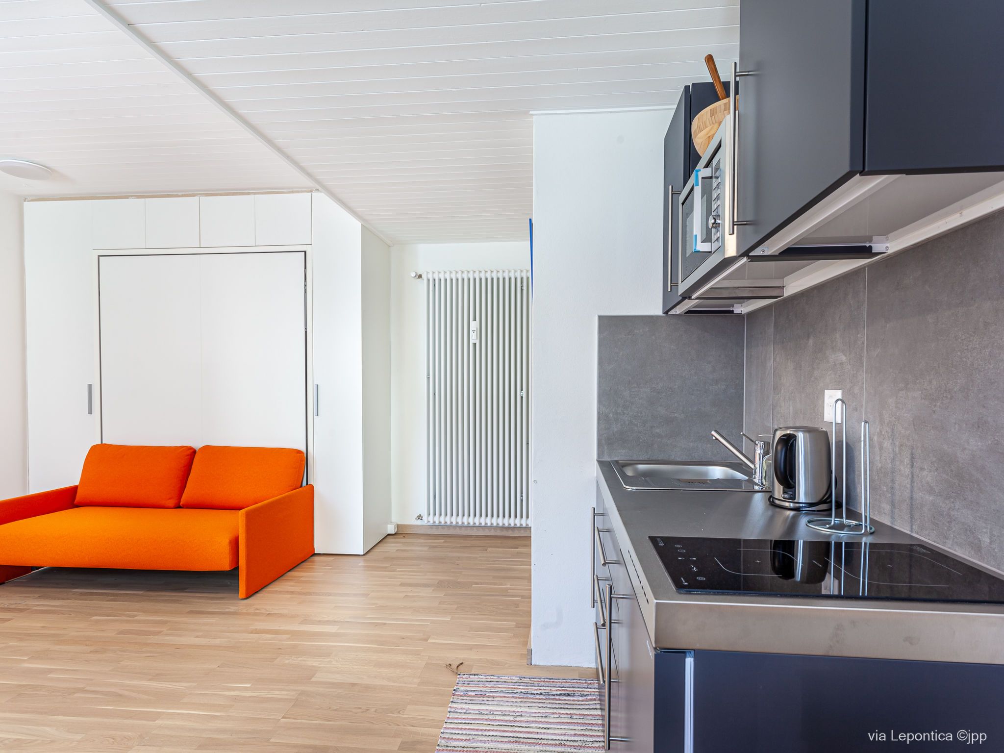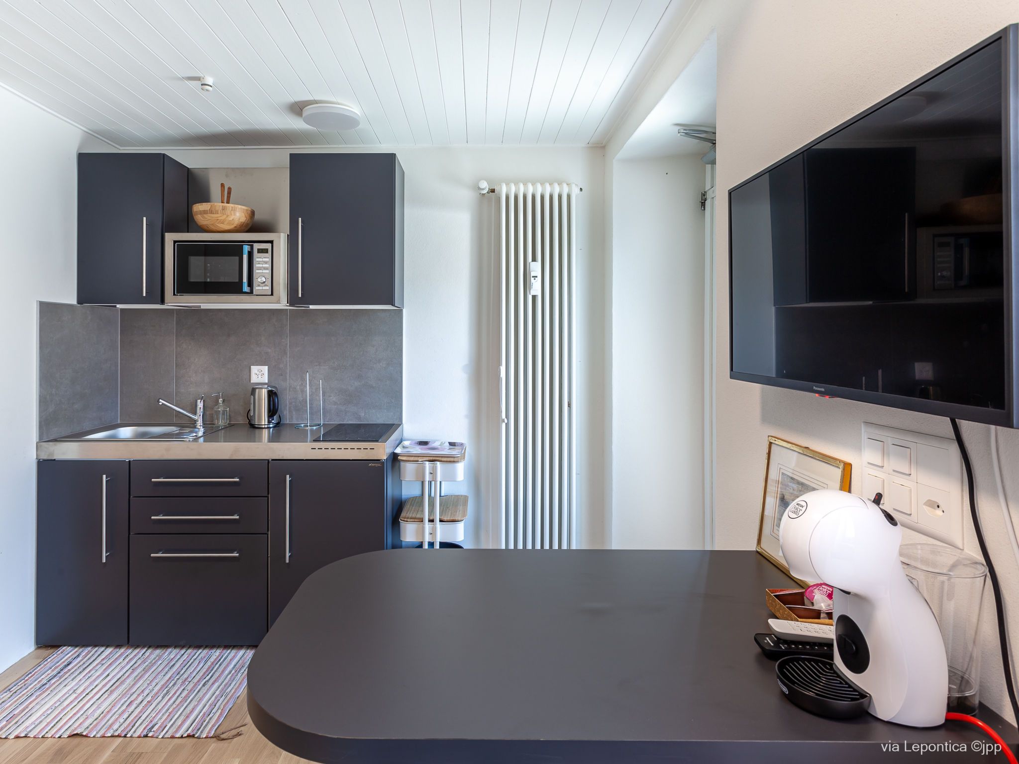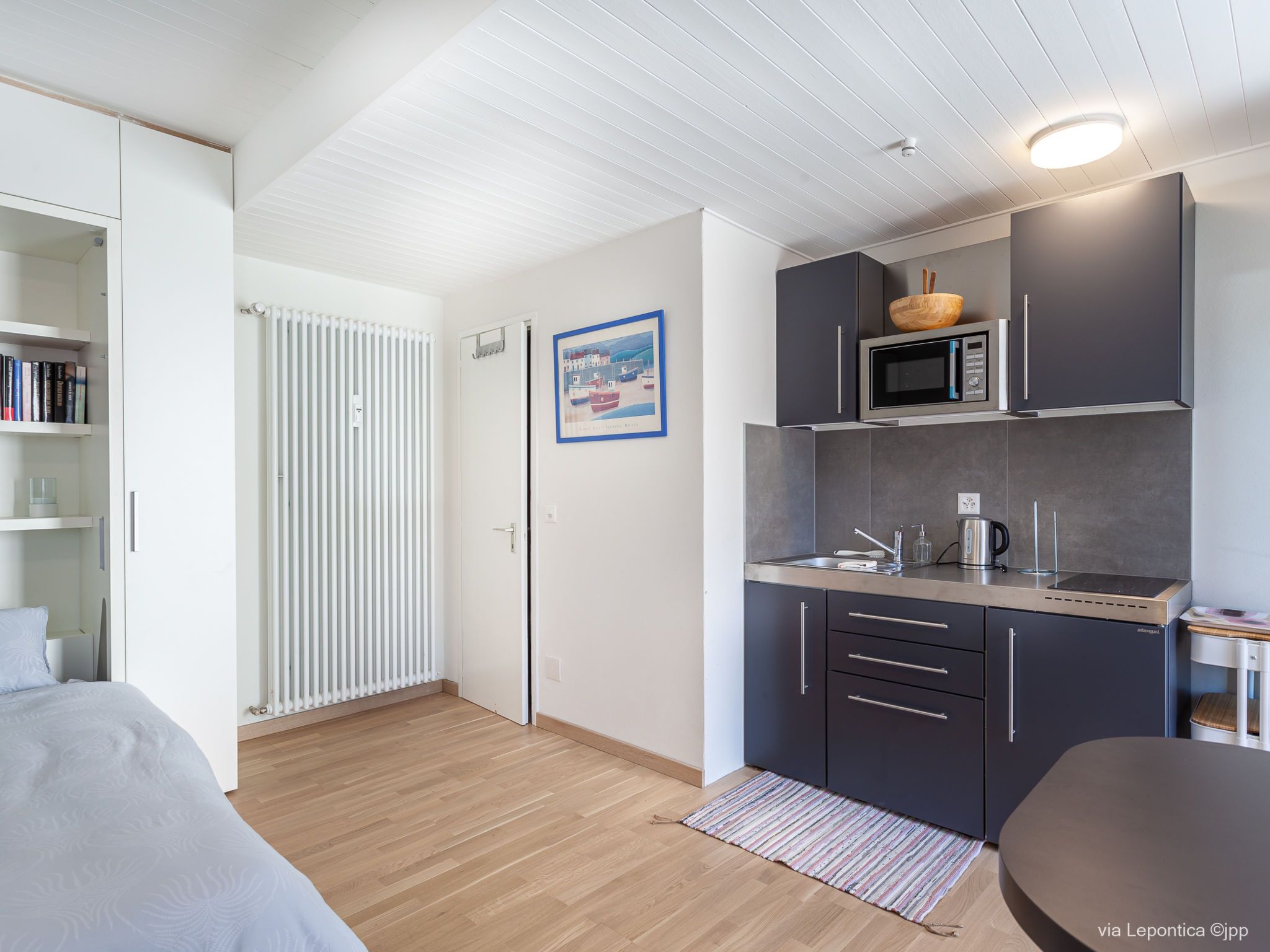 Studio Lepontica, 1-Zimmer-Studio 24 m2, im Erdgeschoss, Ostlage. Objekt geeignet für 2 Erwachsene. Vollständig renoviert im Jahre 2023, komfortabel und modern eingerichtet: offenes Wohn-/Schlafzimmer mit 1 Doppelwandschrankbett (1 x 160 cm, Länge 200 cm), TV. Kochnische (Geschirrspüler, 2 Glaskeramikplatten, Wasserkocher, Mikrowelle, elektrische Kaffeemaschine, Kapseln für die Kaffeemaschine (Dolce Gusto) extra) mit kleiner Bar. Dusche/WC. Heizung. Holzdielenboden. Eingeschränkte Sicht auf die Berge. Zur Verfügung: Haartrockner. Internet (Wireless LAN, gratis). Bitte beachten: Nichtraucher-Unterkunft. Eigener Eingang, Rauchmelder. NL-