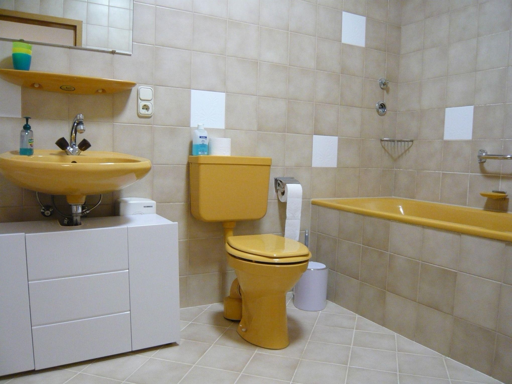 Das Badezimmer ist mit einem Vollbad, WC und Waschbecken versehen.