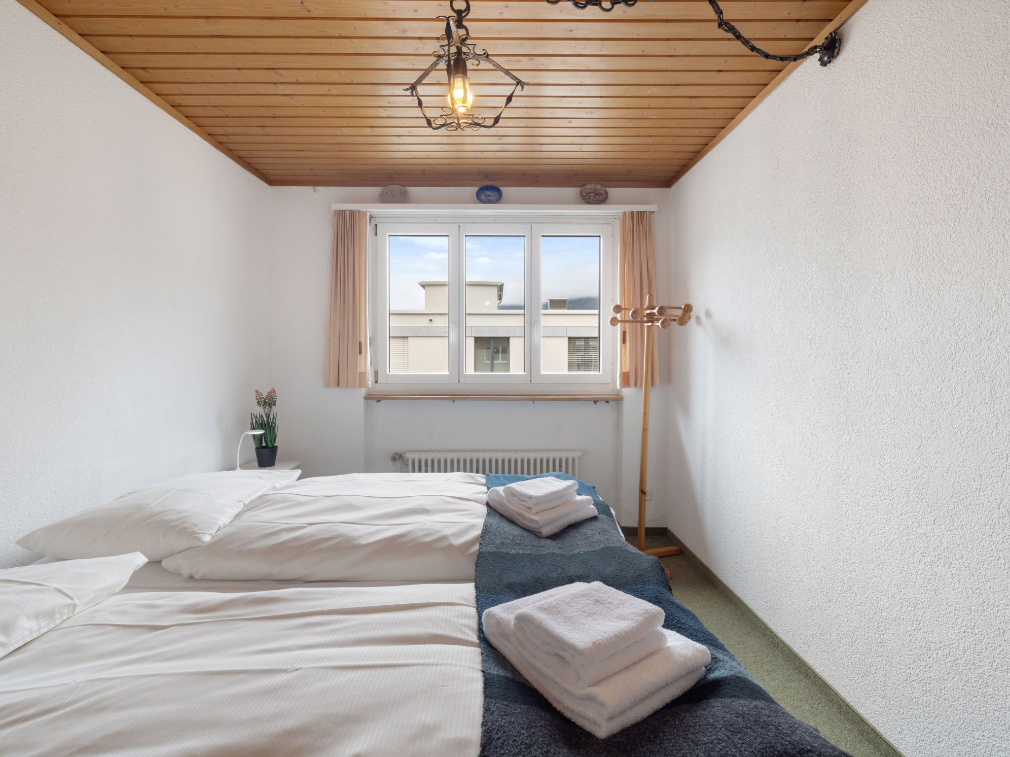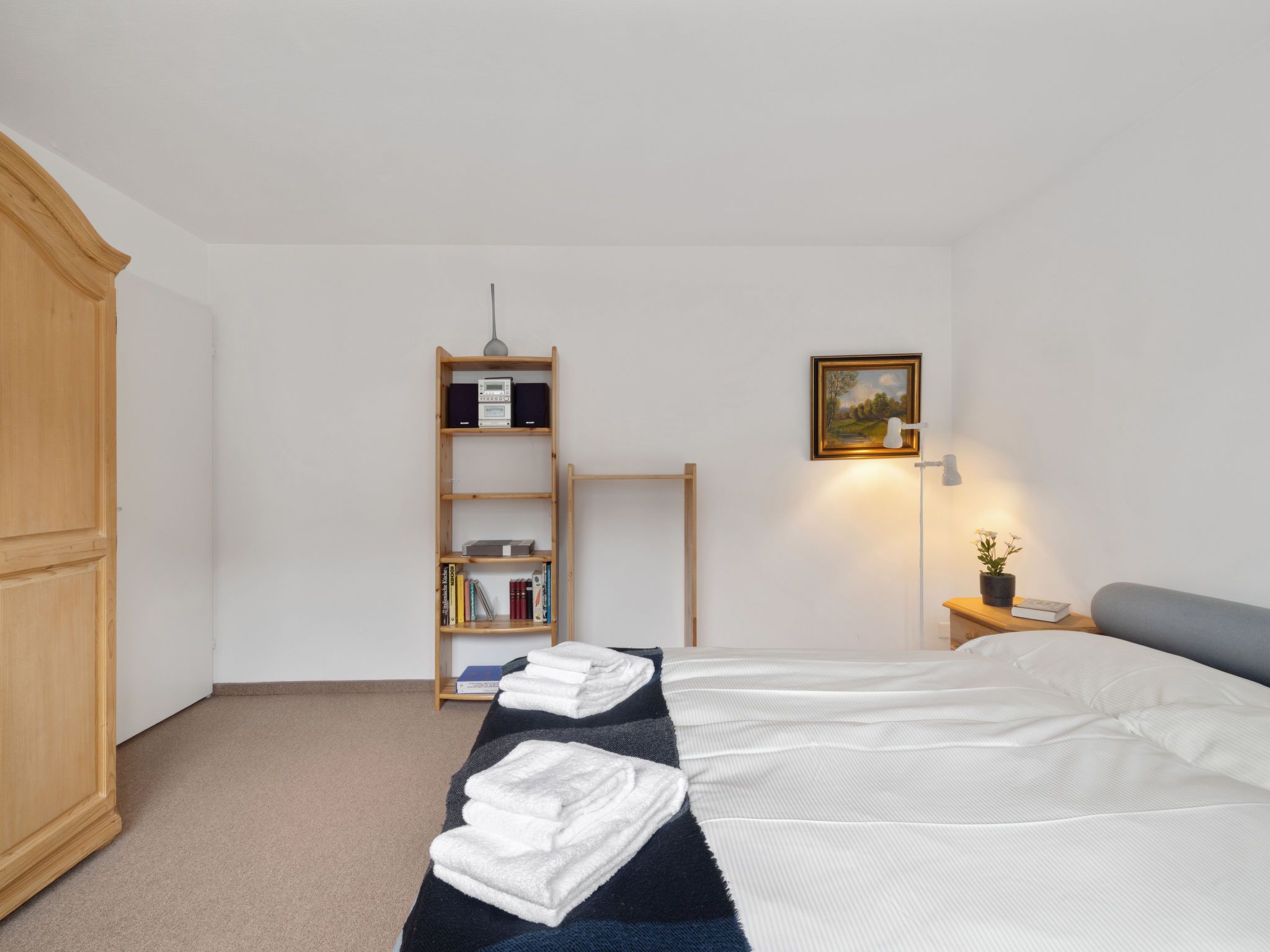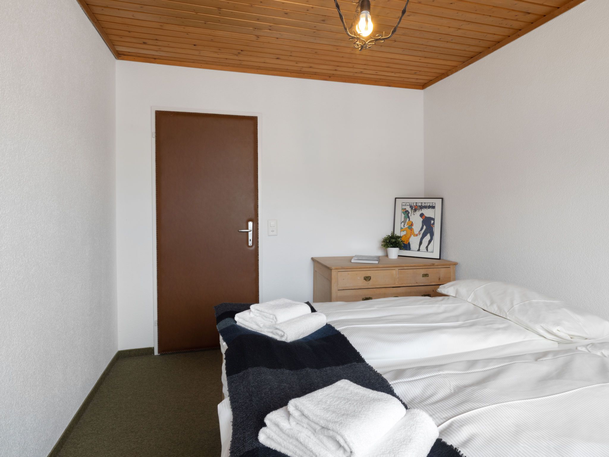 Regina Apt Golfblick, 6-Zimmer-Wohnung 160 m2 im 4. Stock, Südostlage. Geräumig, einfach und zweckmässig eingerichtet: Wohn-/Esszimmer mit offenem Kamin (nur Deko), Kabel-TV (Flachbildschirm). Ausgang zum Balkon, Richtung Südosten. 1 Doppelzimmer 20 m2 mit 1 Doppelbett (2 x 90 cm, Länge 200 cm). 1 Zimmer 15 m2 mit 1 franz. Bett (1 x 140 cm, Länge 200 cm). 3 Zimmer, jedes Zimmer mit 1 Bett (90 cm, Länge 200 cm). Offene Küche (Backofen, Geschirrspüler, 4 Glaskeramikplatten, Toaster, Wasserkocher, Mikrowelle, elektrische Kaffeemaschine, Kapseln für die Kaffeemaschine (Nespresso) extra, Fondue Set (Chinoise, Käse)) mit Esstisch. Bad/WC, Dusche/WC, sep. WC, Doppelwaschbecken. Teppichboden. Balkon 15 m2, Südostlage. Balkonmöbel. Panoramasicht auf die Berge und das Städtchen. Zur Verfügung: Internet (WLAN, gratis). Bitte beachten: geeignet für Familien. Nichtraucher-Unterkunft, kein Parkplatz. Anstelle eines abgeschlossenen Schlafzimmers befinden sich manche Schlafplätze in einem offenen Bereich (Galerie, Nische etc.). 50047
