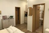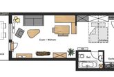 In unserer 53 qm großen Studio Wohnung stehen Ihnen ein Wohn-/Schlafraum mit Küchenzeile, eine gemütliche Essecke und ein Badezimmer zur Verfügung.