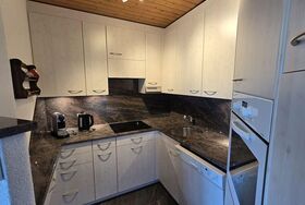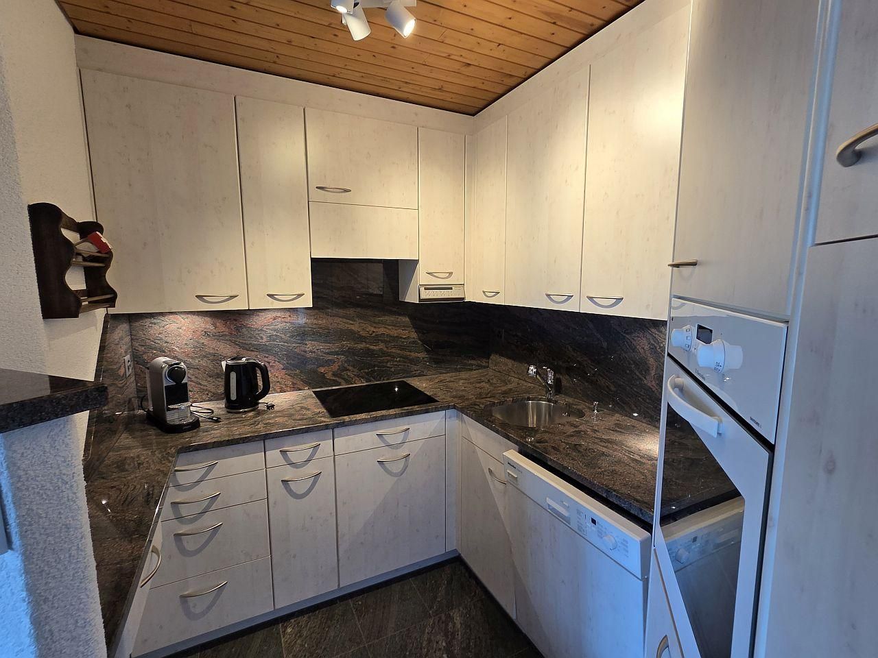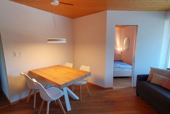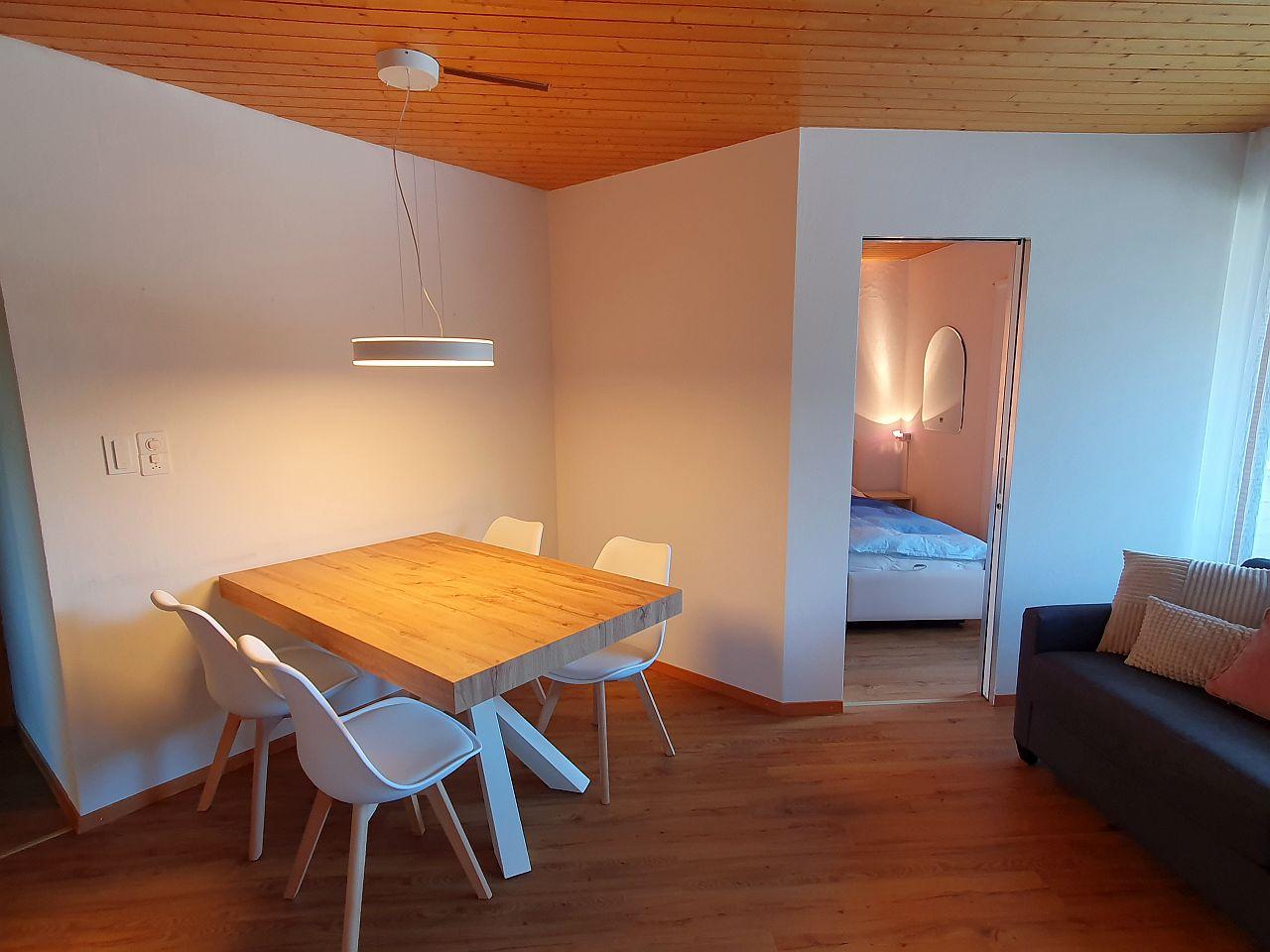 1.5- Zimmer-Wohnung (ca. 46,5 m²) im Haus Miez. Die Wohnung verfügt über ein grosses Wohnzimmer mit integrierter Einbauküche (Geschirrspüler, Backofen, Kühlschrank). Balkon, TV und W-Lan. Zwei Schlafmöglichkeiten im Wohnzimmer (Doppelschlafsofa) und ein Doppelbett im Schlafzimmer. Badezimmer, separates WC.