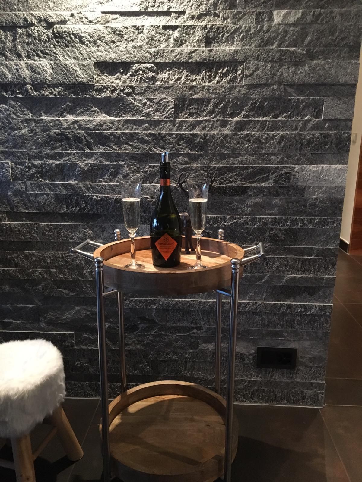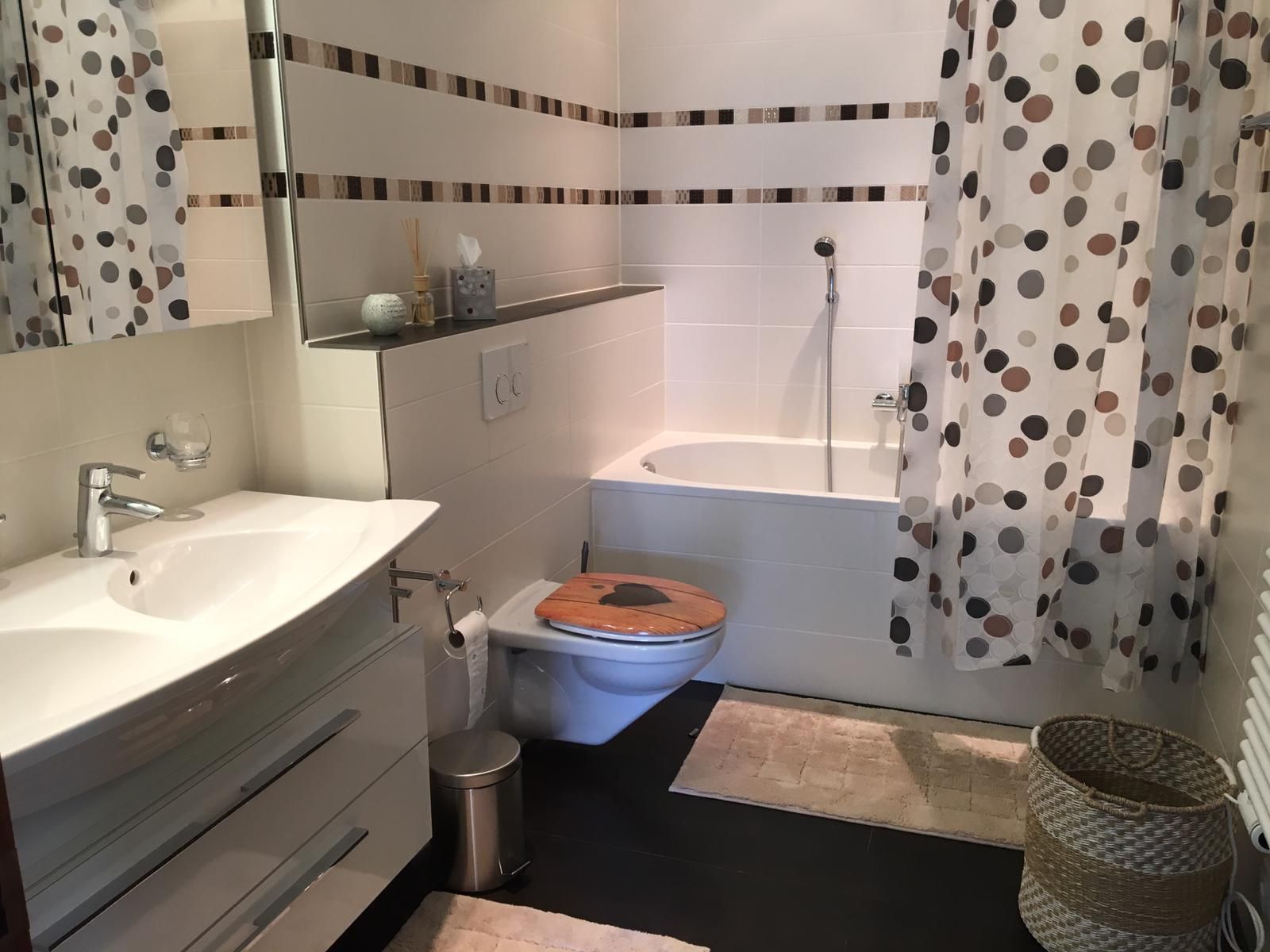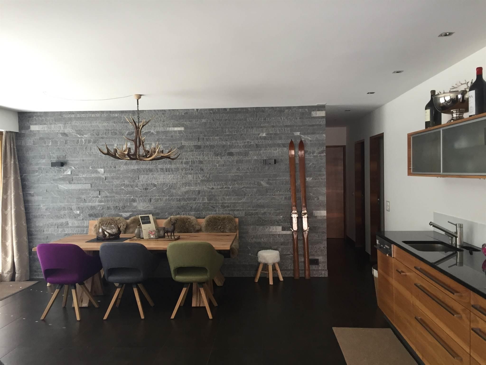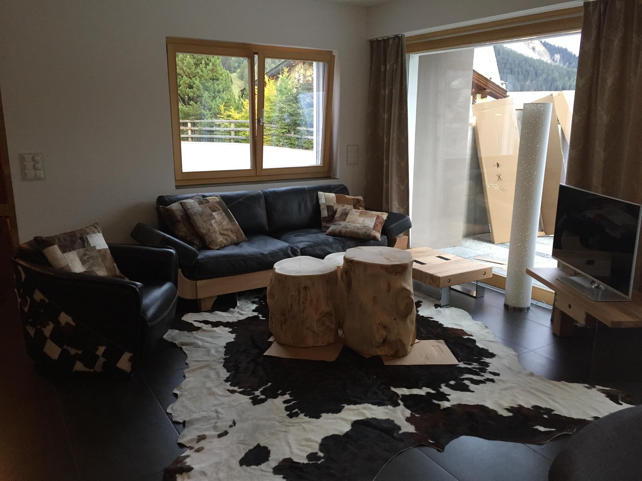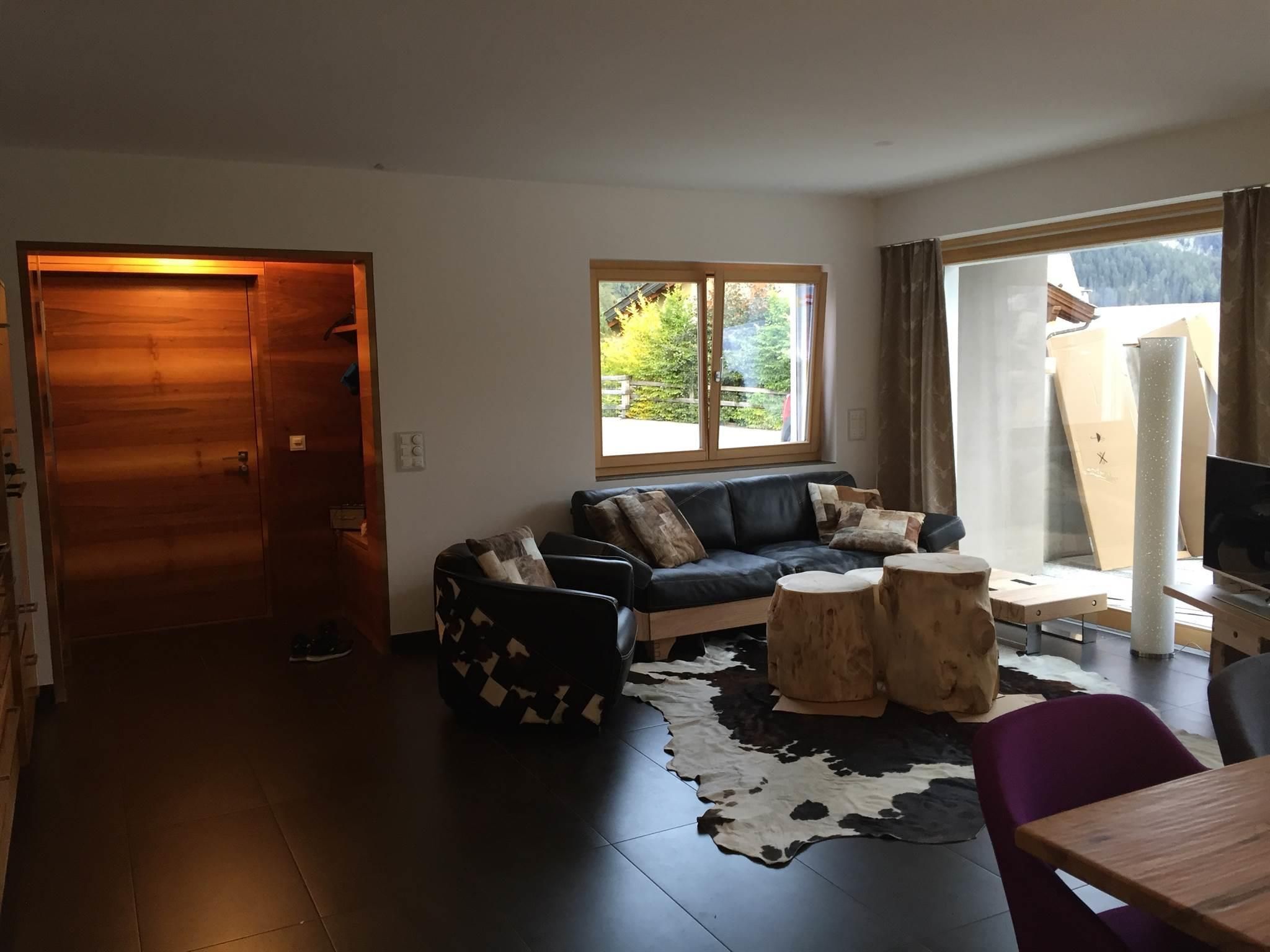 Neumöblierte Alpin Chic Wohnung mit moderner Wohnküche, Wohnzimmer mit Sofa, TV, Schlafzimmer, Kinderzimmer mit vier Betten, 2 Badezimmer mit Badewanne/WC, Terrasse, Garage mit Wirtschaftsraum