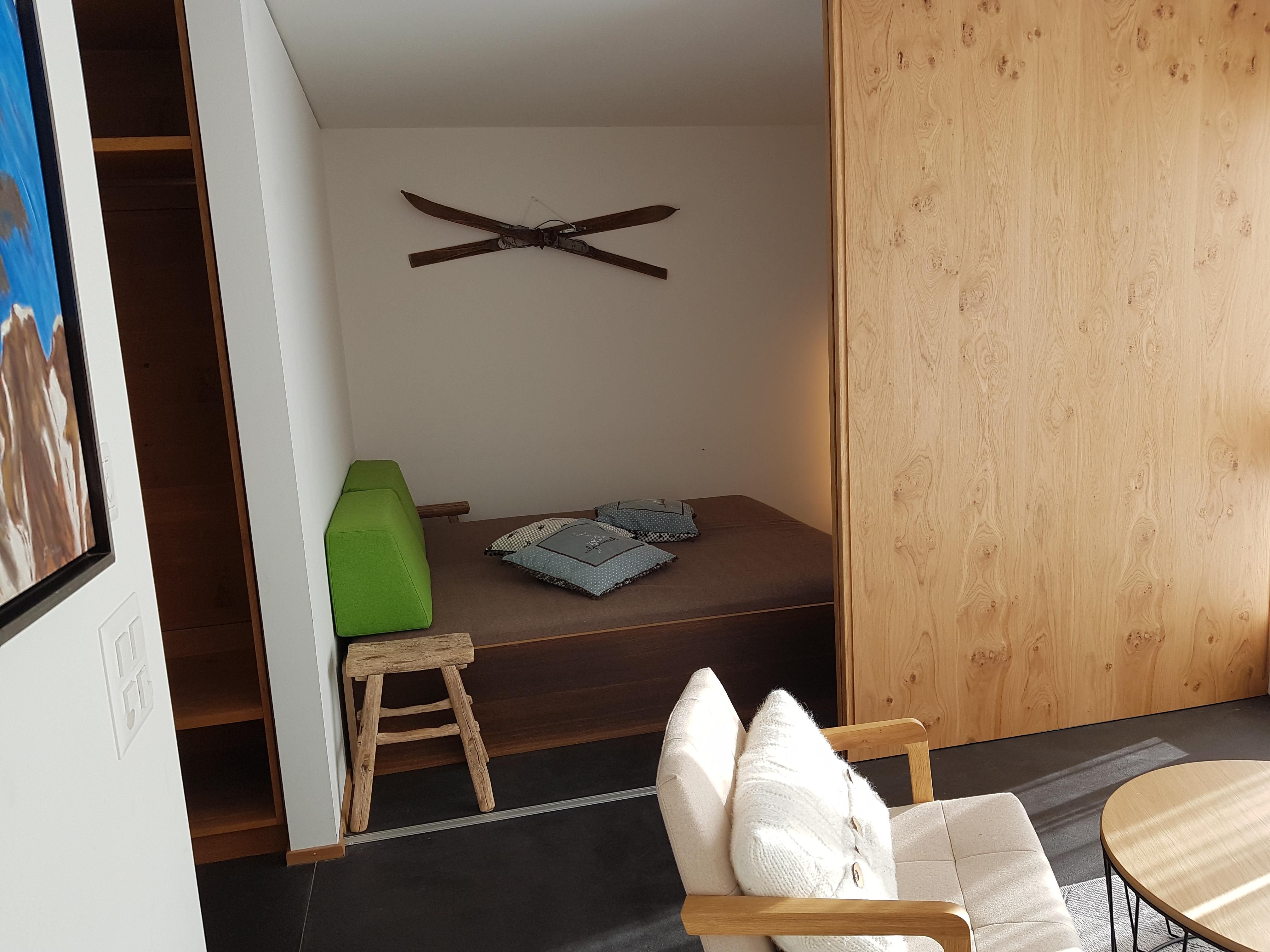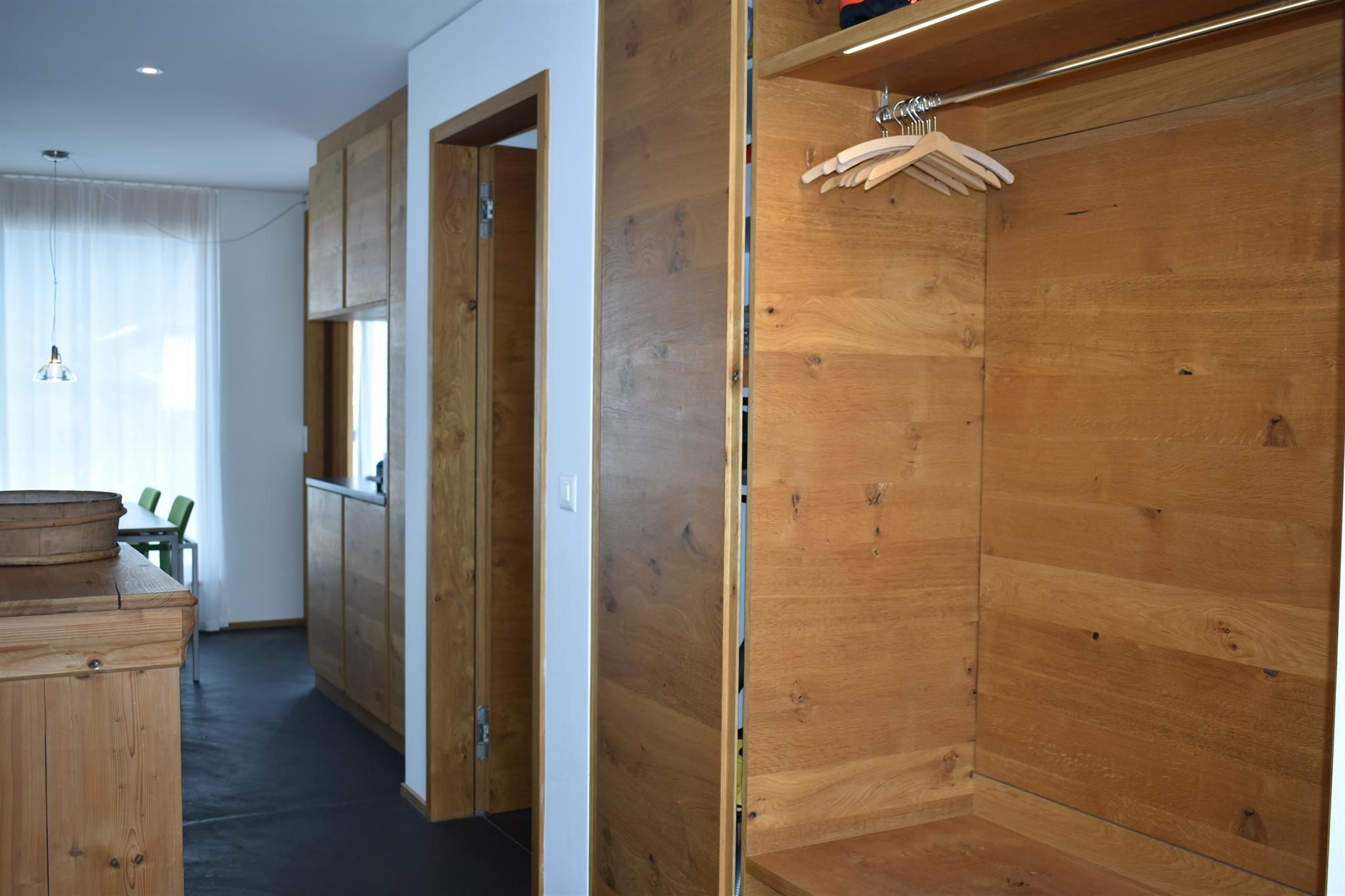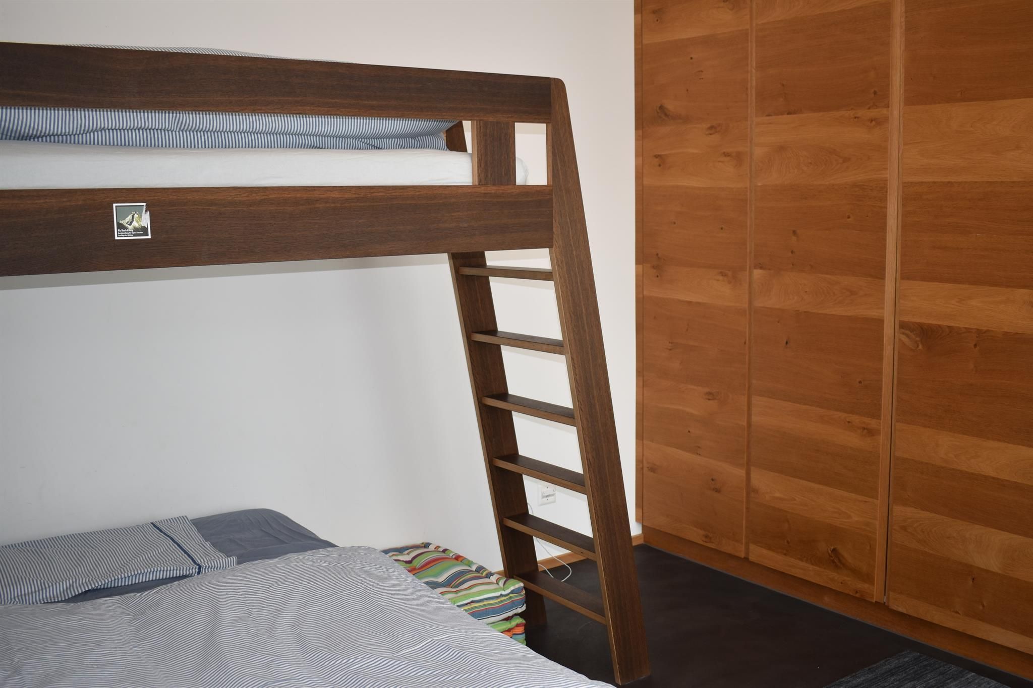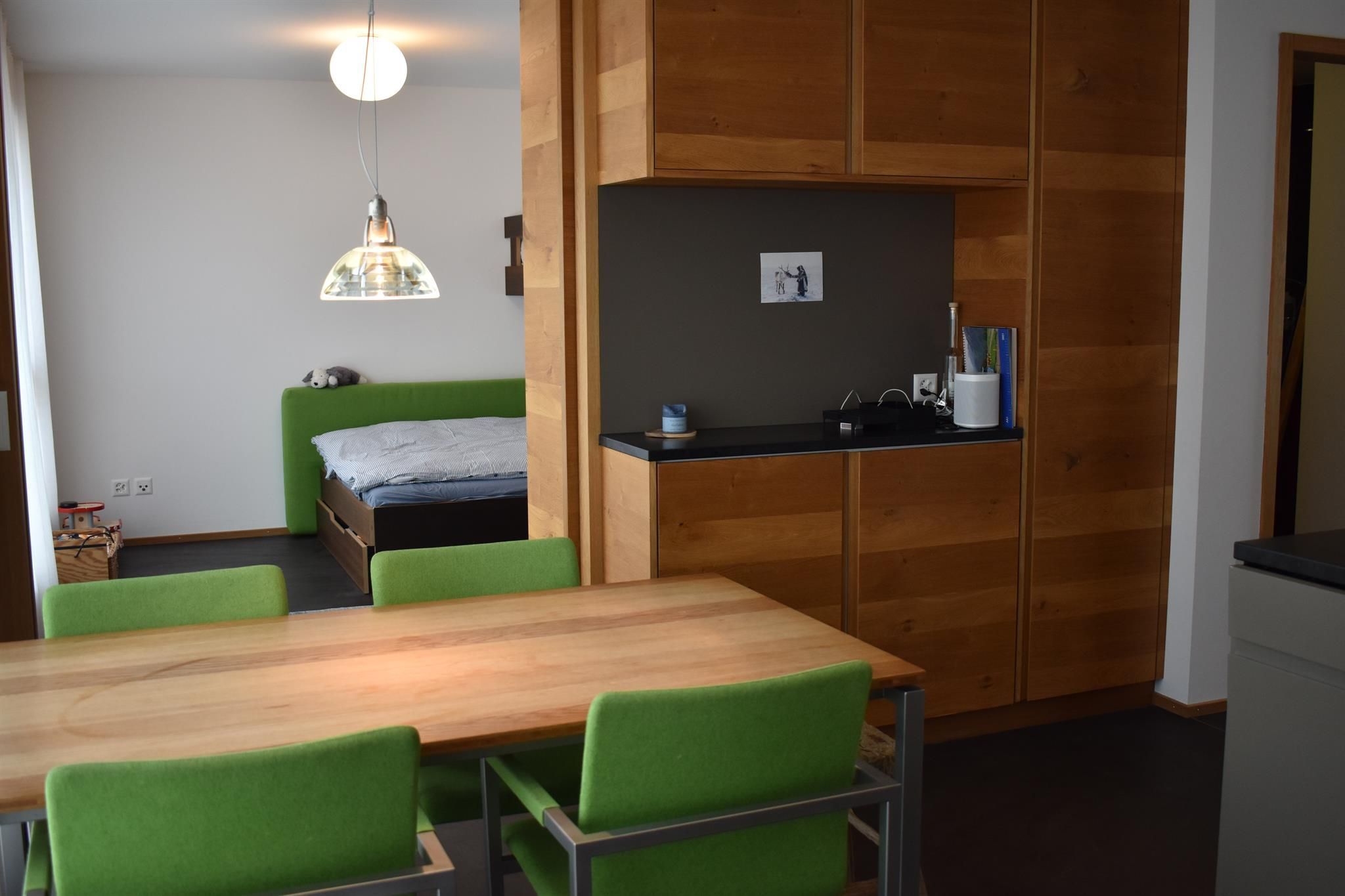 Eingang mit offener Garderobe, Putzschrank und Kommode, Wohnzimmer mit grossem Schlafsofa (180x200) und TV. Es gibt eine Holzwand die man nach Bedarf zuschieben kann, Ausgang zum Ostbalkon (von der Strasse abgewendet), Ostbalkon mit Tisch, Bank und 2 Stühlen, Küche mit Inductionsherd, Dampfabzug, CombiAir-Steamer, grossem Kühlschrank mit Gefrierfach, Geschirrspüler und Esstisch mit Stühlen / Schlafzimmer mit Doppelbett (140x200) und Einzel-Hochbett (90x190), Einbau-Kleiderschrank, Dusche/WC/Doppellavabo.