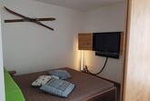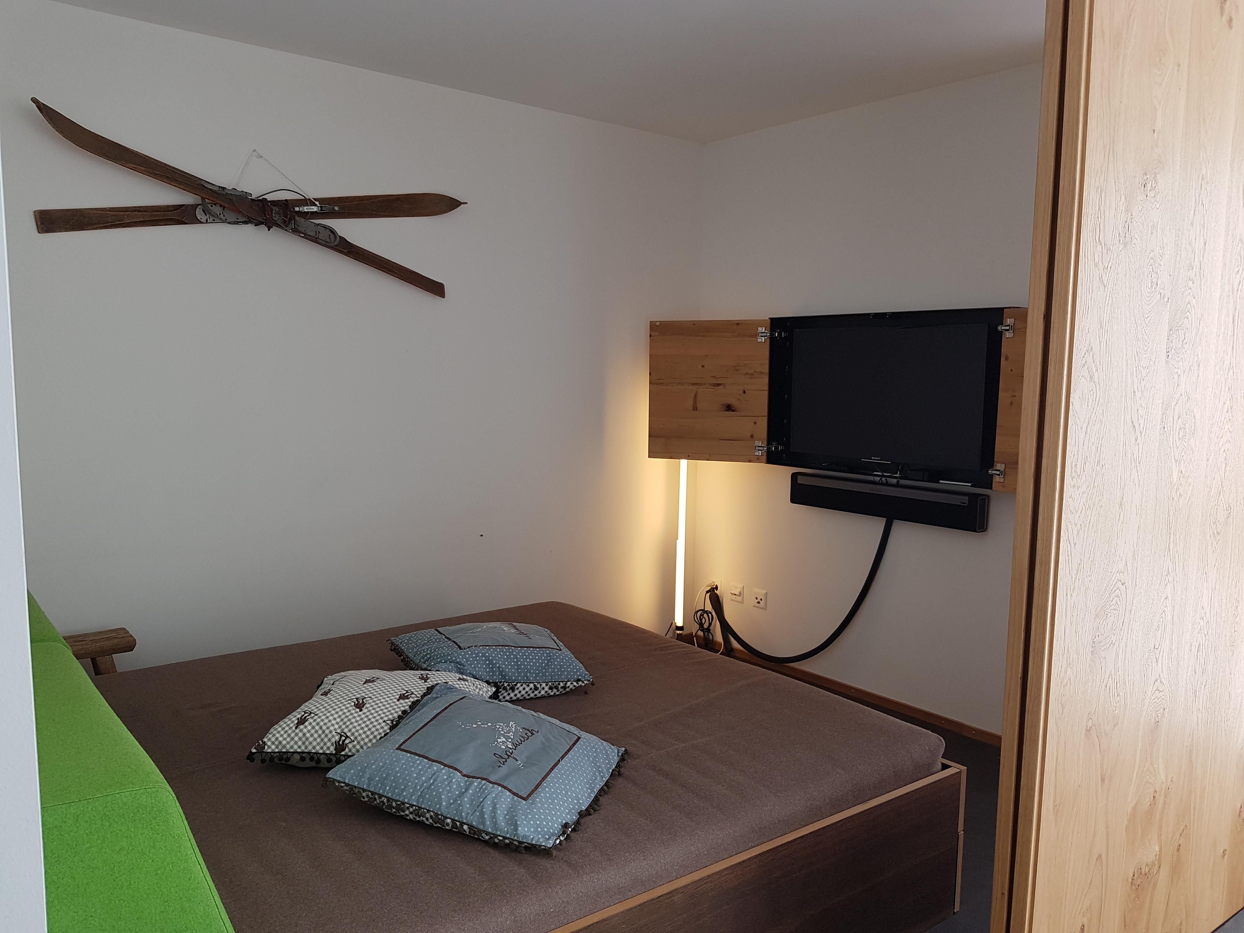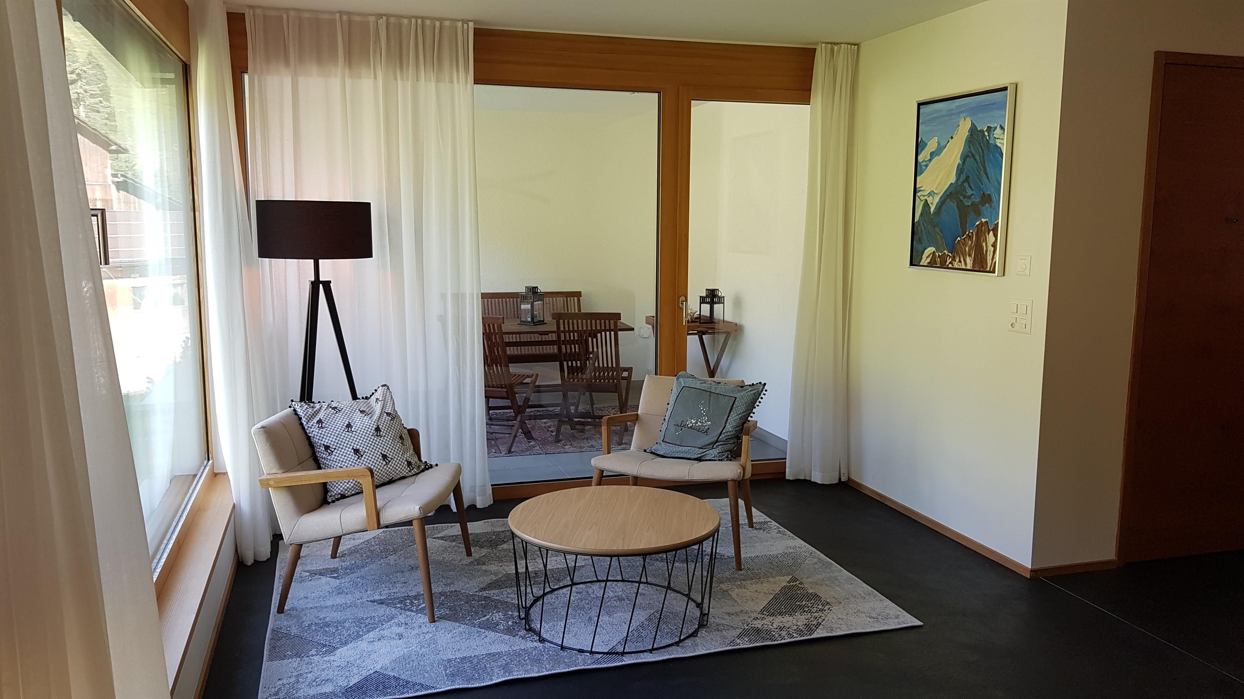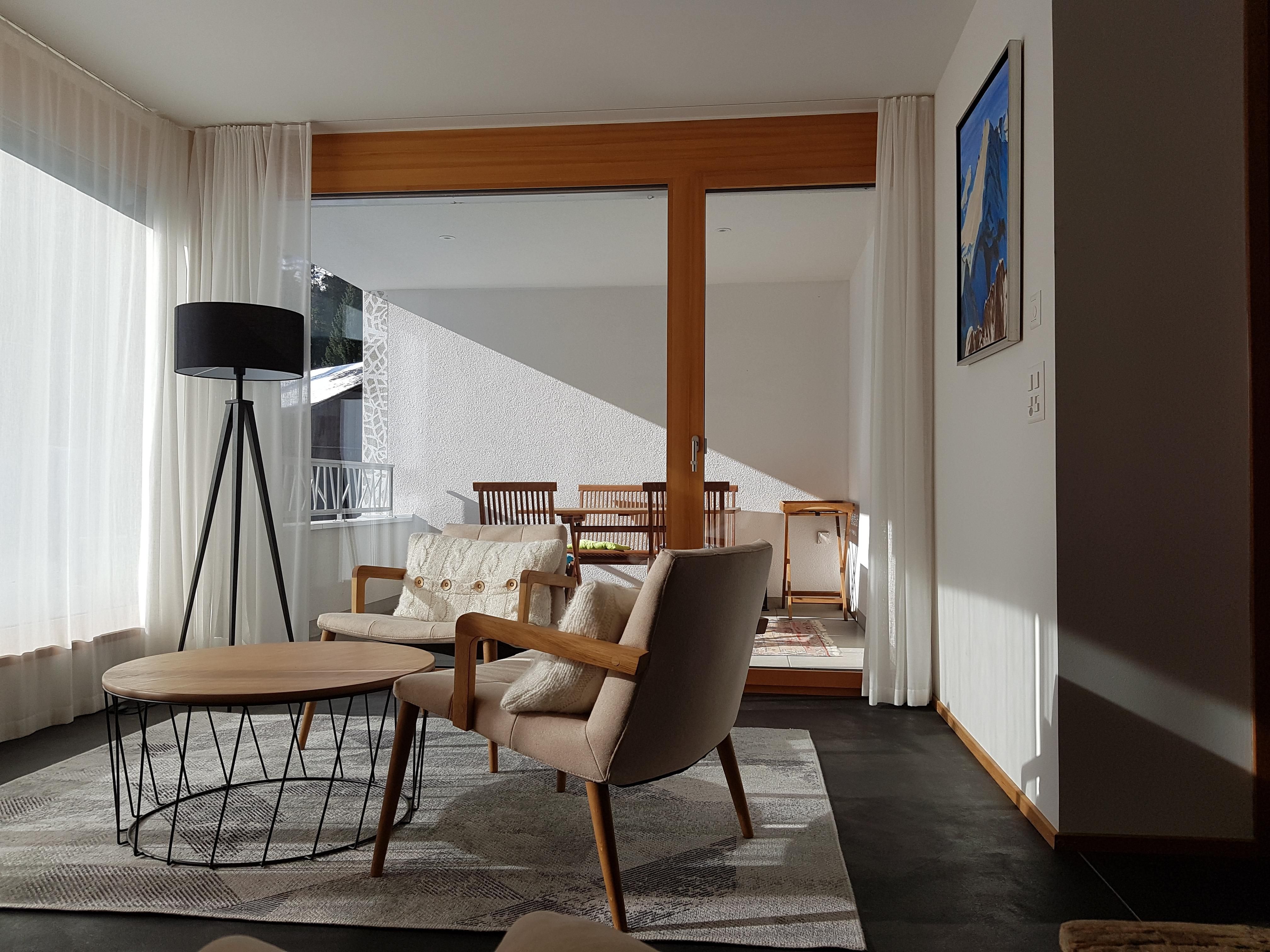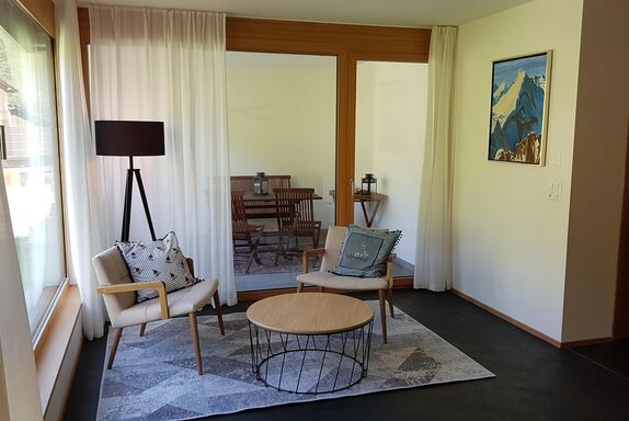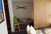 Eingang mit offener Garderobe, Putzschrank und Kommode, Wohnzimmer mit grossem Schlafsofa (180x200) und TV. Es gibt eine Holzwand die man nach Bedarf zuschieben kann, Ausgang zum Ostbalkon (von der Strasse abgewendet), Ostbalkon mit Tisch, Bank und 2 Stühlen, Küche mit Inductionsherd, Dampfabzug, CombiAir-Steamer, grossem Kühlschrank mit Gefrierfach, Geschirrspüler und Esstisch mit Stühlen / Schlafzimmer mit Doppelbett (140x200) und Einzel-Hochbett (90x190), Einbau-Kleiderschrank, Dusche/WC/Doppellavabo.