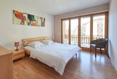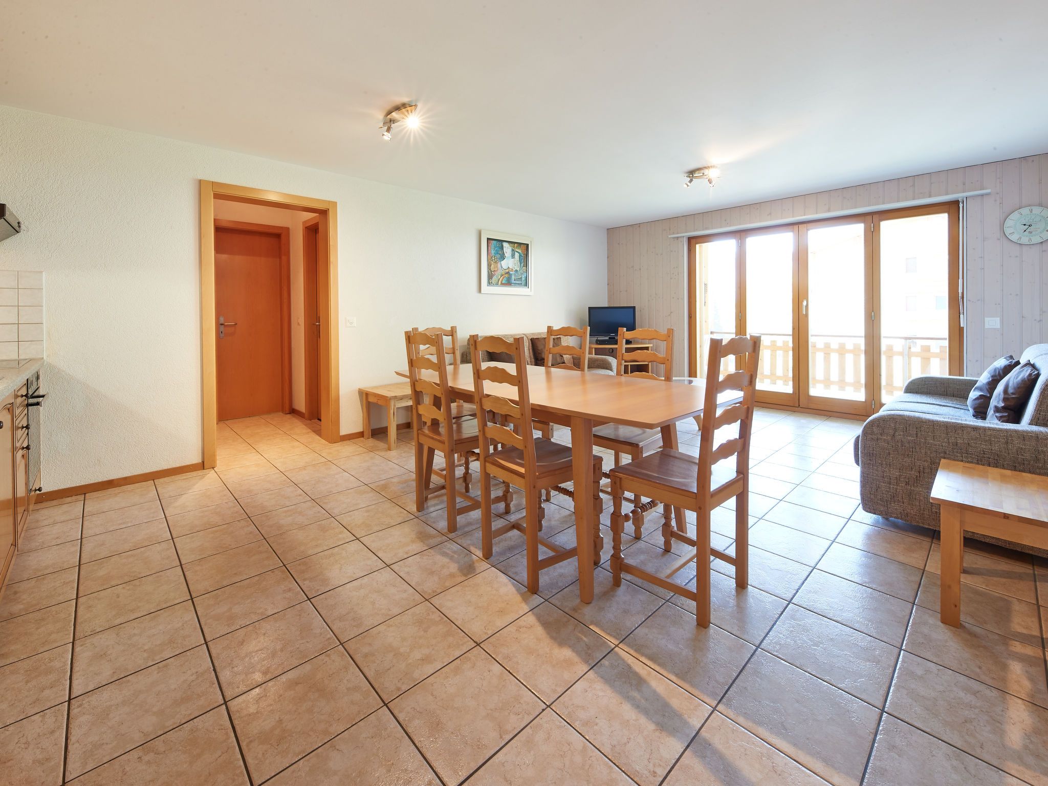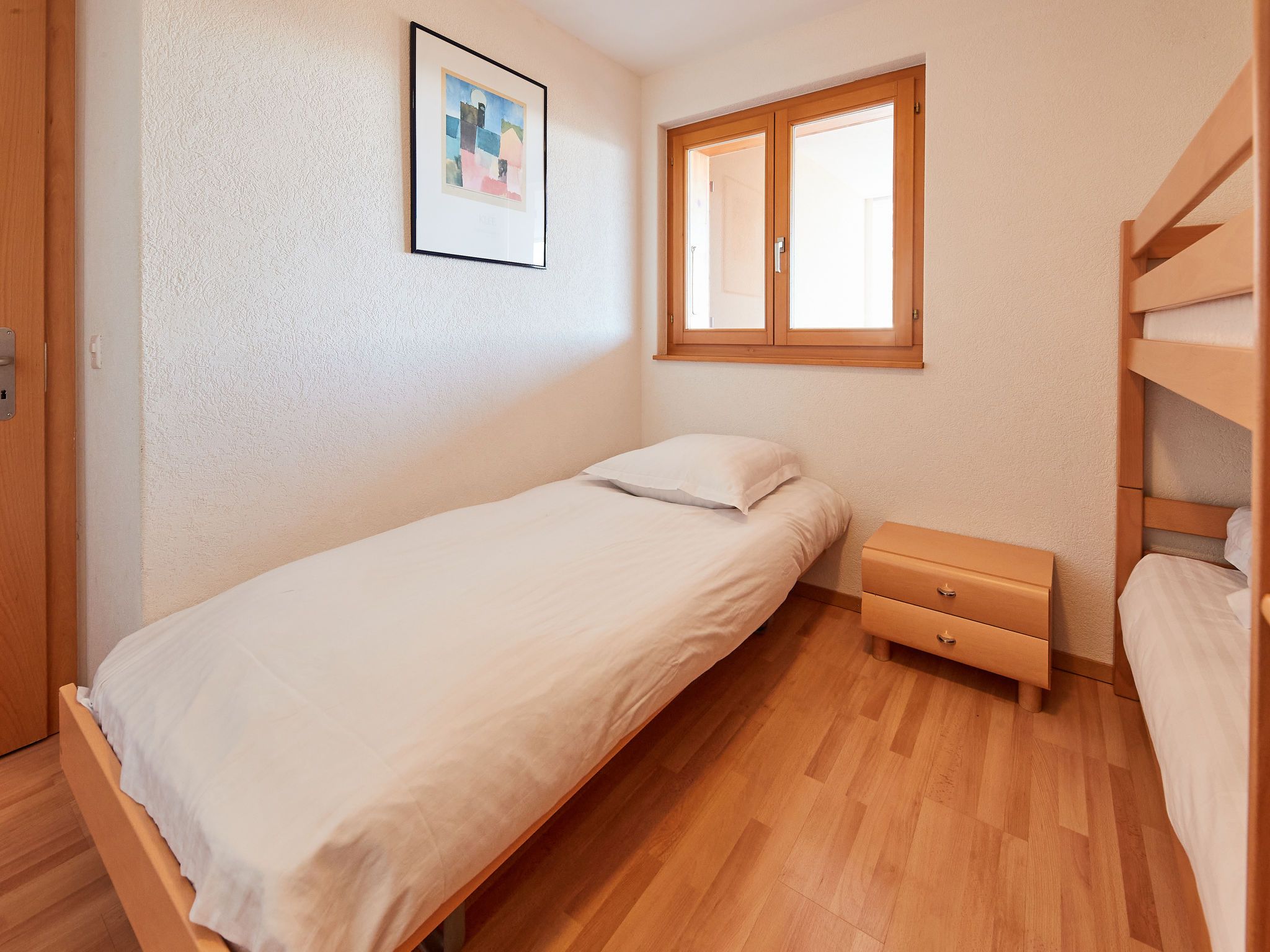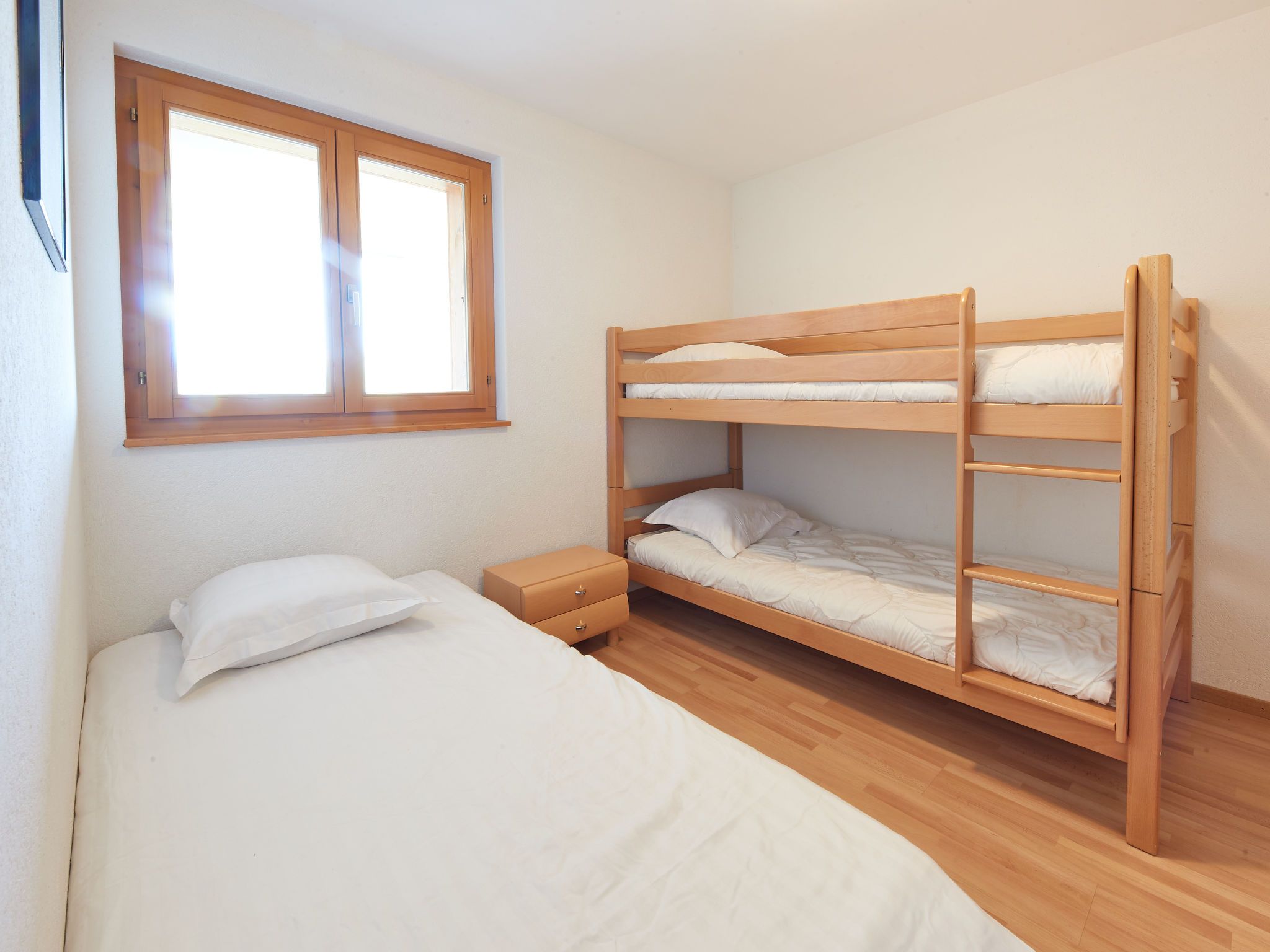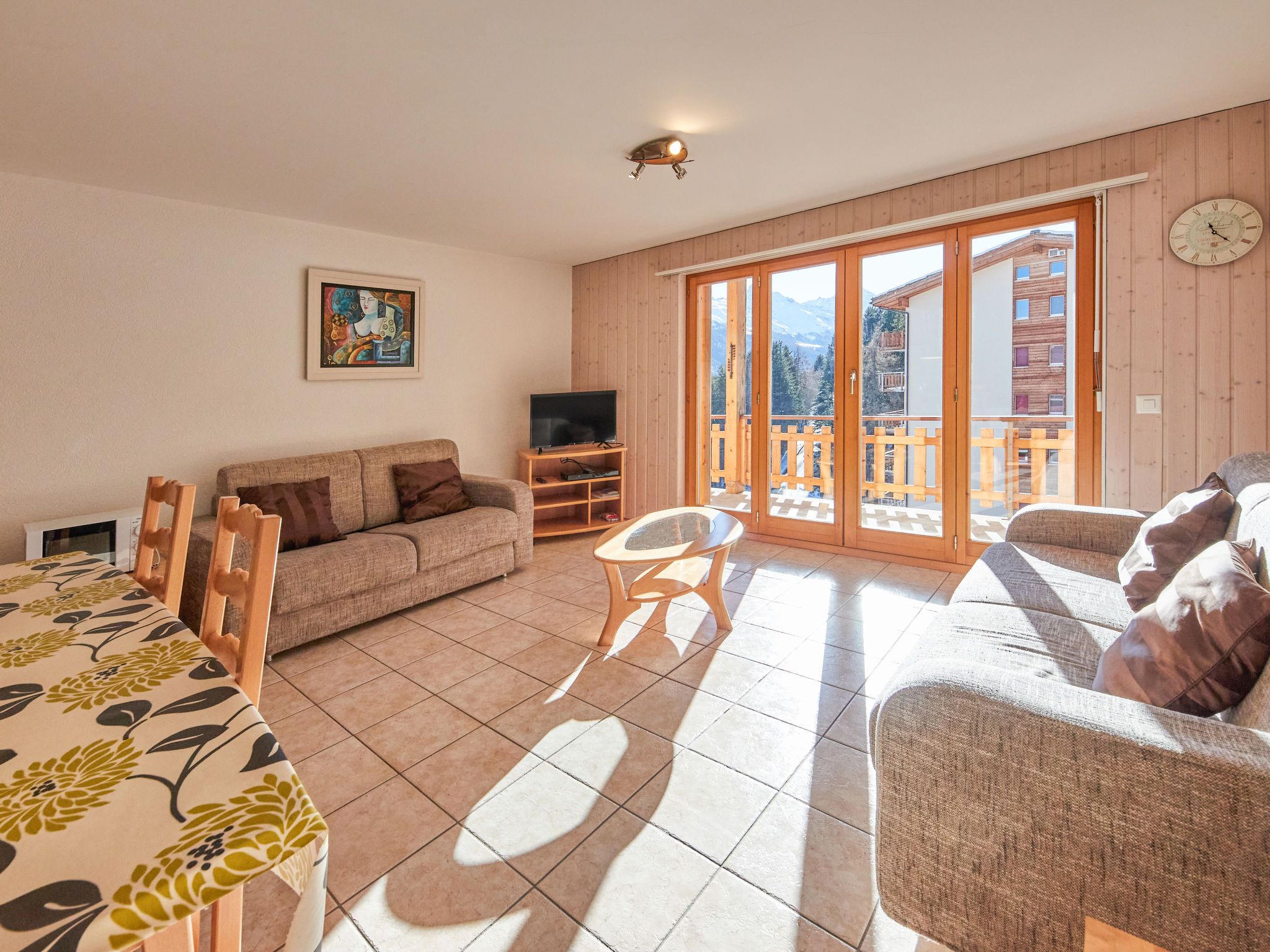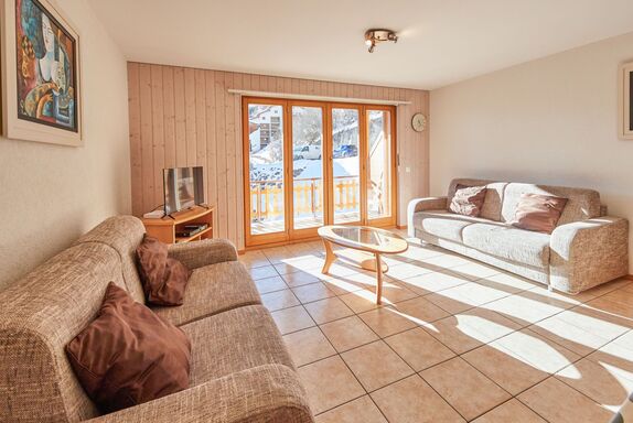 Sérandes 18, 3-Zimmer-Wohnung 70 m2, unteres Geschoss. Komfortabel und gemütlich eingerichtet: Wohn-/Esszimmer mit 1 Diwanbett (140 cm, Länge 190 cm), TV. Ausgang zum Balkon, Richtung Süden. 1 Zimmer mit 1 Doppelbett (160 cm, Länge 200 cm). 1 Zimmer mit 1 Bett (90 cm, Länge 190 cm), 1 x 2 Etagenbetten (90 cm, Länge 190 cm). Offene Küche (Backofen, 4 Glaskeramikplatten, Toaster, Wasserkocher, Mikrowelle, elektrische Kaffeemaschine, Kapseln für die Kaffeemaschine (Filtre), Fondue Set (Käse)). 2 Duschen/WC. Balkon, Südlage. Balkonmöbel. Zur Verfügung: Internet (Wireless LAN). Bitte beachten: Nichtraucher-Unterkunft.