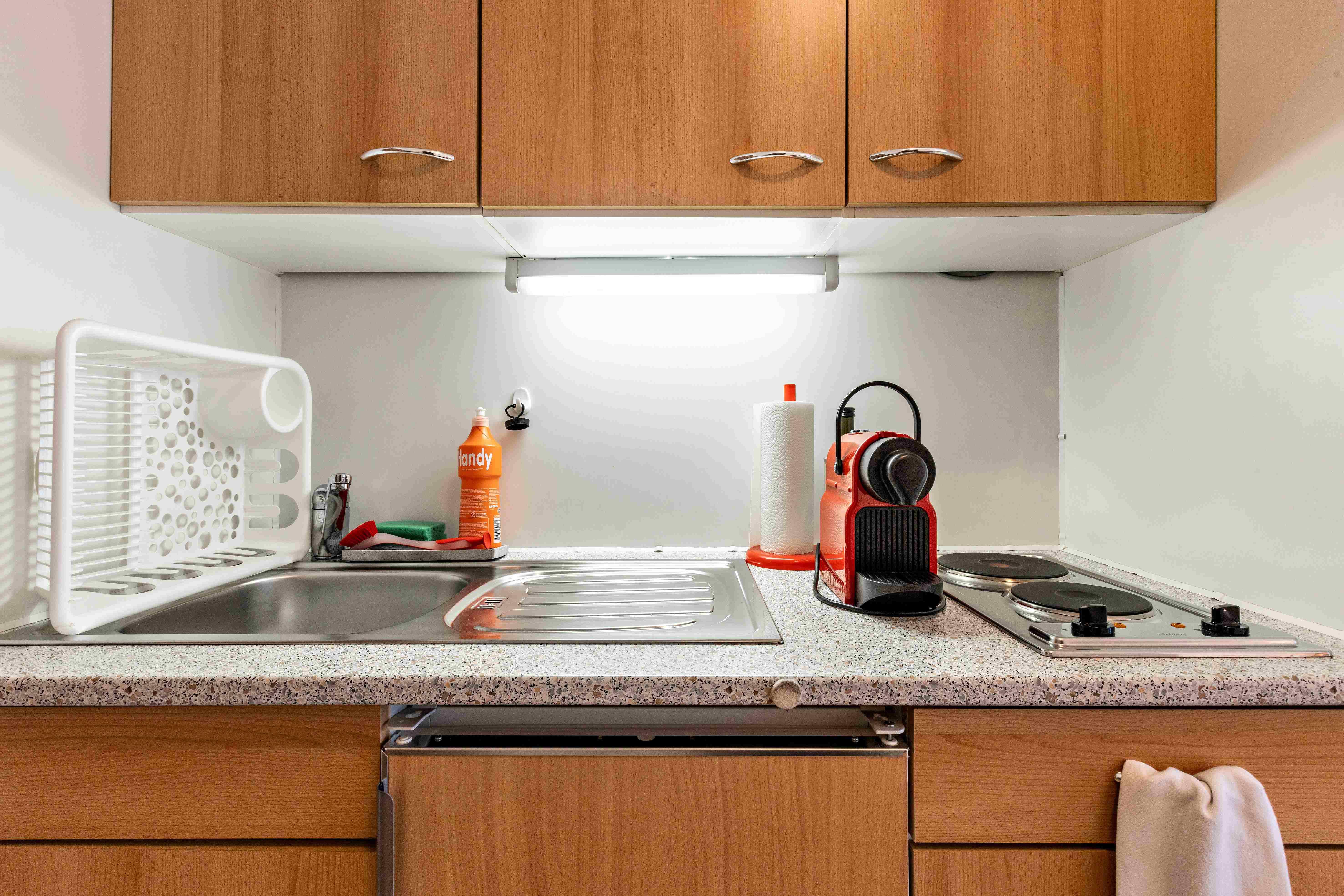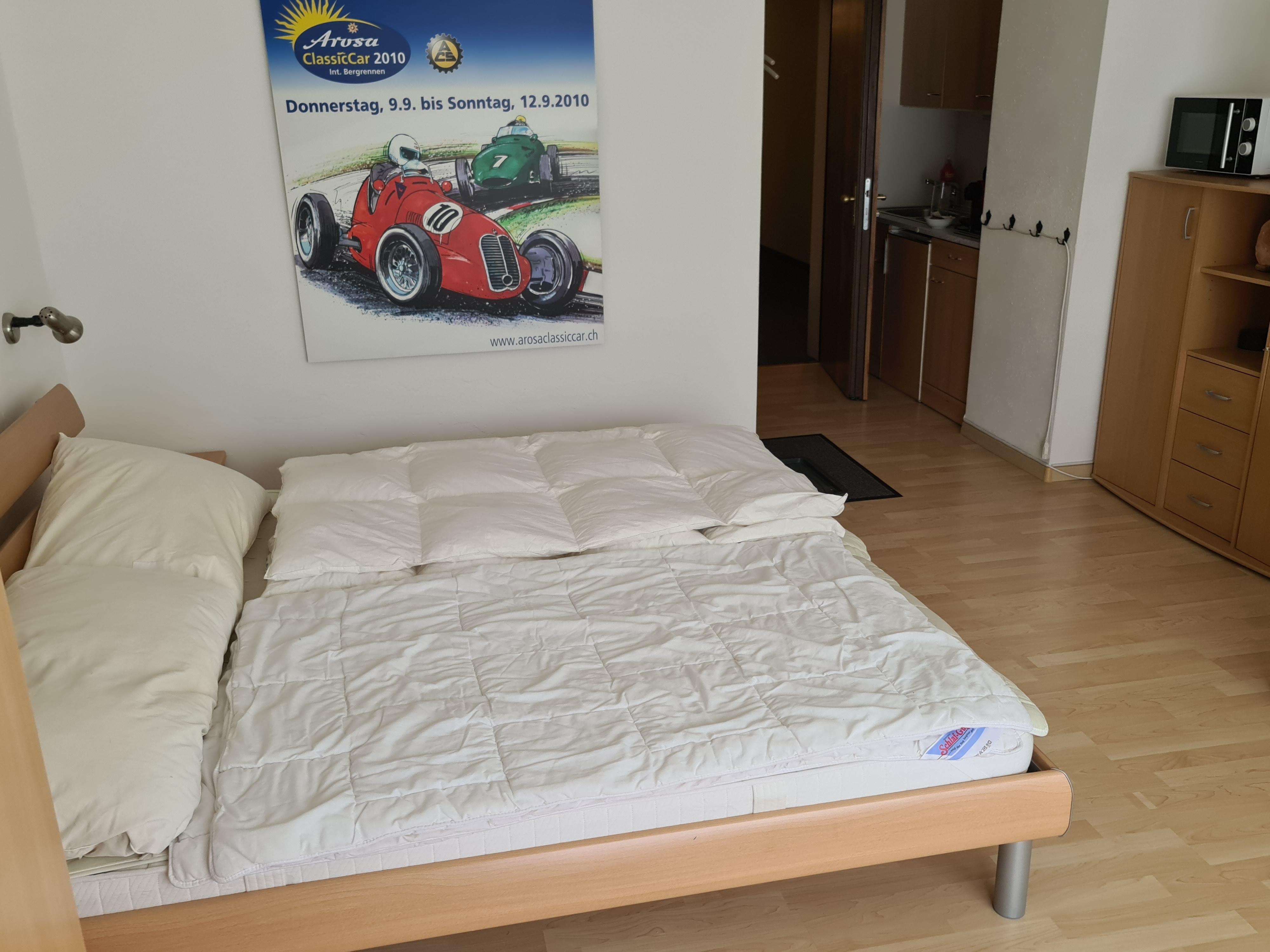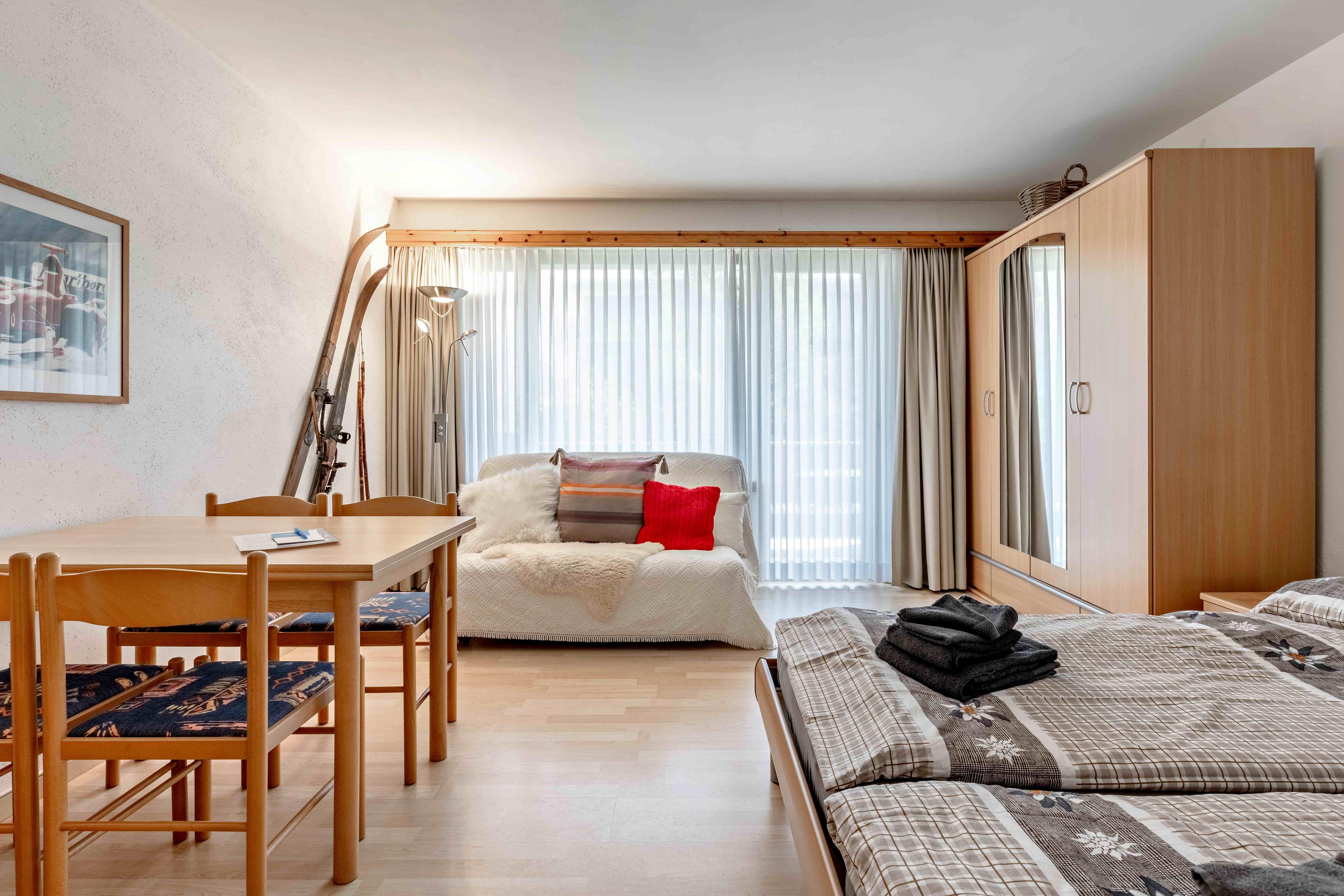Das 1. Zimmer Apartment Derby 26A verfügt über ein Doppelbett und ein Schlafsofa, welches als Bett genutzt werden kann.