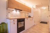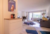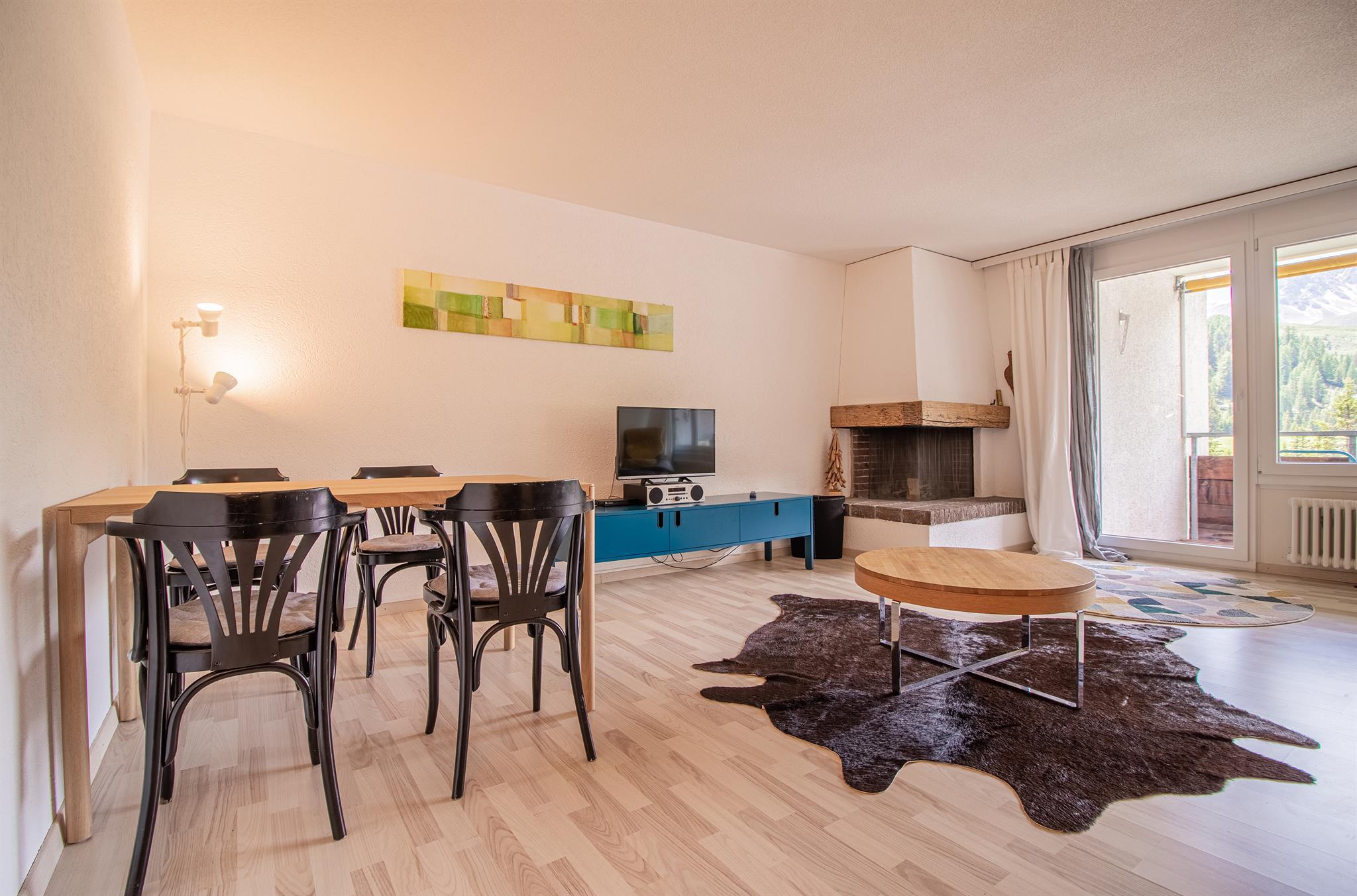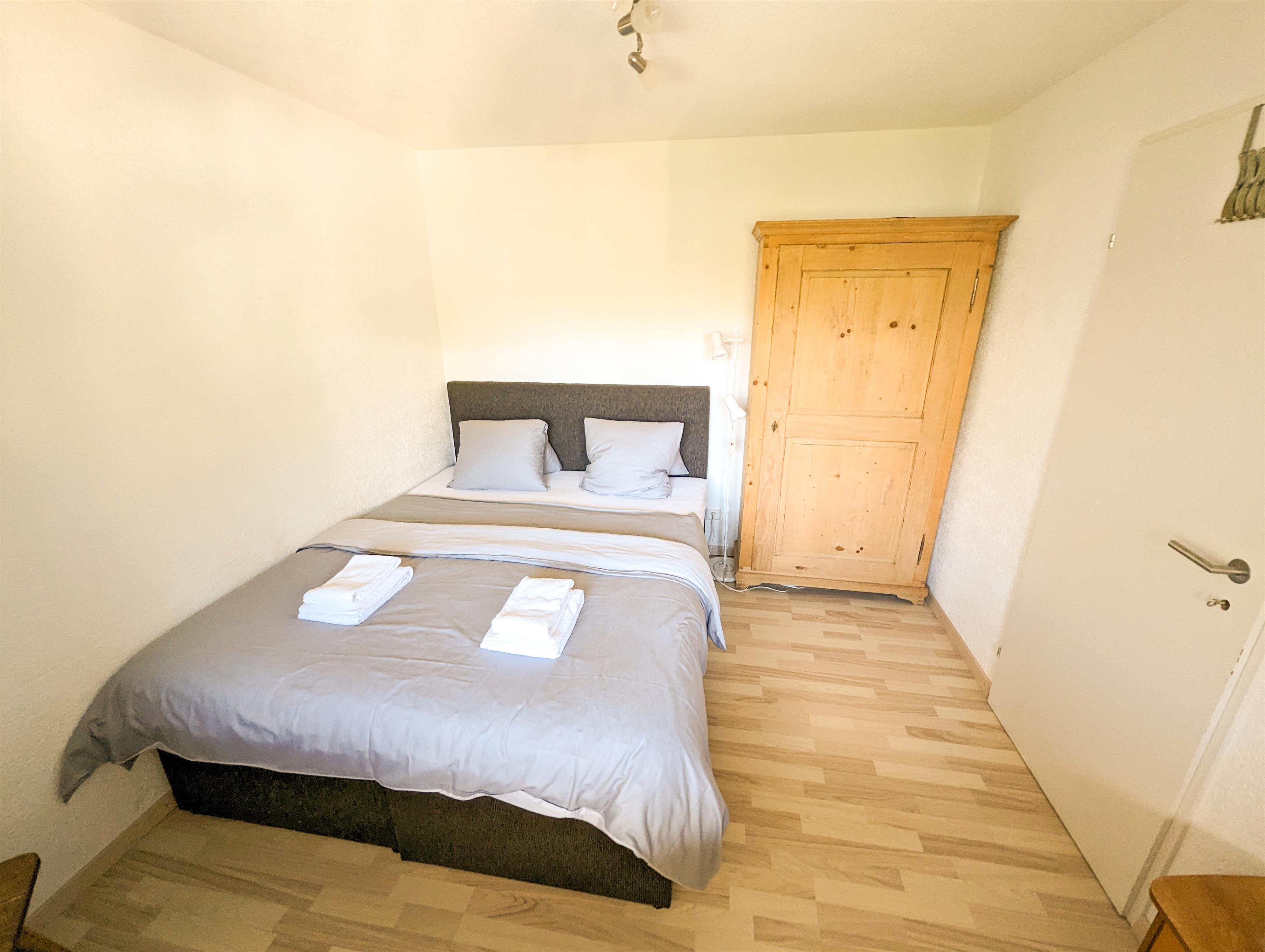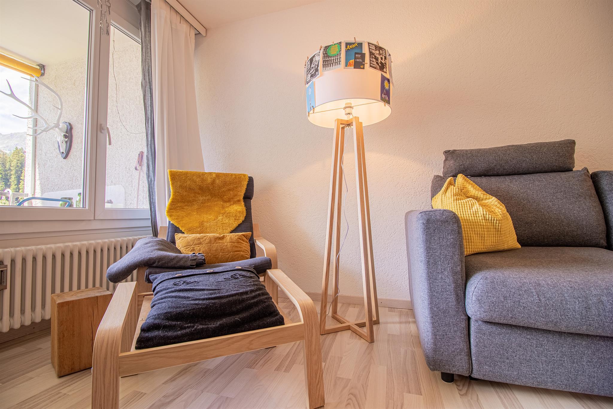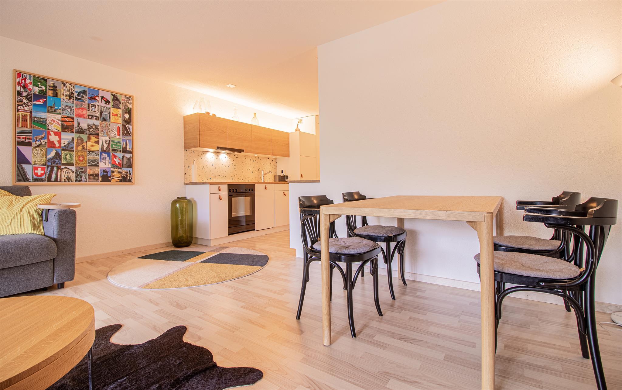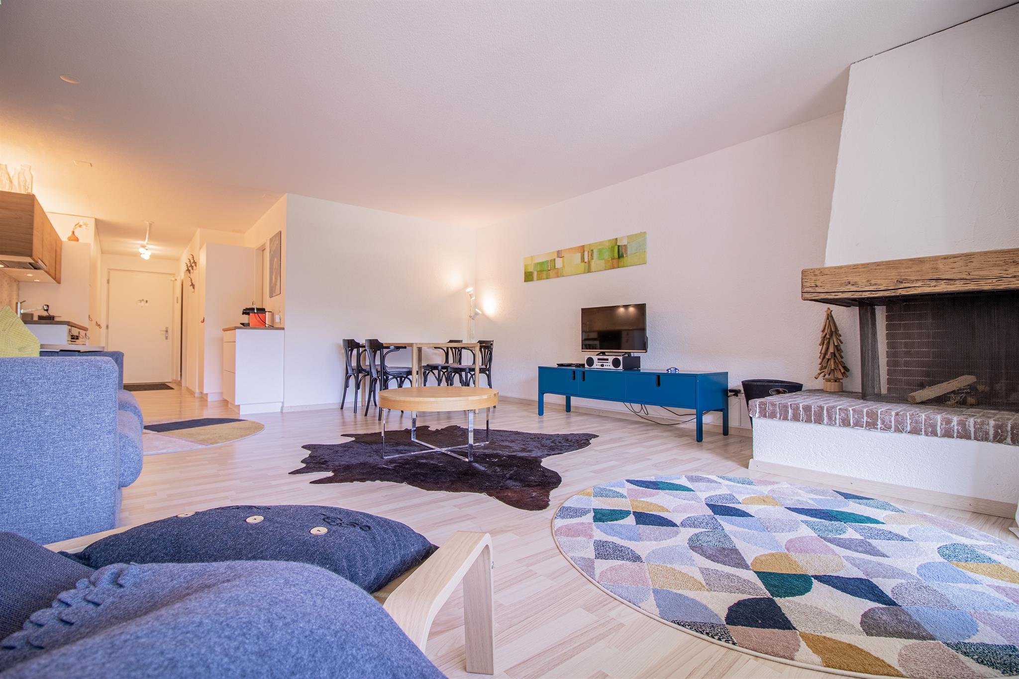 Im grosszügigen Wohnzimmer ist ein Esstisch für vier Personen, eine Sitzgruppe, ein Fernseher mit Radio und CD/DVD-Player, WLAN und Telefon. Die Küche ist mit dem üblichem Komfort ausgestattet: Kochherd mit Backofen, Geschirrspüler, Kühlschrank, Fondue- und Raclette-Geschirr. Zwei Betten und ein Kleiderschrank stehen im Schlafzimmer, zwei Schrankbetten im Wohnzimmer. Das Badezimmer ist mit einer Duschkabine, Dusch-Toilette und einem Lavabo ausgestattet. Zur Wohnung gehört ein Autoabstellplatz in der Tiefgarage.