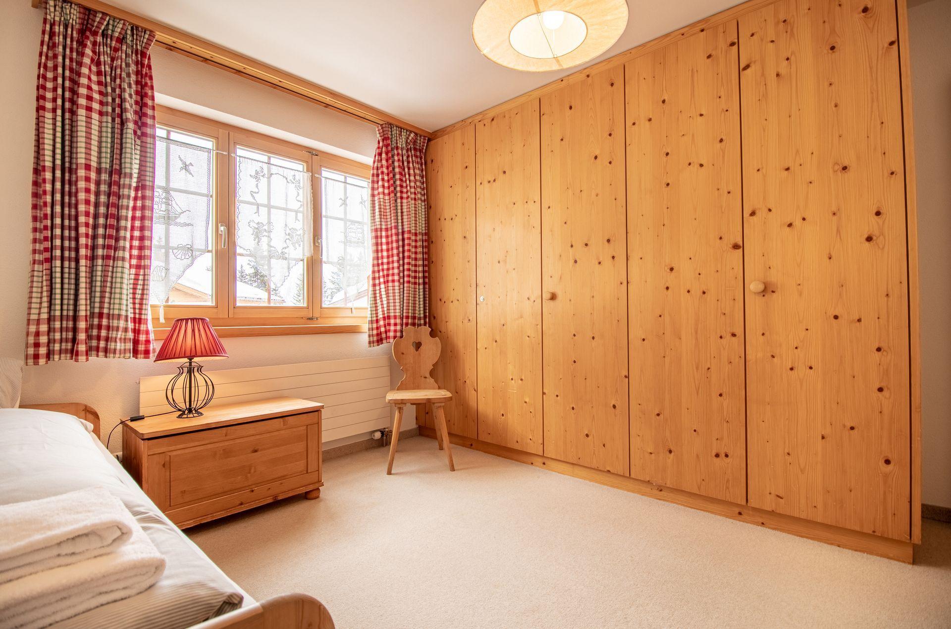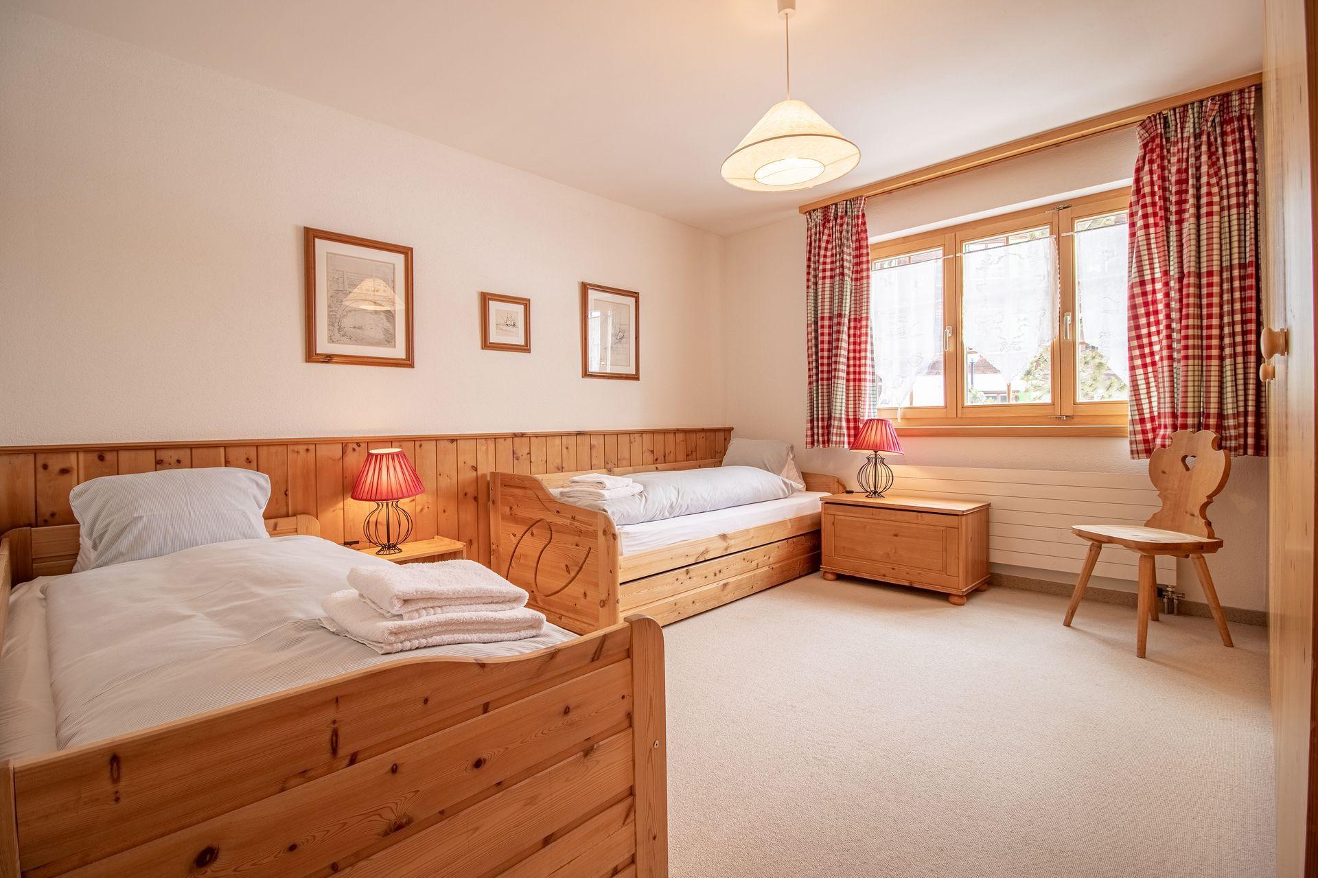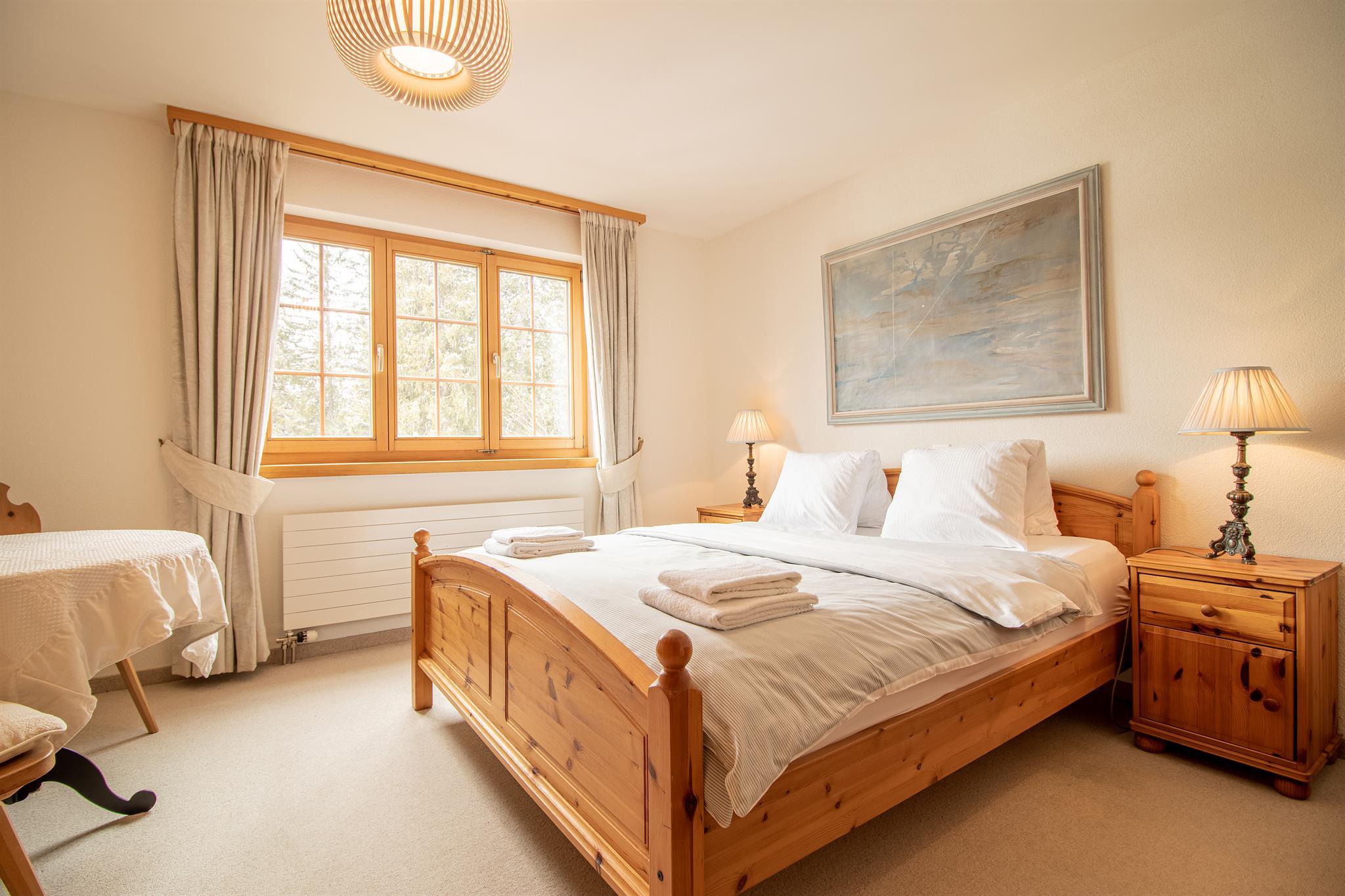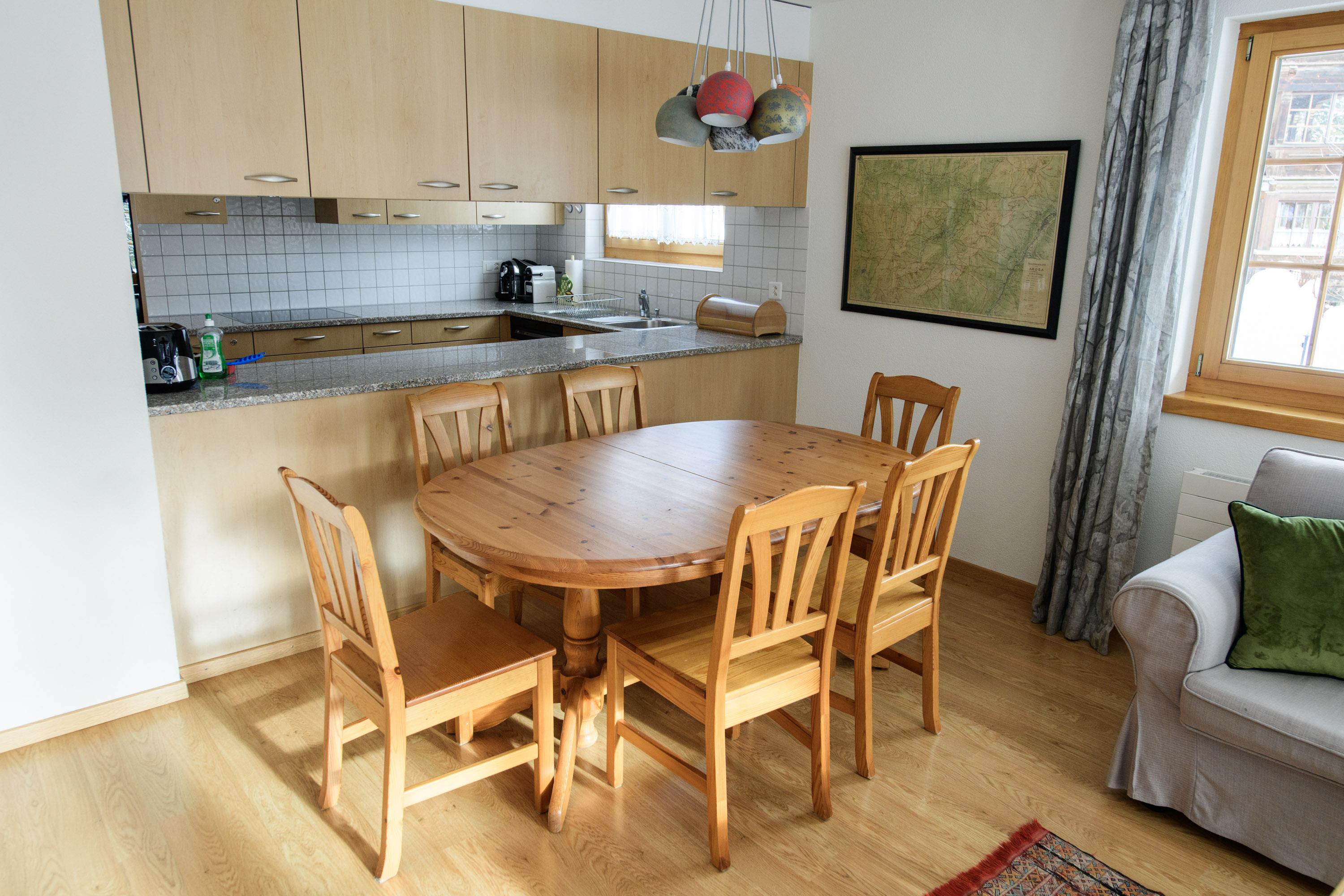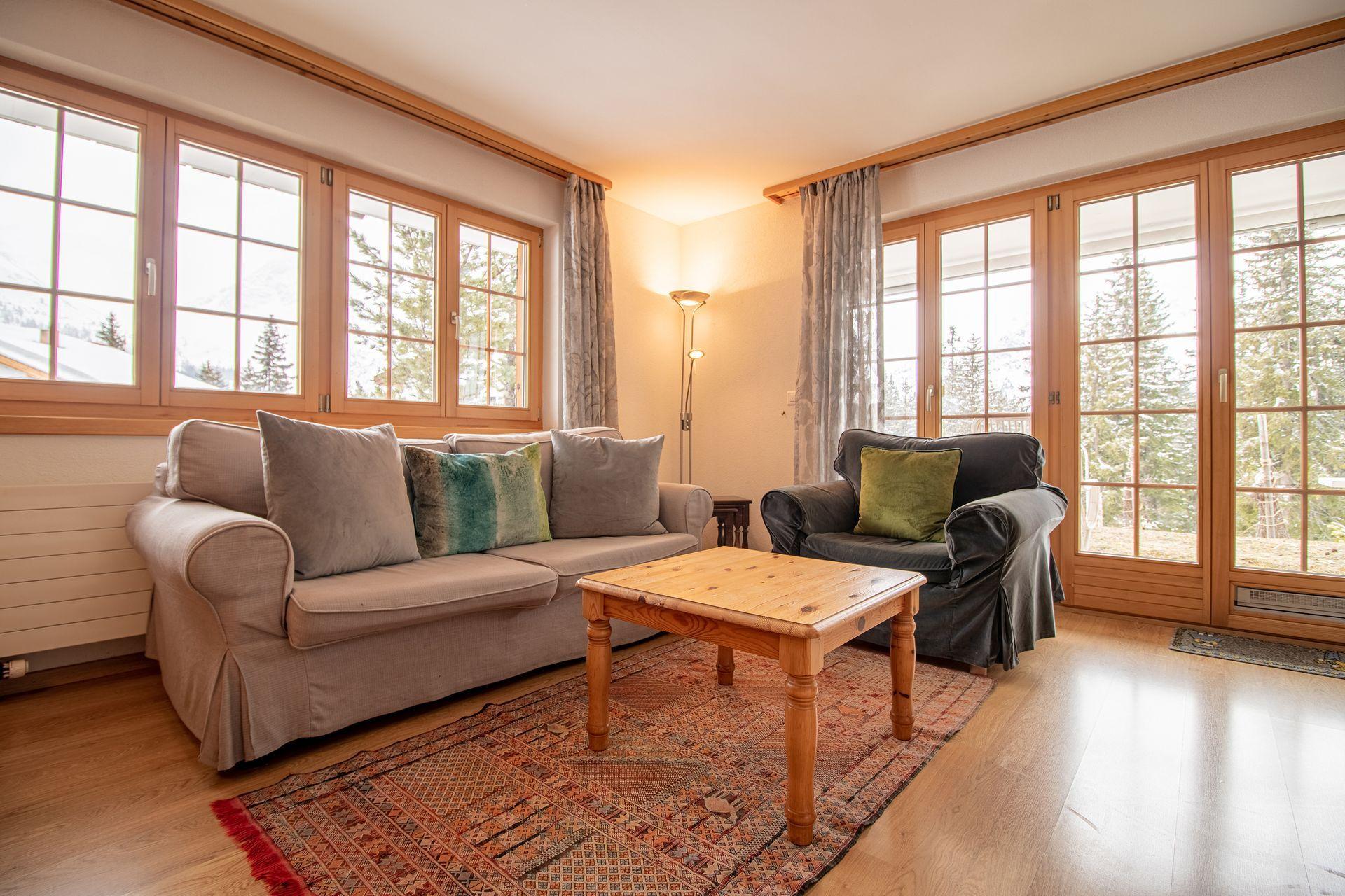 Neumöbilierte Wohnung mit schöner Wohnküche, im Wohnzimmer befindet sich ein Bettsofa als zusätzliche Schlafmöglichkeit. Cheminée mit Grillrost. Gemütlich eingerichteter Wohnbereich mit Parkett, TV, Radio, Telefon. Die Küche ist gegen den Essbereich offen. Ein Schlafzimmer mit Doppelbett und Bad, 1 Zimmer mit zwei zusammenstellbaren Einzelbetten, Dusche/WC,