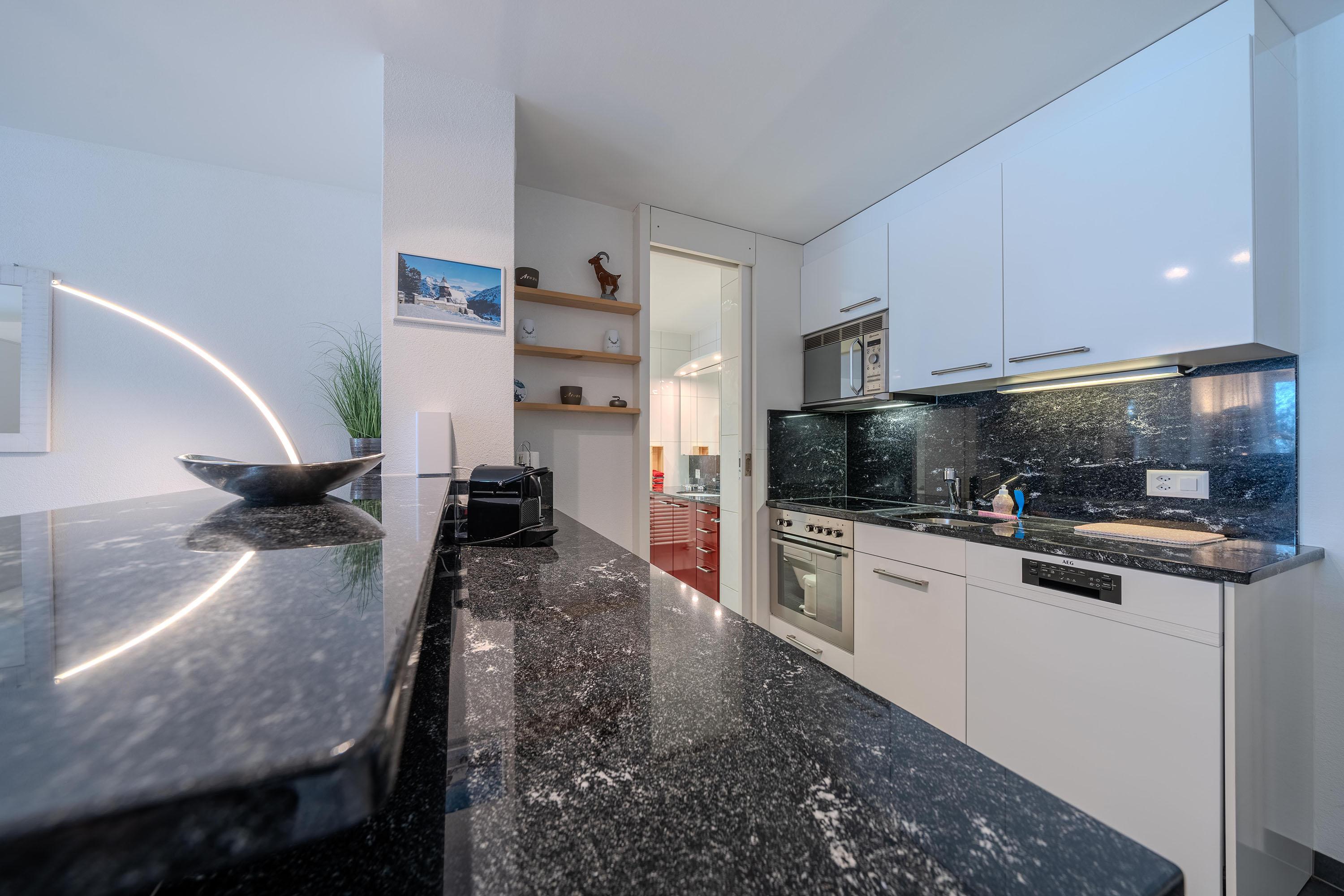 In der offenen Küche fehlt es an nichts. Sie verfügt über einen Geschirrspüler, Backofen, Nespresso-Kaffeemaschine, Mixer, Raclette-Ofen, Fondue-Caquelon