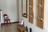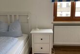 Im Obergeschoss finden sich ein großes Schlafzimmer mit Doppelbett und zusätzlichem Schlafsessel und ein viertüriger Kleiderschrank. Das Zimmer öffnet sich zu einem landesüblichen Balkon mit Holzstühlen. Ein zweites kleines Schlafzimmer ist ausgestattet mit einem Einzelbett mit Stauraum und einer kleiner Kommode. Hier besteht auf Wunsch die Möglichkeit, ein zusätzliches Kinderbett oder Reisebett zuzustellen.