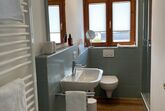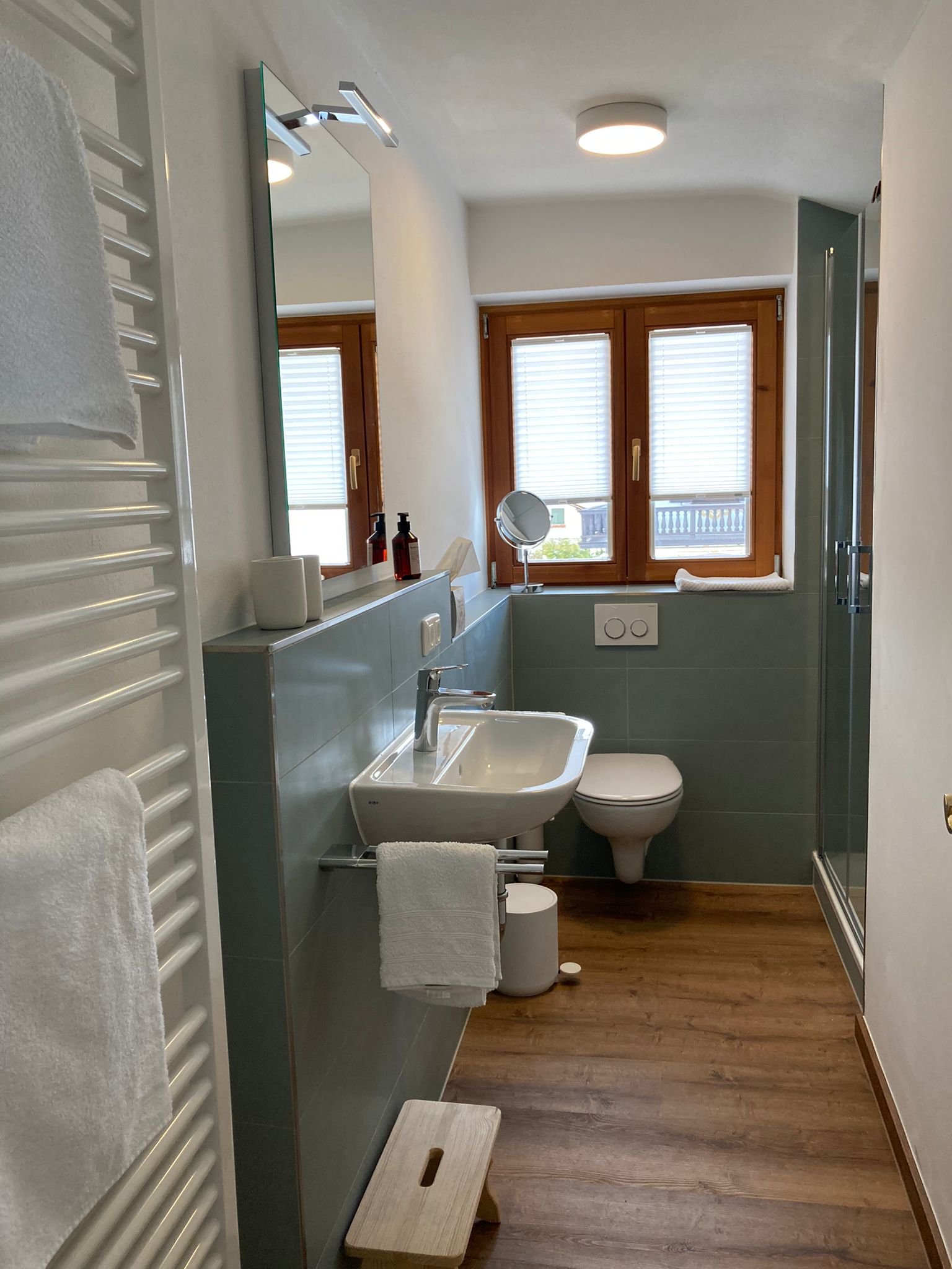 Das liebevoll durchdachte Badezimmermit Fenster und WC, ebenfalls im Obergeschoss, ist frisch saniert. Es besitzt eine bodennahe große Dusche, ein Einzelwaschbecken sowie eine Handtuchheizung und ein Haartrockner. Damit es auch unseren kleinsten Gästen an nichts fehlt, stellen wir einen Tritthocker sowie einen Baby-Toilettenaufsatz bereit.