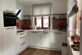 Die neue voll ausgestattete Küche verfügt über ein 4-Zonen-Induktion-Ceranfeld sowie einen Kühlschrank mit Gefrierfach.Außerdem befinden sich in der Küche ein Geschirrspüler, eine Dunstabzugshaube und ein Backofen in Augenhöhe. Alle notwendigen Küchengeräte sind vorhanden wie z.B. Kaffeemaschine, Thermoskanne, Wasserkocher, Toaster, Töpfe, Pfannen und Mixer. Für die kleinen Gäste steht auf Anfrage ein Kinderhochstuhl bereit.