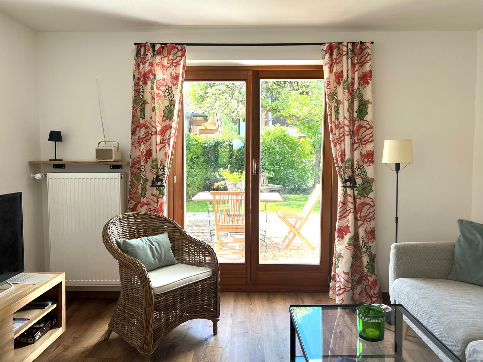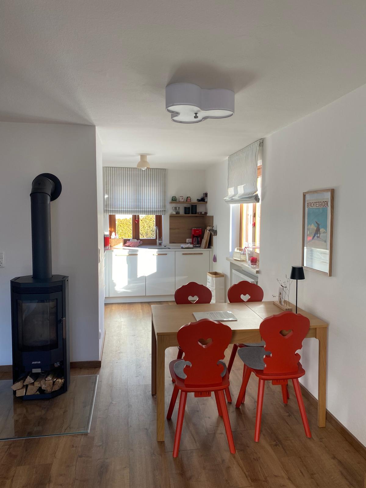 Die Ferienwohnung erstreckt sich über zwei Etagen und großzügige 67 m². Sie wurde im Jahr 2023 komplett renoviert und liebevoll neu eingerichtet. Per kostenlosem WLAN haben Sie in der gesamtem Wohnung Internetzugang. Die Wohnung verfügt über einen separaten Hauseingang. Im Erdgeschoss gelangt man über den Eingangsbereich mit Garderobe und Ablagemöglichkeiten und separatem WC in das Wohn-Esszimmer mit großer Küche. Dieser Bereich ist ausgestattet mit einer bequemen Couch, Korbsessel, Couchtisch, Sideboard mit großem Smart-TV, einem ausziehbaren Esstisch mit Chiemseestühlen und einem hübschen Kaminofen. Hier lassen sich insbesondere im Winter gemütliche Stunden verbringen. Durch eine Doppelglastür gelangt man auf die großzügige Terrasse mit Gartenmöbeln ( Tisch, Stühle, Sonnenschirm und Grill) welche im Sommer zum Verweilen und Grillen einlädt.