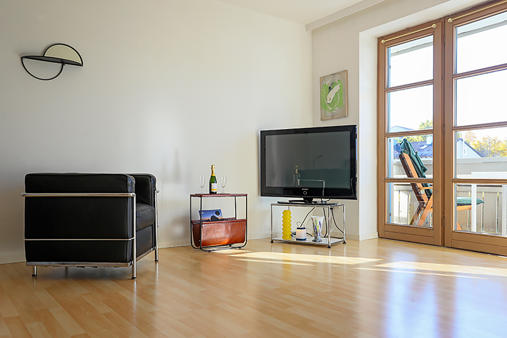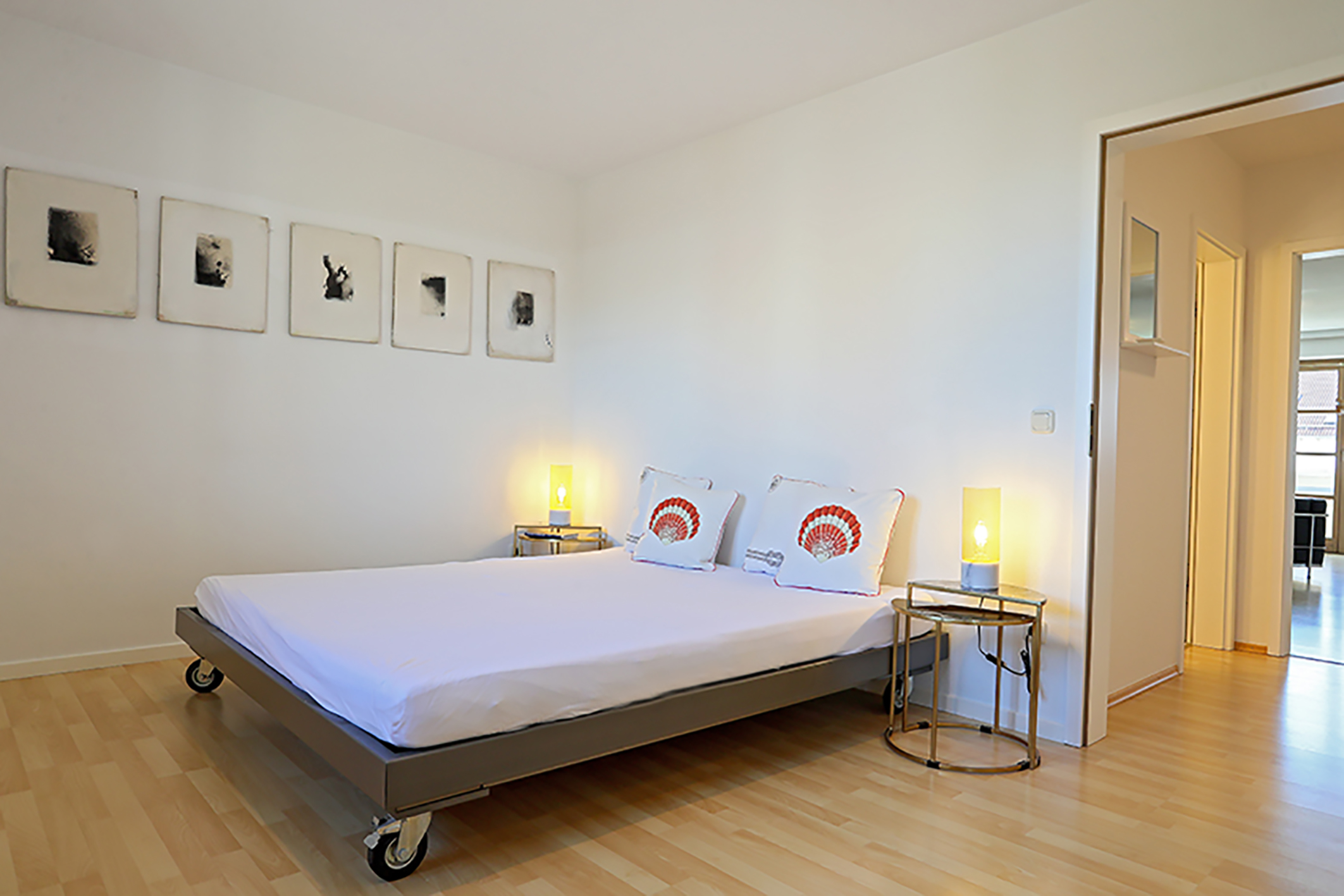 Diese schöne Ferienwohnung mit Balkon, Gartenblick und Gartennutzung hat 1 Schlafzimmer mit einem Doppelbett (180x200), 1 großes Wohnzimmer mit einer hochwertigen Schlafcouch, einen großen Flachbild-Plasma TV, sowie eine integrierte, sehr gut ausgestattete Küche mit Saftpresse und Mixer, einem Kühl-, Gefrierschrank, Cerankochfeld, Backofen, Mikrowelle und einem Geschirrspüler sowie 1 Badezimmer mit einer Dusch-Badewanne mit Regenwald-Dusche.