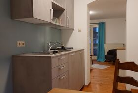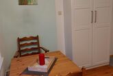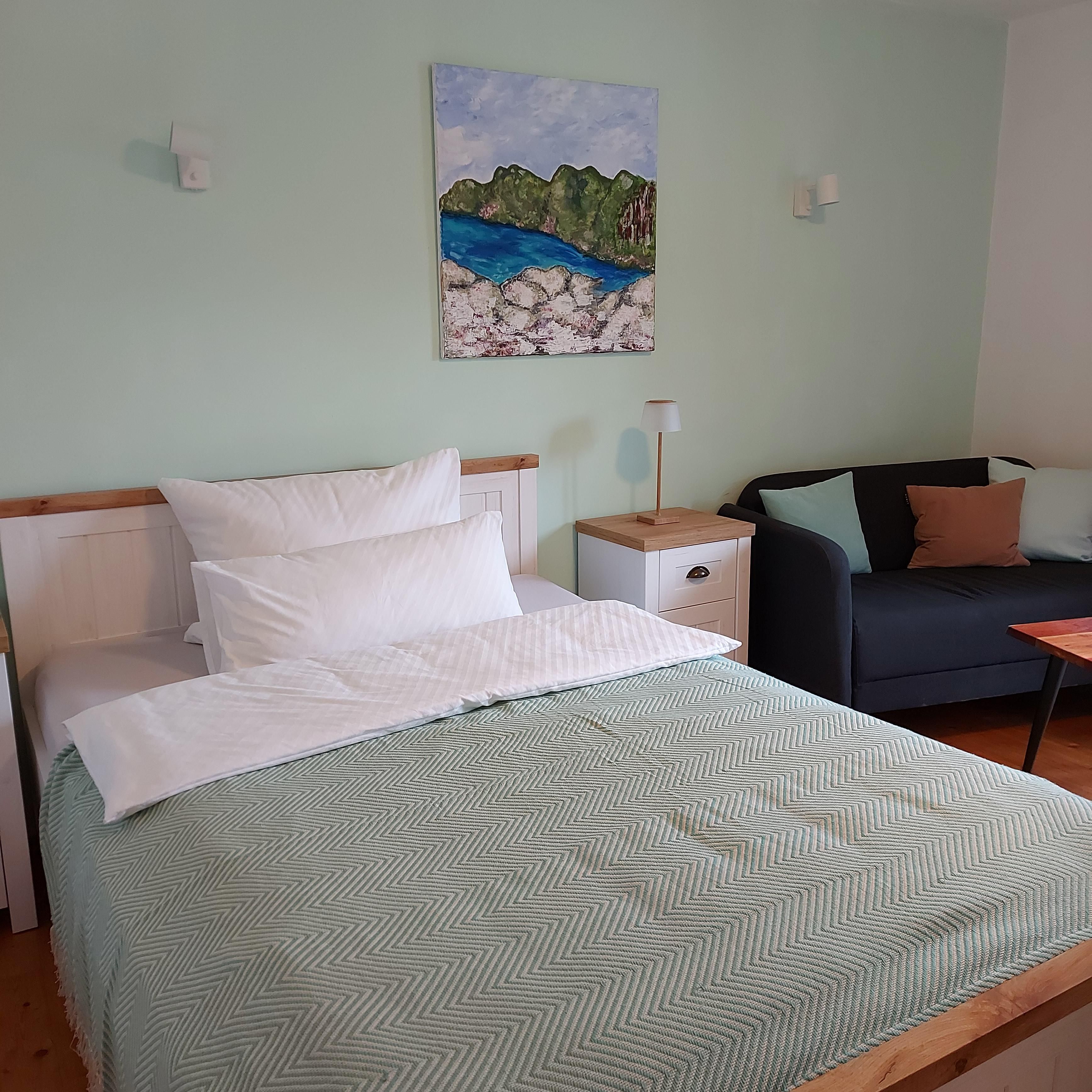 Die Ferienwohnung Zellerberg verfügt über 2 ineinander übergehende Zimmer, sowie Dusche/WC. Eine kleine Diele im Eingangsbereich begrüßt Sie mit raumhohem Kleiderschrank und Eingang zum Duschbad. Dann schließt sich ein Essplatz mit Küchenzeile und Durchgang zum Wohn-/Schlafzimmer an; ausgestattet mit Doppelbett, Couch, Sessel, Kommode und Fernseher. Die Fenster der Wohnung zeigen zum Großteil nach Osten, sodass man die Morgensonne voll genießen kann. Über Balkon und Treppe gelangt man zur dazugehörigen großen Dachterasse, die zum Relaxen einlädt.