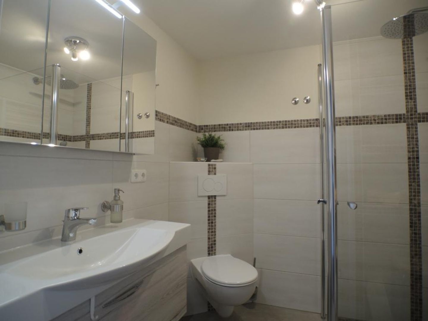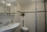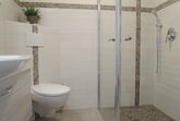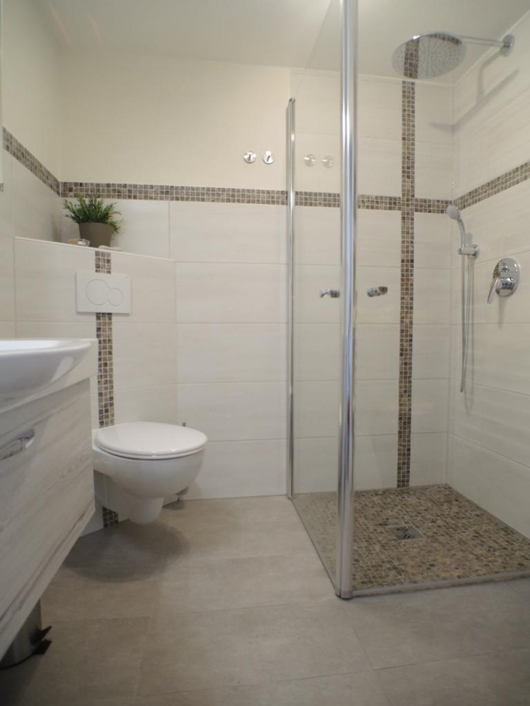 Modernes Badezimmer mit Dusche, Waschkonsole und WC.