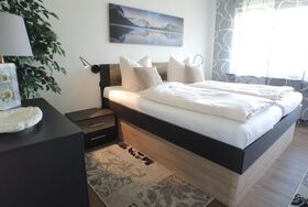 Schlafzimmer mit etwas erhöhtem Doppelbett und großem Kleiderschrank.