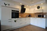 Großer Wohnbereich mit offener moderner Küche, komplett ausgestattet mit Geschirrspüler, Induktionsherd, Backofen, Mikrowelle etc.,