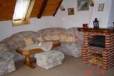 mit Fichte Möbeln. Eine Ferienwohnung mit elektrischen offenen Kamin, Wohnzimmer mit Rundcouch und voll eingerichteter Küche.