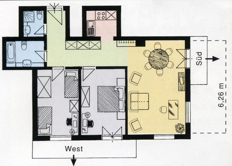 Ruhig und doch zentral gelegene Ferienwohnung für 4 bis 6 Personen mit 74 m². Bestehend aus zwei Schlafzimmern (1x mit Doppelbett und 1x mit zwei Extrabetten ideal für Kinder), einen Wohn-/Schlafraum mit ausziehbarer Couch, Kochnische, gemütliche Essecke, 2 Badezimmer (1 x mit Badewanne/WC und 1 x mit Dusche/WC) und Balkon. Gerne bieten wir unseren täglichen Brötchenservice an oder auch gerne Frühstück auf Wunsch.