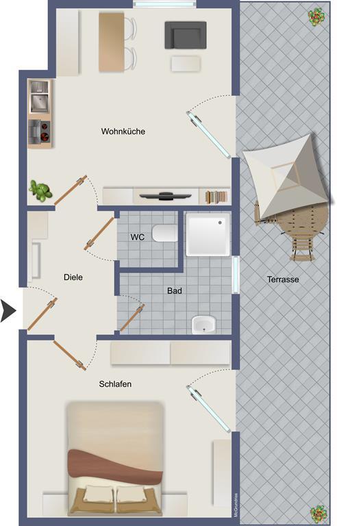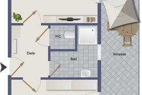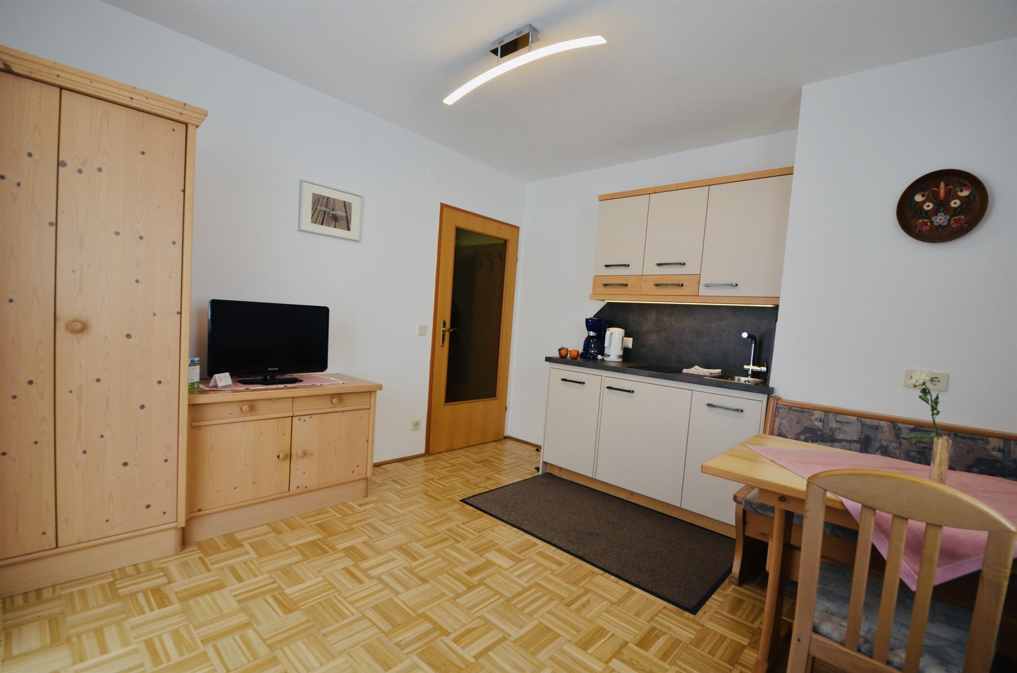 Ferienwohnung für 2-3 Personen 40 m ² mit Blick zum See, Terrasse zur Seeseite. Einen Vorraum und ein Schlafzimmer, Wohn- Essraum mit integrierter Küchenzeile inkl. Mikrowelle, Kaffeemaschine, SAT-TV, Esstisch sowie ein Sessel zum Ausziehen für die dritte Schlafgelegenheit. Dusche und WC sind separat.