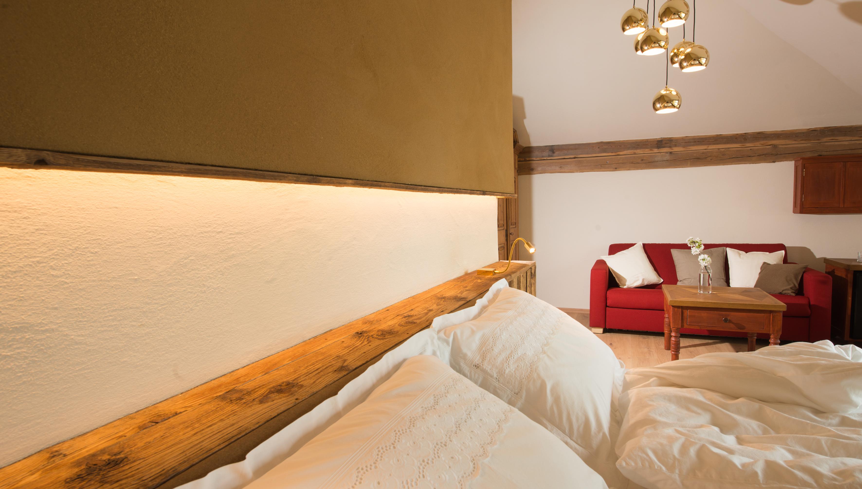 Unsere behaglichen Schlafzimmer sind mit Lehmputz und Wandheizung ausgestattet,