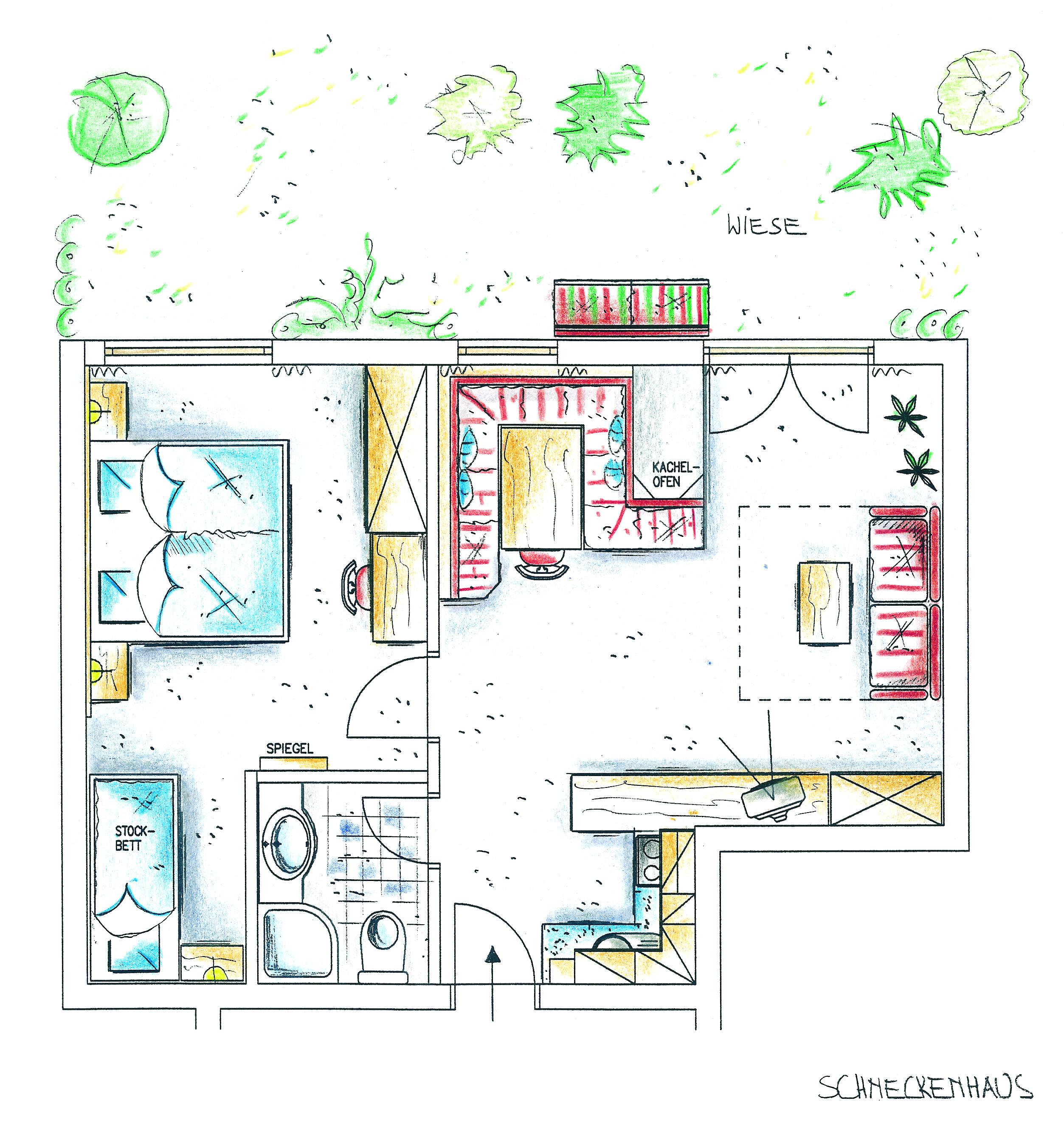 50m²große Wohnung, für 2-4 Personen mit 1 Schlafzimmer, 1 DU/WC und einer großen Wohnküche mit Kachelofen, moderene Küche mit Backrohr und Spülmaschine. Von unserer Parterrewohnung aus kann man direkt hinaus ins Grüne. Mit gemütlicher Sitzecke. Preis inkl. Endreinigung.