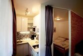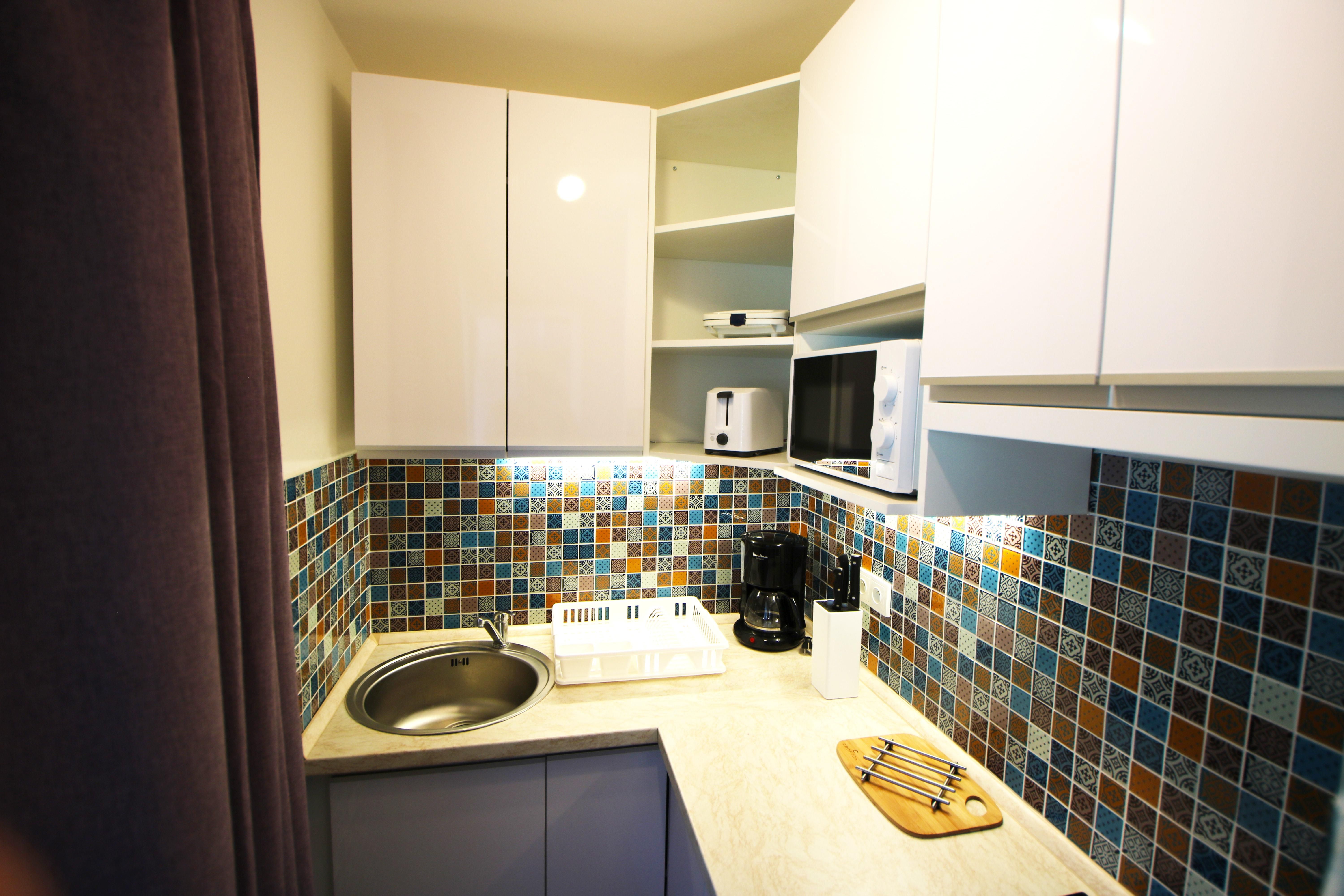 Die Küchenzeile verfügt über einen Herd, einen Kühlschrank, eine Mikrowelle, einen Wasserkocher, einen Toaster & eine Kaffeemaschine + Teller, Besteck und Töpfe/Pfannen.