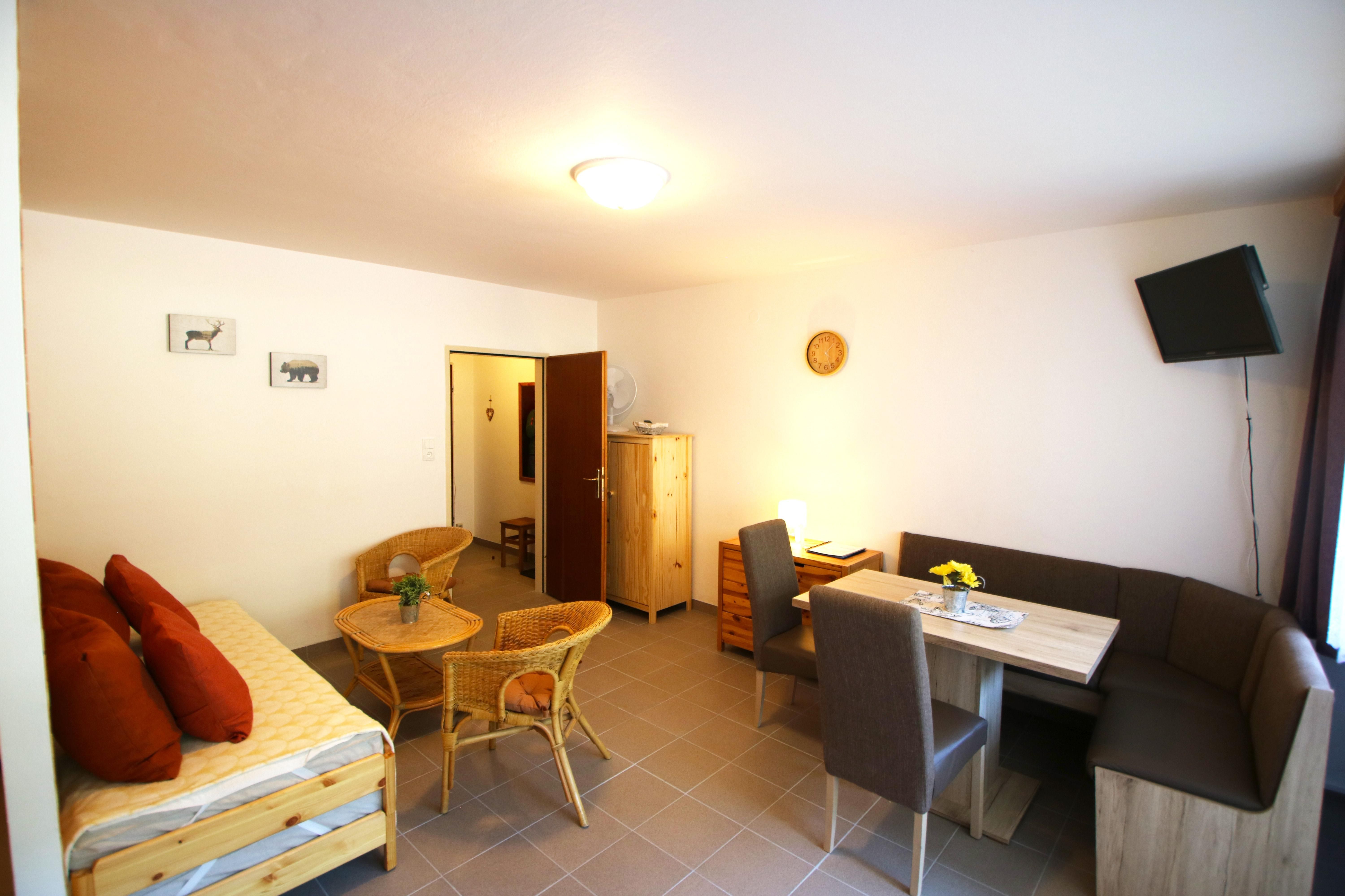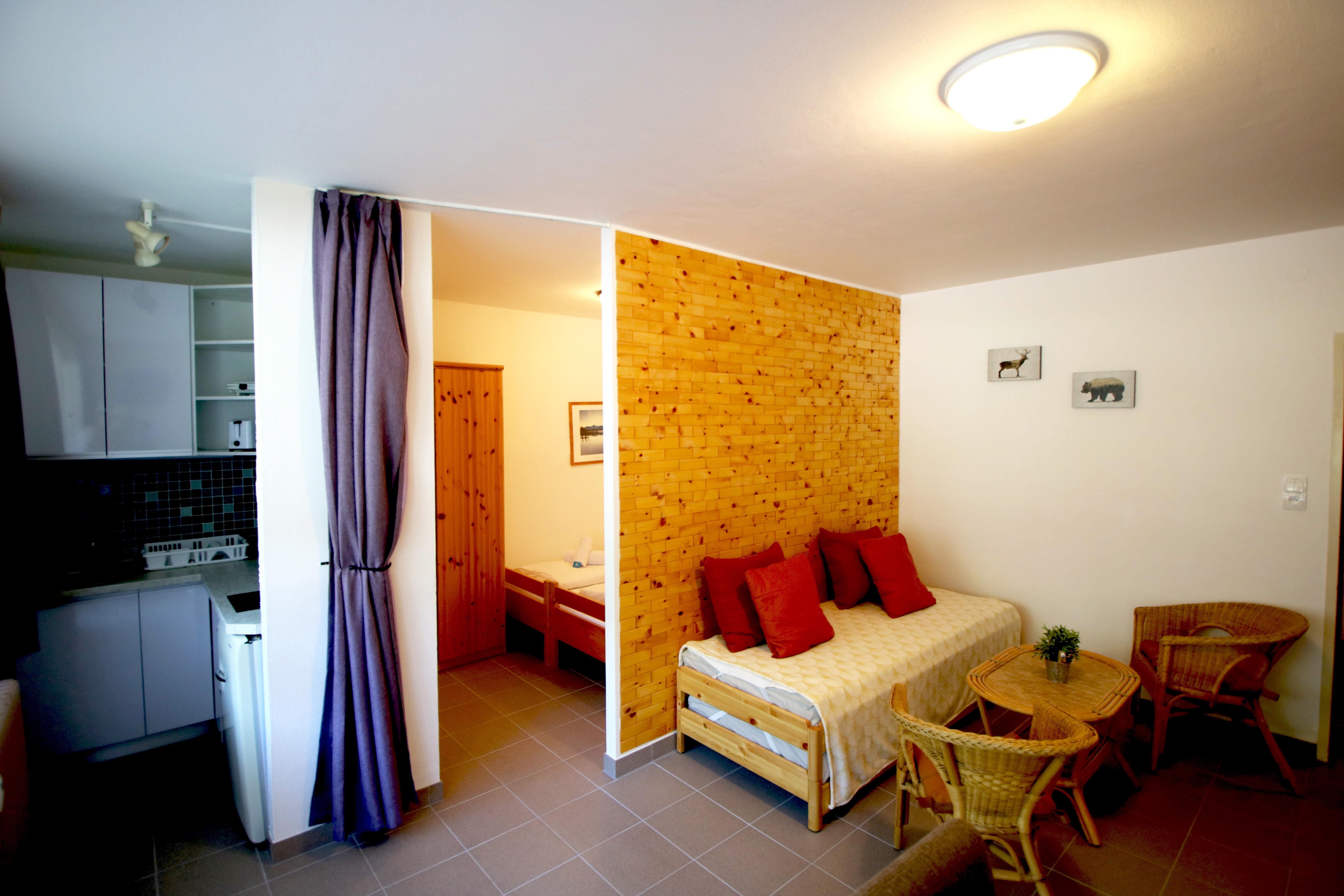 Das 33 m² große Top 3 Studio-Apartment verfügt über einen Esstisch und einen Fernseher. Es gibt eine Nische mit einem Doppelbett (oder 2 Einzelbetten) und das Wohnzimmer verfügt über zwei Einzelbetten.
