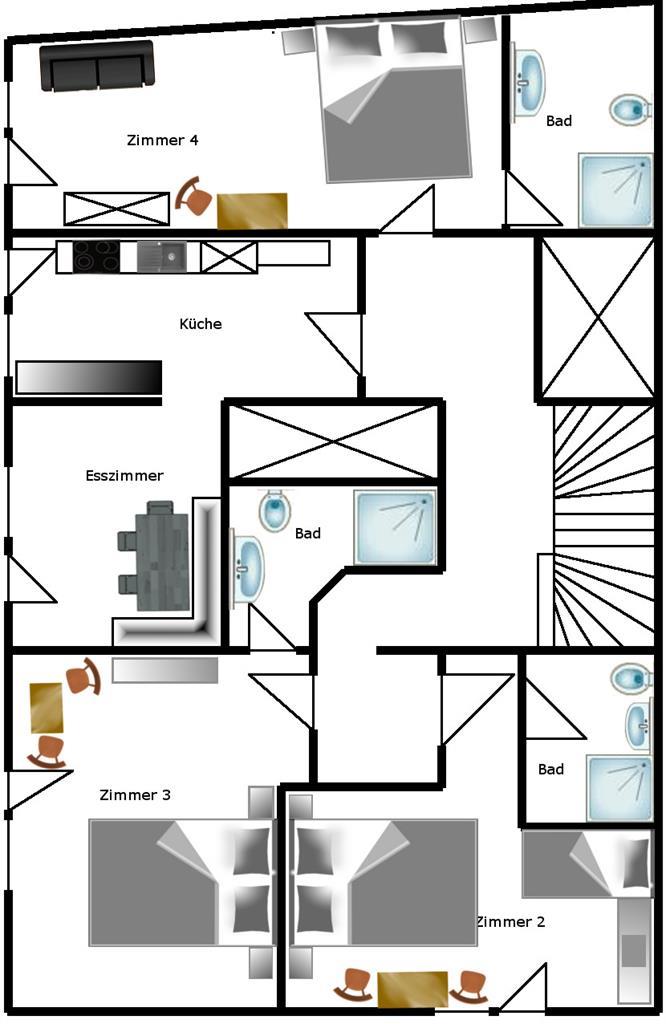Unsere Wohnungen sind sehr geräumig mit hellen Zimmern, jedes davon mit eigenem Bad/WC