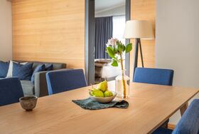 Die Deluxe Chalets (60-81 qm) haben einen separaten Wohnbereich mit gemütlicher Schlafcouch, eine Küche mit Essecke sowie einen schönen Balkon mit tollem Bergblick. Badezimmer mit separatem WC, großer Dampfdusche (Dampfbad) und finnischer Sauna. Zusätzliche Badewanne und Kamin auf Anfrage.