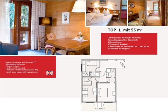 Die Wohnung verfügt über eine Küche, in der Sie Ihre eigenen Mahlzeiten zubereiten können. Ein geräumiges Wohnzimmer lädt zum Entspannen ein und bietet einen herrlichen Blick auf die majestätischen Berge. Die Wohnungen bieten Platz für 2-6 Personen in getrennten Schlafzimmern, die im alpinen traditionellen Stil eingerichtet sind. Hier können Sie sich nach einem aktiven Tag in den Bergen wunderbar erholen.