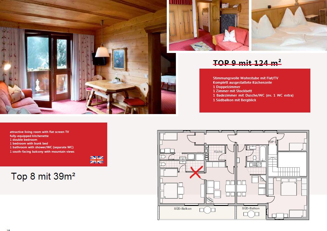 Die Wohnung verfügt über eine Küche, in der Sie Ihre eigenen Mahlzeiten zubereiten können. Ein geräumiges Wohnzimmer lädt zum Entspannen ein und bietet einen herrlichen Blick auf die majestätischen Berge. Die Wohnungen bieten Platz für 2-6 Personen in getrennten Schlafzimmern, die im alpinen traditionellen Stil eingerichtet sind. Hier können Sie sich nach einem aktiven Tag in den Bergen wunderbar erholen.