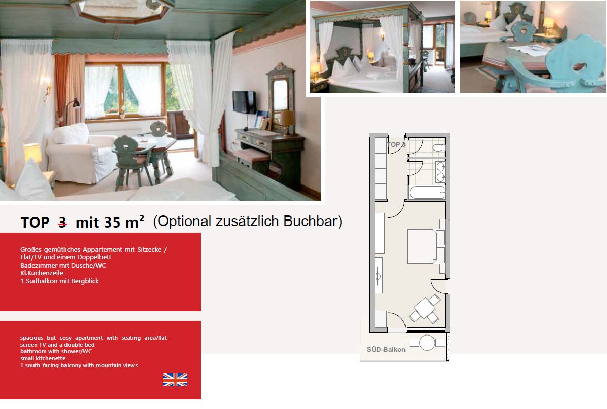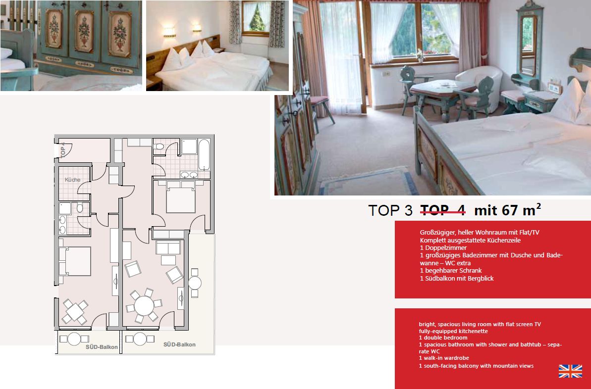 Die Wohnung verfügt über eine Küche, in der Sie Ihre eigenen Mahlzeiten zubereiten können. Ein geräumiges Wohnzimmer lädt zum Entspannen ein und bietet einen herrlichen Blick auf die majestätischen Berge. Die Wohnungen bieten Platz für 2-6 Personen in getrennten Schlafzimmern, die im alpinen traditionellen Stil eingerichtet sind. Hier können Sie sich nach einem aktiven Tag in den Bergen wunderbar erholen.