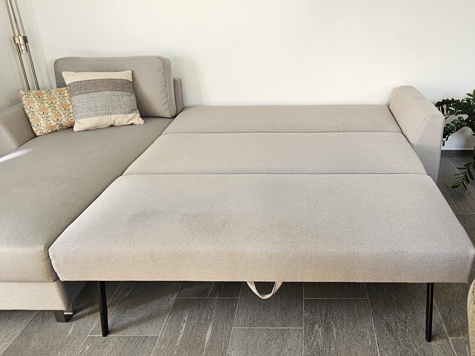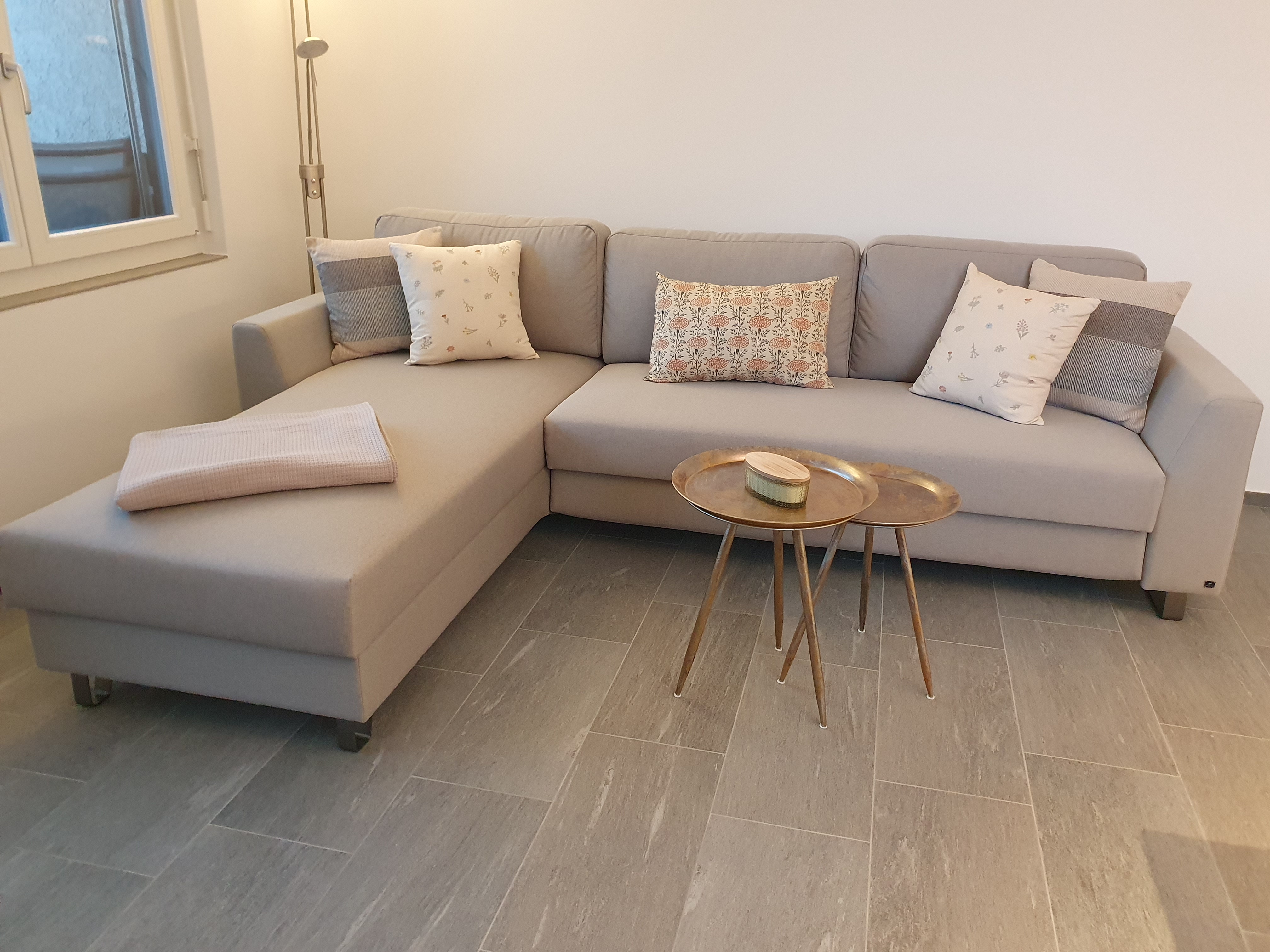 Kombinierter Wohn- und Schlafbereich mit Schlafsofa, Kabel-TV, Digitalradio, WLAN vorhanden. Zugang zum südlichen Balkon mit Gartenstühlen, Gartentisch und Sonnenschirm. Küche: