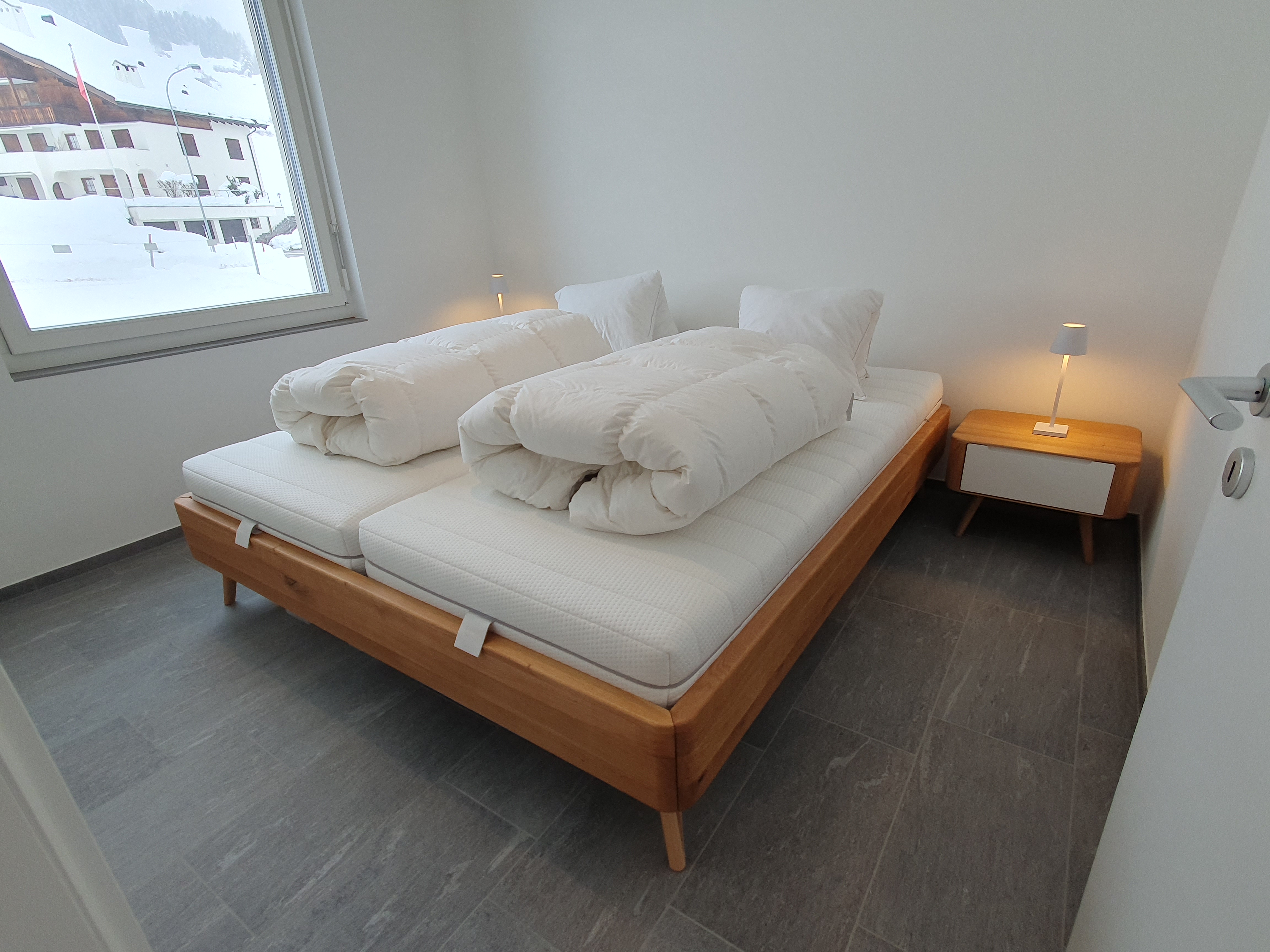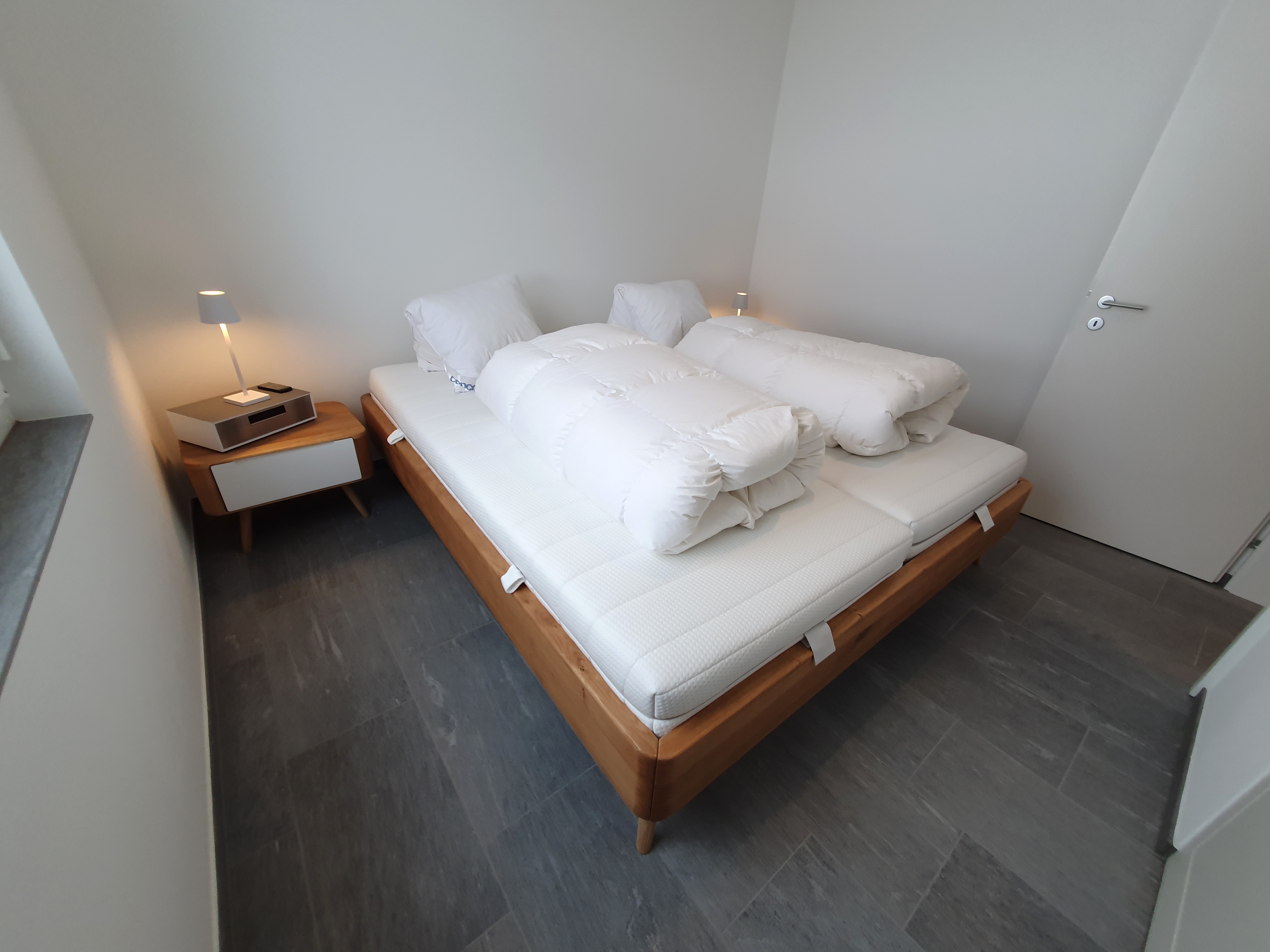 1 Doppelschlafzimmer mit Doppelbett 200cm, Nachttische mit Nachttischlampen, Stuhl für Kleiderablage und Kleiderschrank. Bettwäsche vorhanden für CHF 15.00 pro Person und Aufenthalt. Ein Kinderbett kann auf Wunsch für CHF 10.00 reserviert werden. Wohnzimmer: