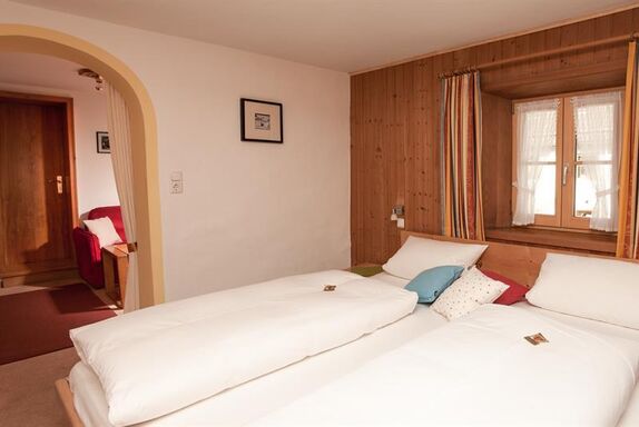 Extra Fernsehzimmer mit Sitzecke 8 m², Kühlschrank (lautlos), grosses Bad 5 m² (2 Waschbecken), Tissue, Vergrösserungsspiegel, Seife.