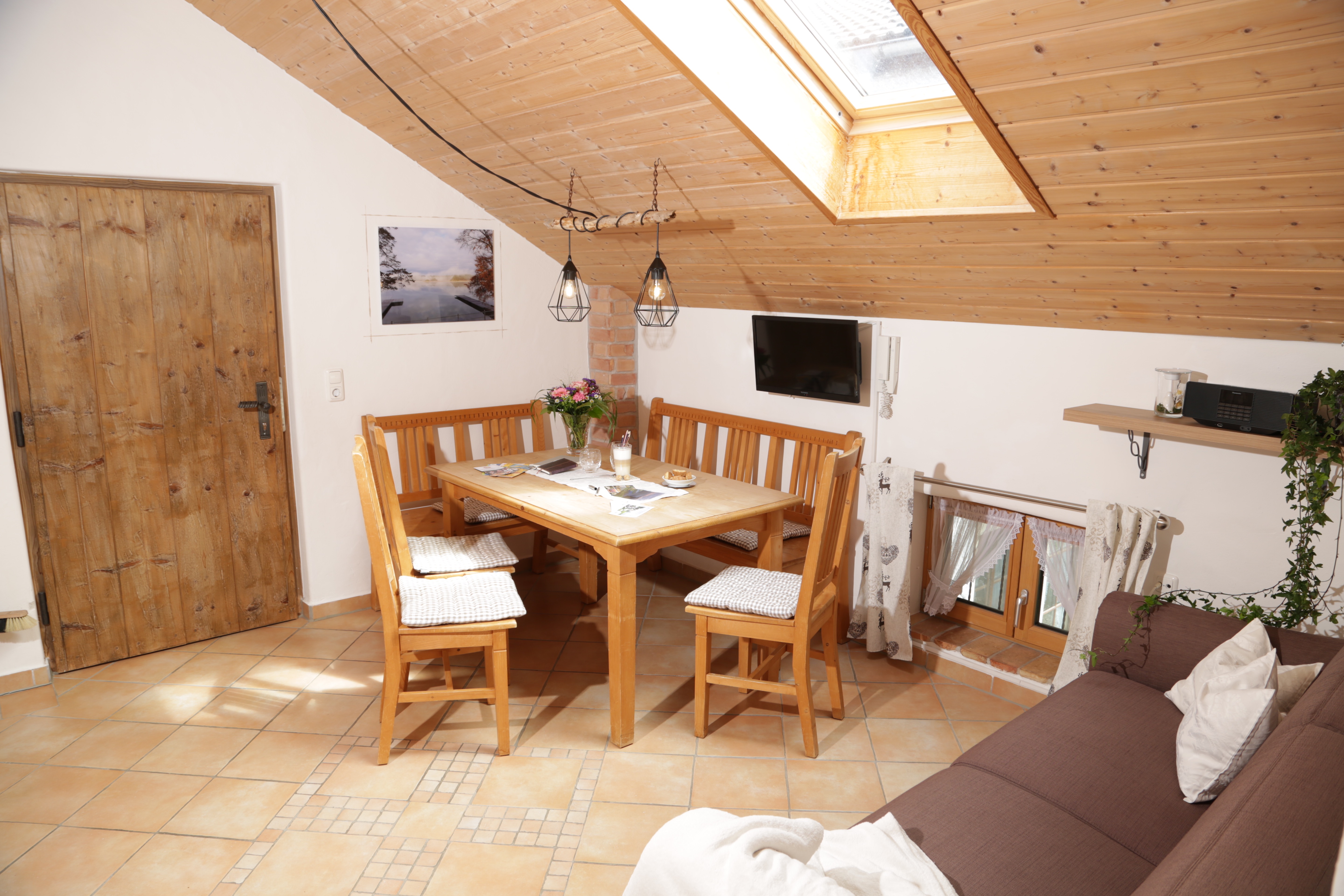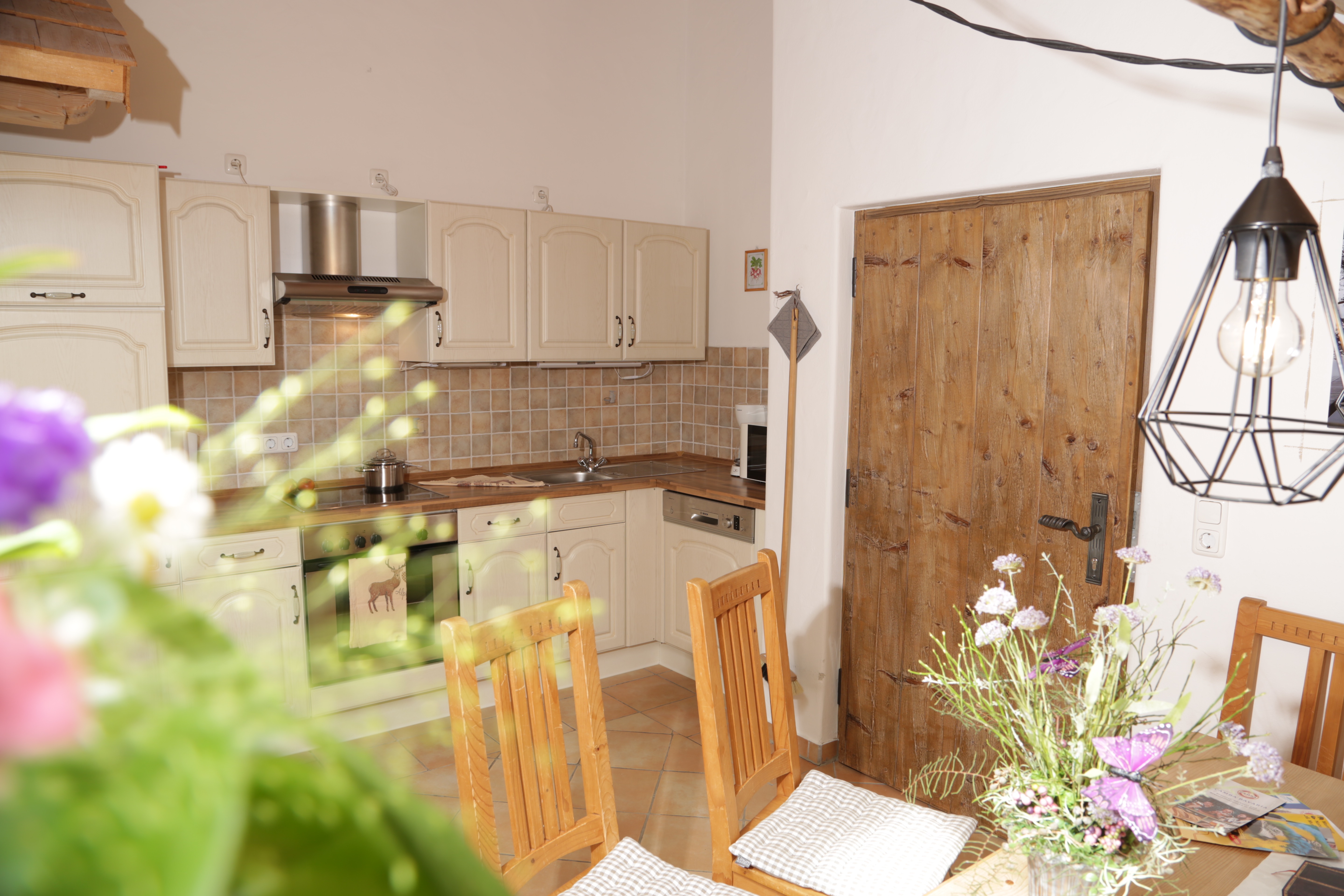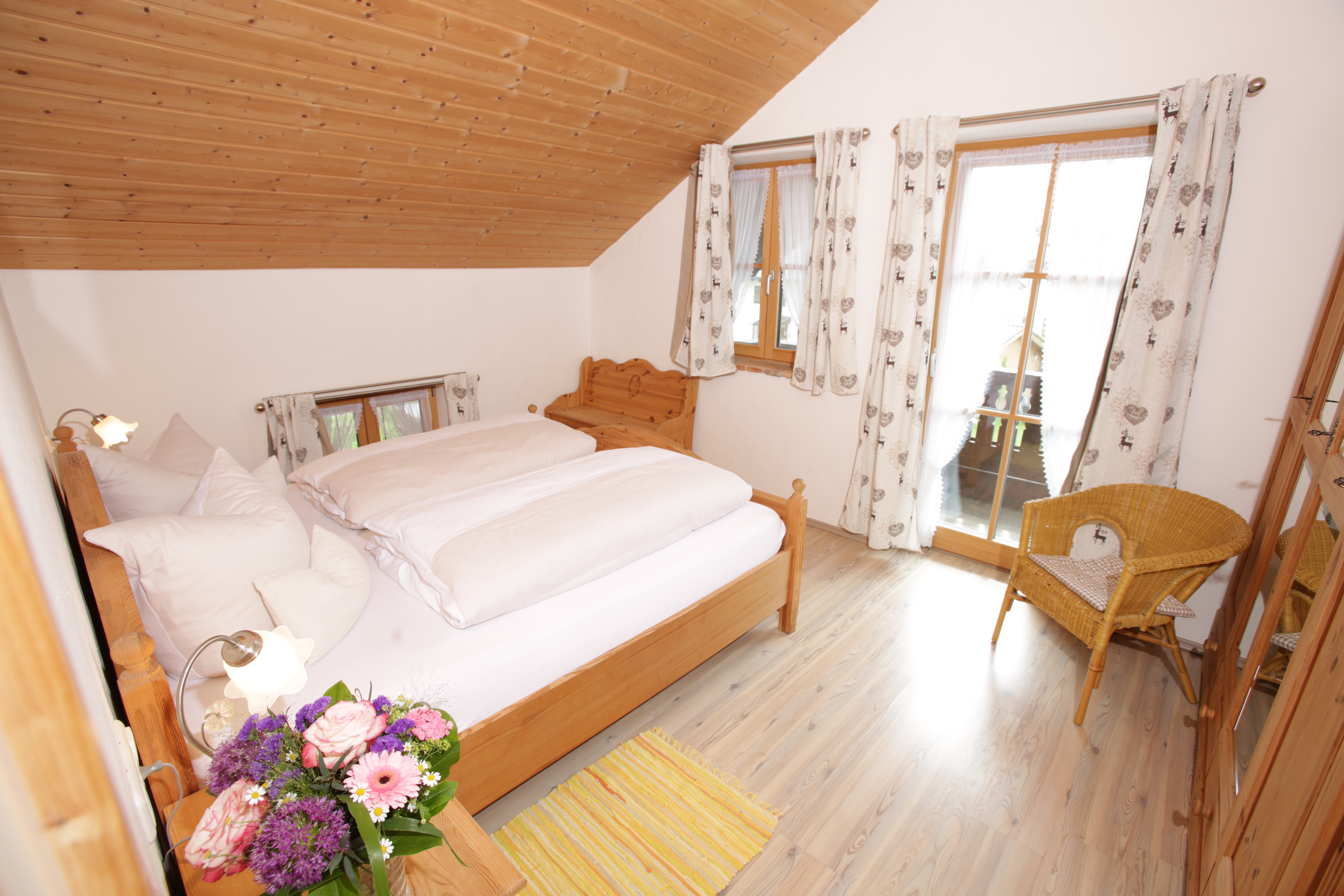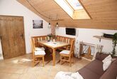 Diese 54 m² große, helle, im modern-bayerischen Stil eingerichtete Wohnung bietet jeden Komfort für einen erholsamen Urlaub. Die Wohnküche ist mit einer modernen Küche eingerichtet, die neben Mikrowelle, Herd/Backofen, Kühlschrank mit Gefrierfach auch noch einen Geschirrspüler bietet. Eine gemütliche Essecke bietet ausreichend Platz für die gemütliche Brotzeit und eine Sitzecke Platz für die ganze Familie zum Fernsehen. Zwei separate Schlafzimmer, eines mit Doppelstockbett (in dem auch Erwachsene ausreichend Platz haben) und ein Elternschlafzimmer mit Doppelbett bieten angenehme Ruhe. Das modere Bad ist hell und freundlich mit Dusche und WC ausgestattet. Vom Balkon haben Sie einen wunderschönen Blick Richtung Alpen. Helle und umweltfreundliche Baustoffe sorgen für ein gutes Klima.