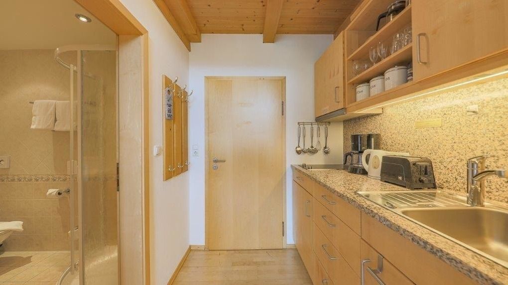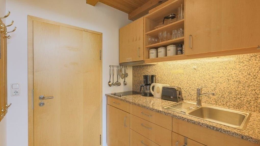 Küchenzeile mit 2-Plattenherd, Kühlschrank, Spüle, Kaffeemaschine, Wasserkocher, Toaster, teilweise Geschirrspüler