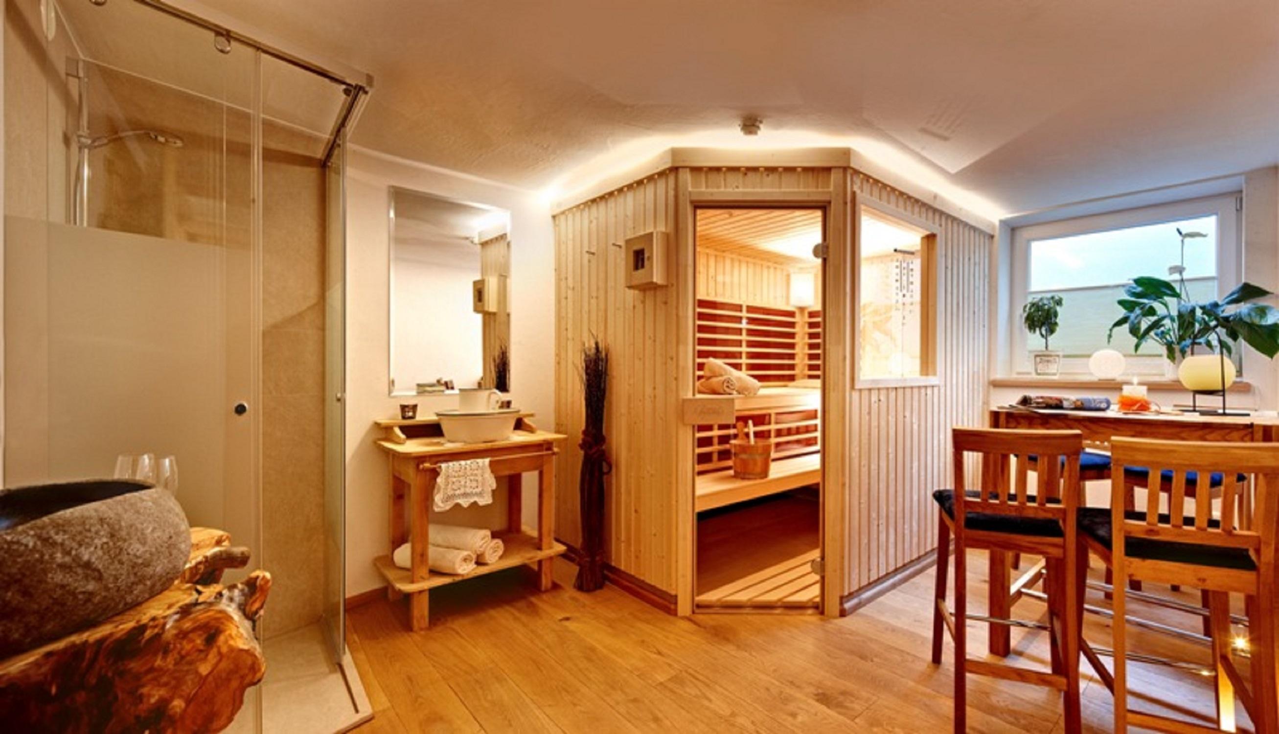 •1 Doppelzimmer, 1 Familienzimmer mit Stockbett (90 x 200 cm) •komplett eingerichtete Wohnküche mit Schlafcouch •Badezimmer mit Infrarotkabine, Erlebnisdusche - Raindance Tellerbrause und Handbrause, Handtuchtrockner, Haarfön •WC separat •Südterrasse •Vorraum, Garderobe •Sat-TV, Internetanschluss, Zimmersafe •großzügiges Frühstücksbuffet oder Brötchenservice auf Wunsch •inkl. 1 x wöchentl. Einladung zu Kaffee & Kuchen und 1 x Nachmittagsjause
