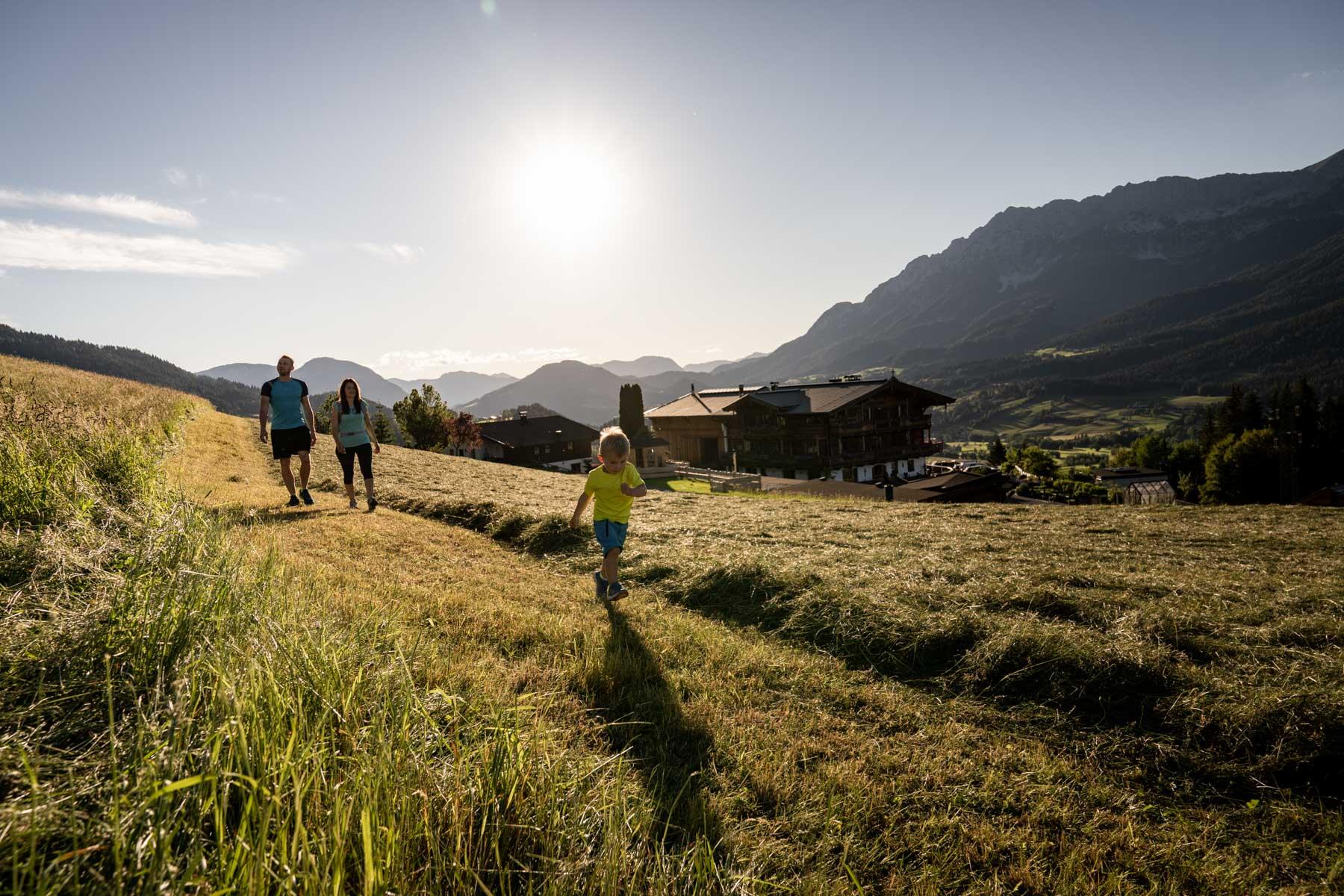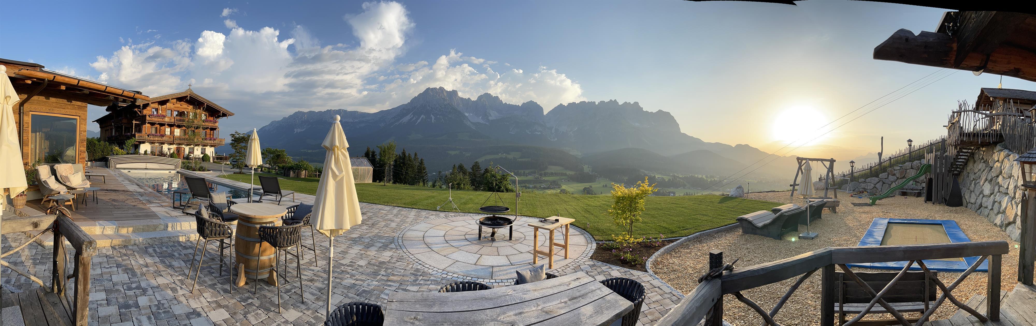 Unser Naschberghof liegt auf einem Plateau etwas oberhalb vom Ortszentrum Ellmau inmitten der Natur, umgeben von Wiesen und Wäldern. Von hier genießen Sie einen unverbauten und einzigarten Panoramablick auf das Bergmassiv des Wilden Kaisers sowie auf die gesamte Bergwelt. Zum Ortszentrum sind es 10 Minuten zu Fuß.