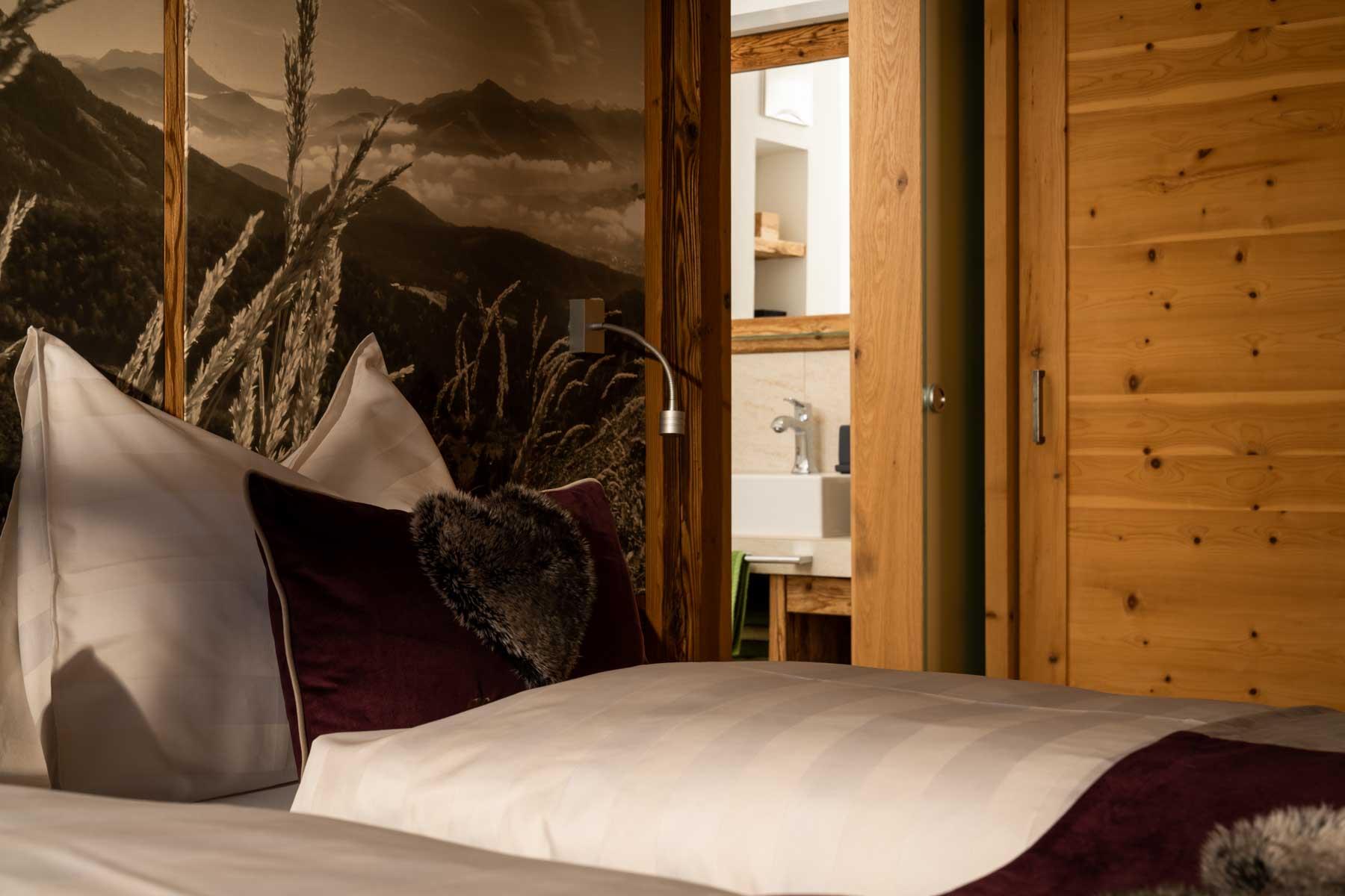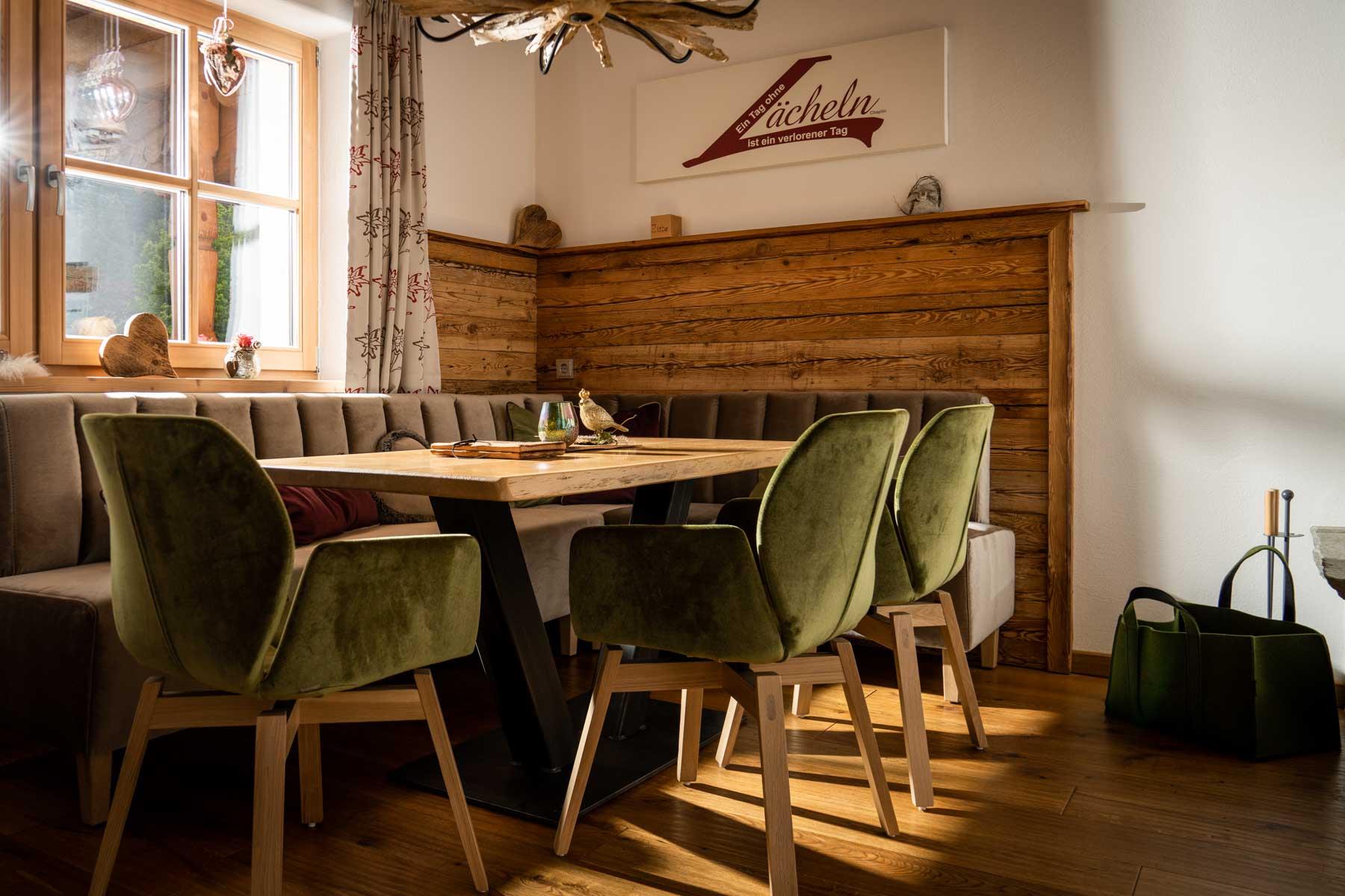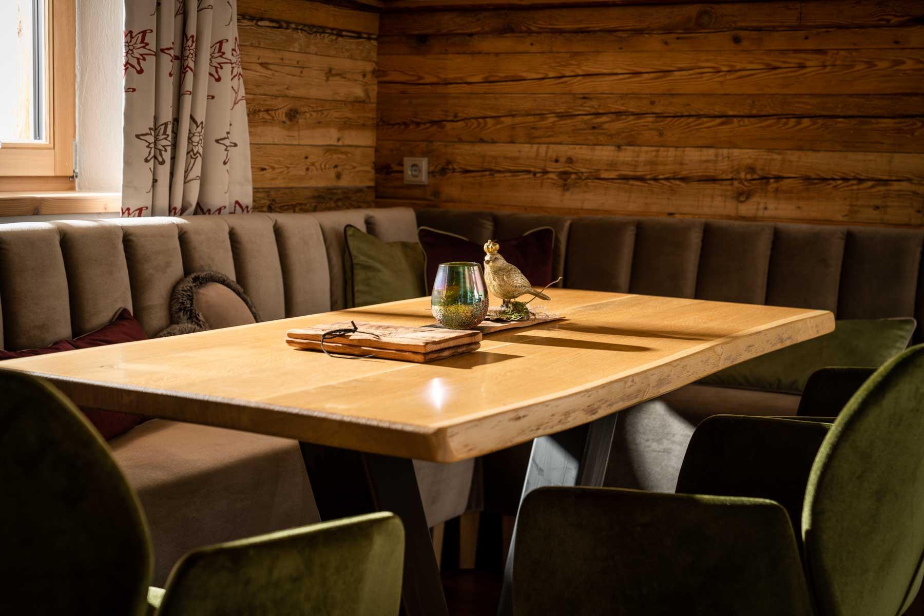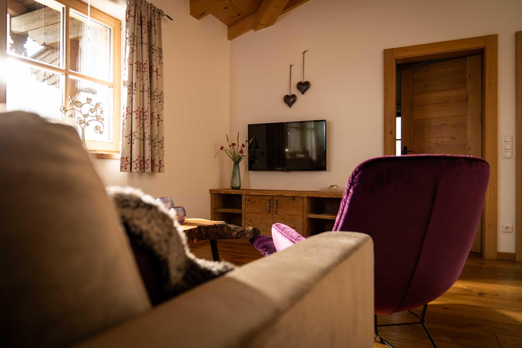 Die Einrichtung ist sehr gemütlich und luxuriös. Naturholz sowie Altholz sorgen für ein entsprechendes Ambiente. Zirbenholz in den Schlafzimmern für einen gesunden Schlaf sowie massive Holzböden mit Fußbodenheizung und in zwei Appartements ein offener Kamin sorgen für eine wohlige Wärme und runden das Wohlbefinden ab. Einem gesunden und behaglichen Raumklima und somit einem erholsamen Urlaub steht nichts mehr im Wege.