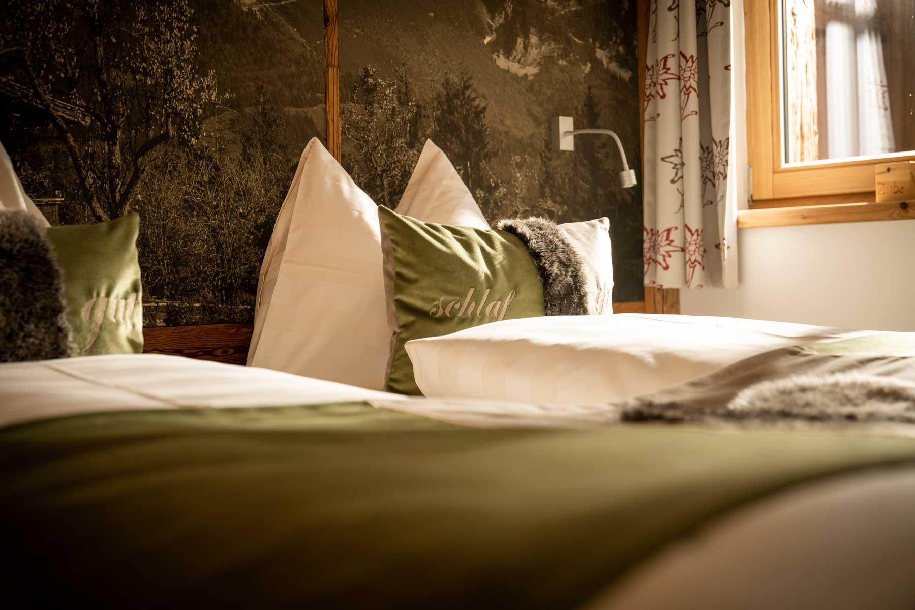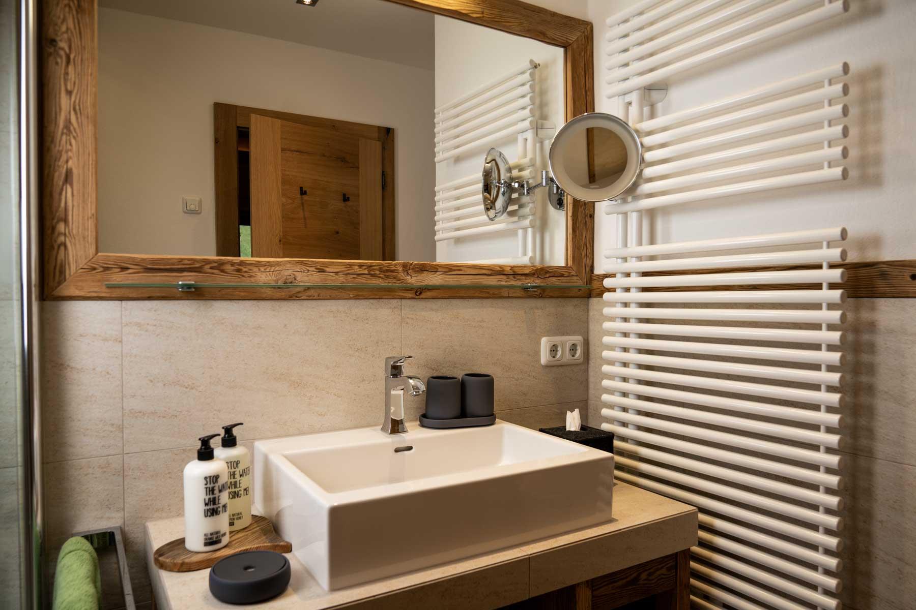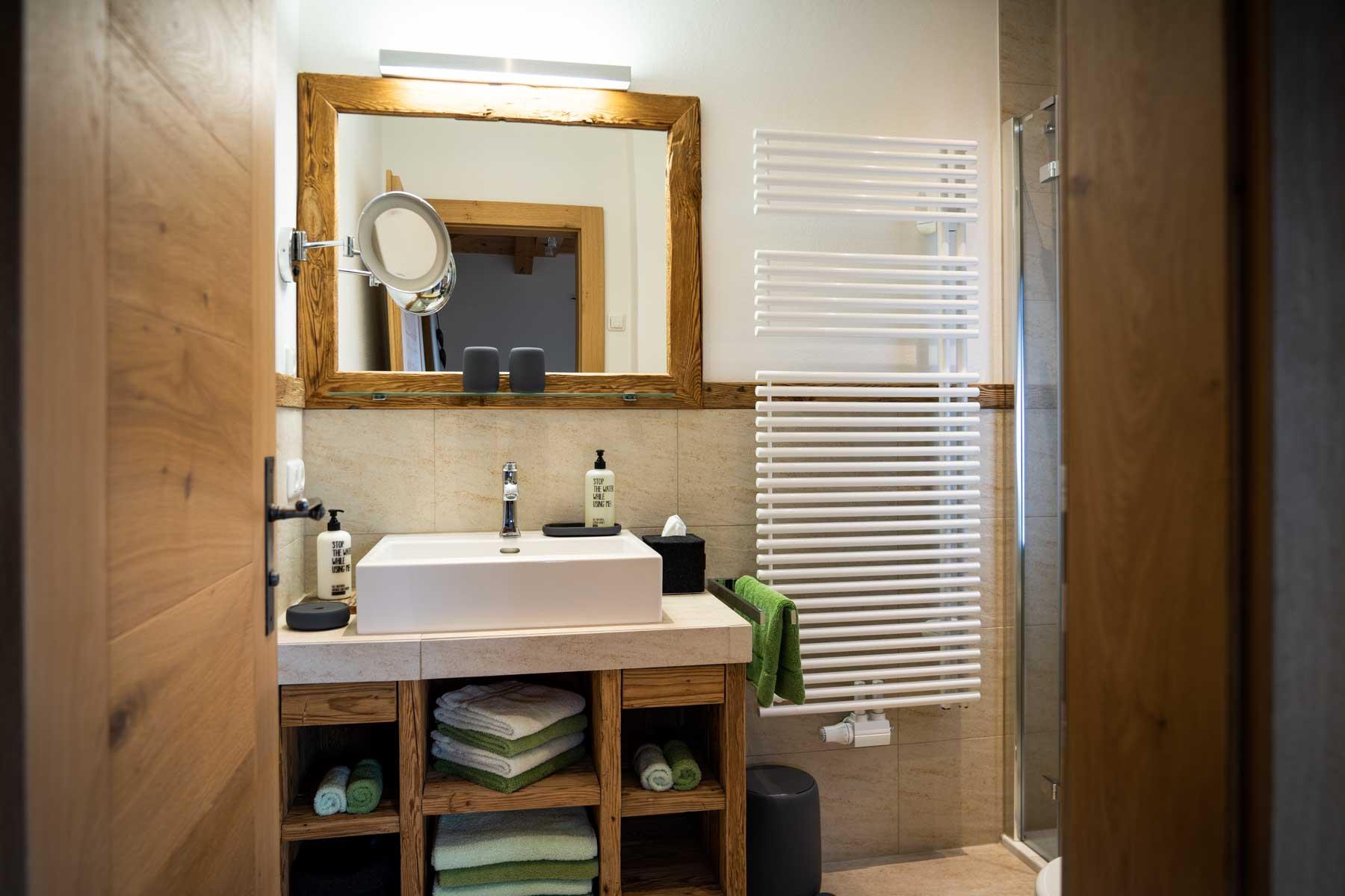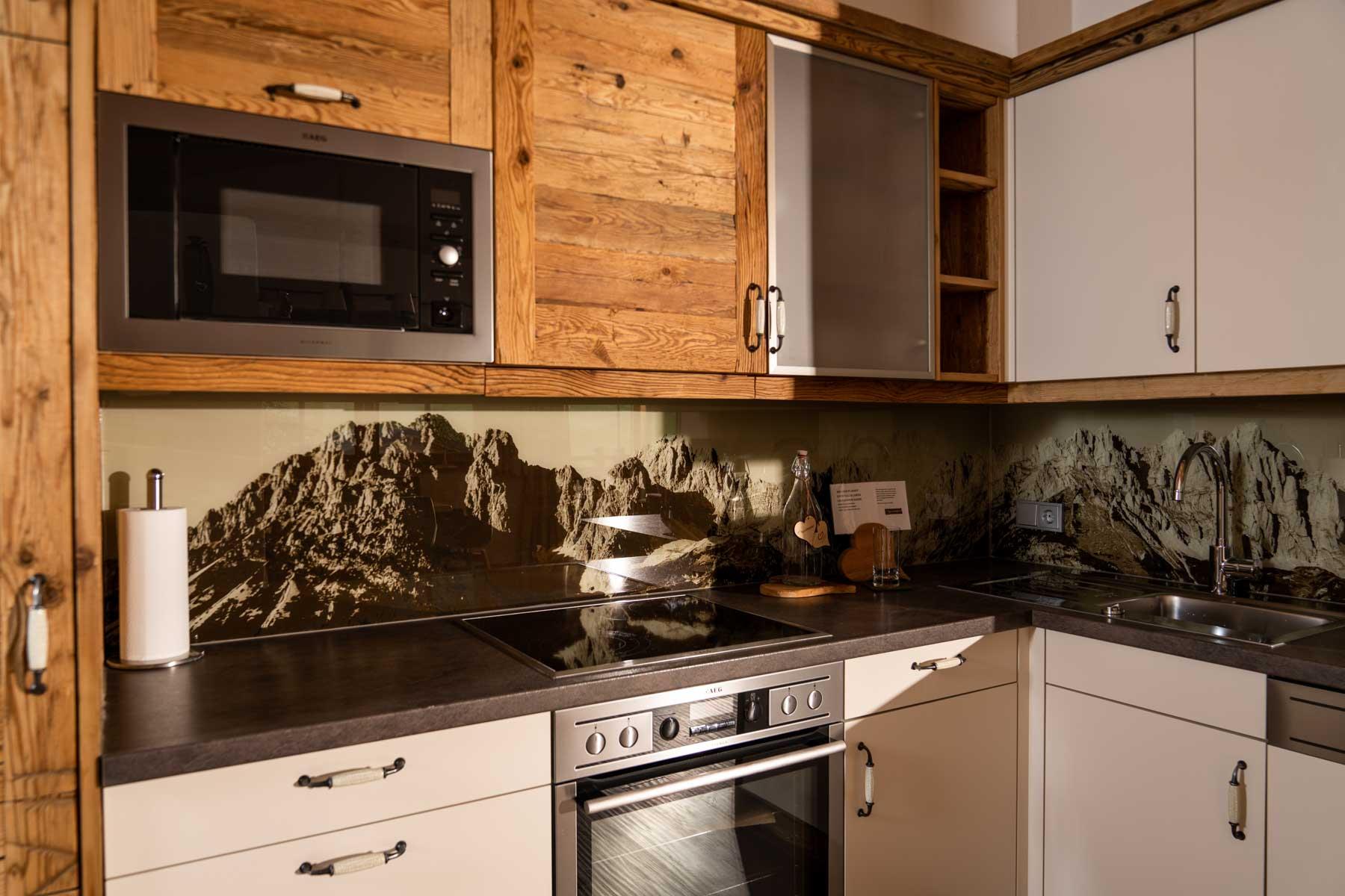 Die Einrichtung ist sehr gemütlich und luxuriös. Naturholz sowie Altholz sorgen für ein entsprechendes Ambiente. Zirbenholz in den Schlafzimmern für einen gesunden Schlaf sowie massive Holzböden mit Fußbodenheizung und in zwei Appartements ein offener Kamin sorgen für eine wohlige Wärme und runden das Wohlbefinden ab. Einem gesunden und behaglichen Raumklima und somit einem erholsamen Urlaub steht nichts mehr im Wege.