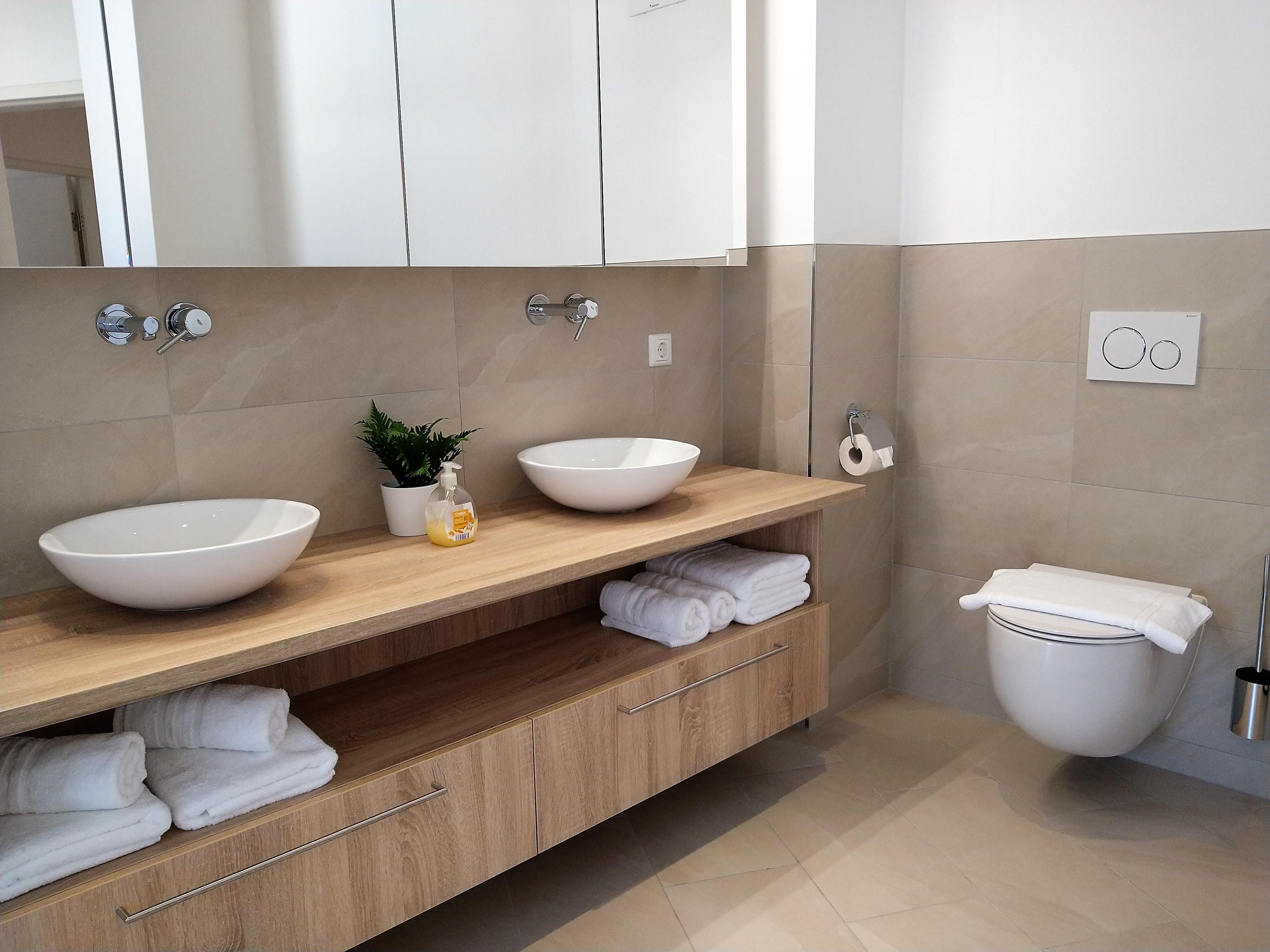 • 2 Badezimmer mit Dusche, Doppelwaschbecken, Haartrockner und WC