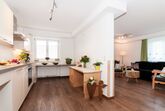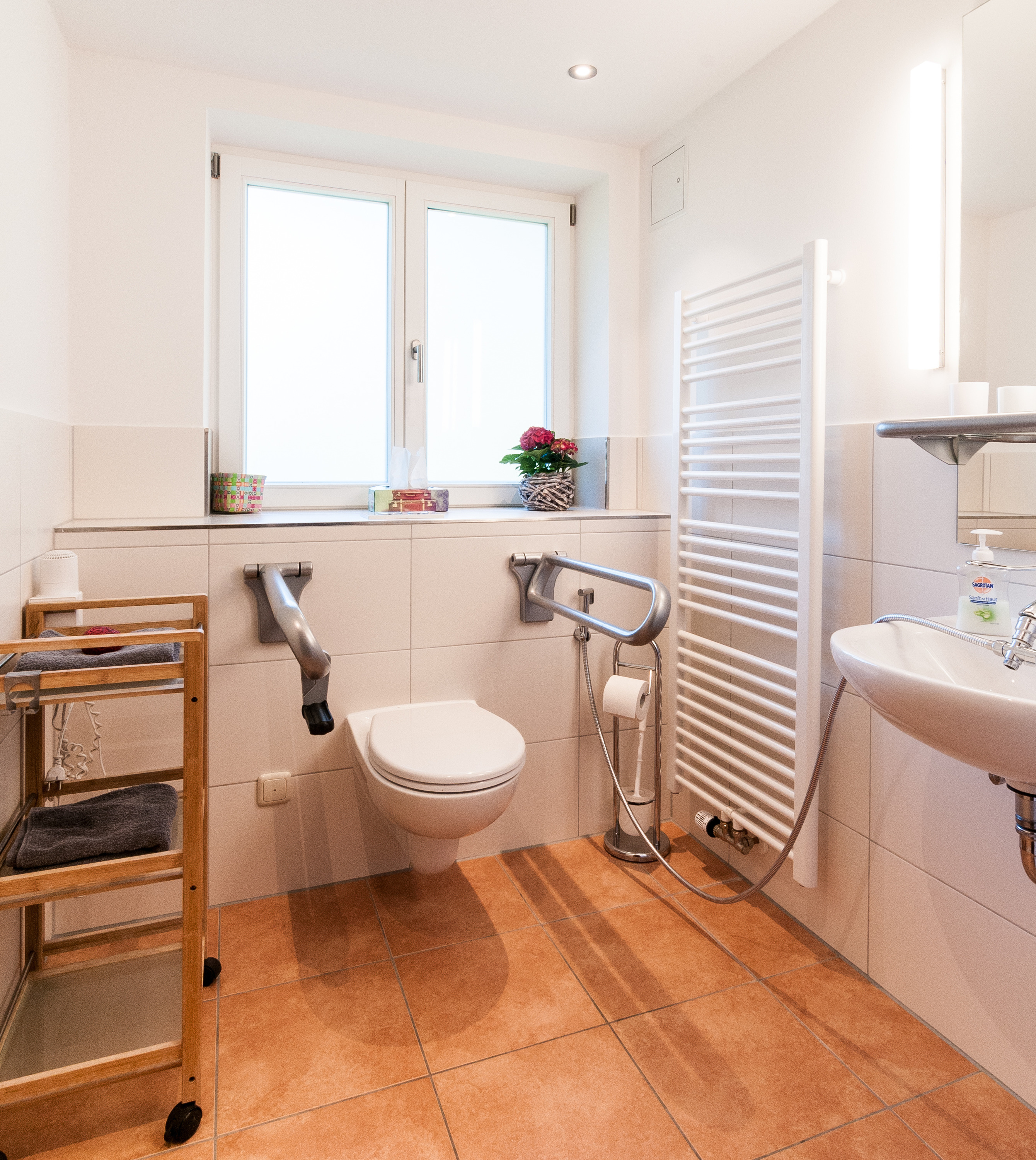 Diese Wohnung hat ein Wohnzimmer mit Couch, großem Esstisch mit Platz für 6 Personen und Küchenzeile, in dieser Wohnung mit separatem Backofen. Das erste Schlafzimmer hat ein Doppelbett (Höhe ohne Matratze 38 cm, mit Matratze ca. 47 cm), das angrenzenden Bad mit Dusche (für Rollstuhl möglich, Duschstuhl mit Lehne vorhanden) und getrenntem WC (höhe mit WC-Brille 45 cm) mit beidseitig, klappbaren Stütz-Haltegriffen (Höhe 75/85 cm), das Waschbecken hat eine Höhe von 83 cm und einen Haltegriff rechts in einer Höhe von 92 cm.