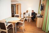 Unsere Ferienwohnung Setzberg hat eine Größe von 49qm, befindet sich im EG auf der Süd-West Seite und verfügt über eine Terrasse. Im Wohnzimmer befindet sich ein Esstisch (Höhe 0,70m) und zwei Sessel mit einem kleinen Tisch, sowie eine Küchenzeile mit unterfahrbarer Spüle (unterfahrbare Höhe 0,70m, Höhe Spüle 0,85m). Das Doppelbett im Schlafzimmer ist trennbar und eine Seite ist als Pflegebett mit seitlichen Gitter und Galgen möglich.