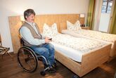 Das Bett ist elektrisch höhenverstellbar, sowie das Lattenrost in mehreren Positionen elektrisch verstellbar ist. Hilfsmittel wie Lifter o.ä. können zugebucht werden. In einem der beiden Kleiderschränke befindet sich eine Kleiderstange mit Griff zum herunterziehen. Bad mit Dusche/WC (WC Sitzhöhe 0,47m). In der Dusche gibt es eine Haltestange über Eck (Höhe 0,85m) mit eingehängtem Duschstuhl (Sitzhöhe 0,45m) mit Lehne, die Toilette hat beidseitig einen klappbaren Stütz-Haltegriff (Höhe untere Stange 0,70m, obere Stange 0,85m), sowie das Waschbecken beidseitig Haltegriffe besitzt (links einen Stütz-Haltegriff mit Höhe 0,70m / 0,85m und einen festen Haltegriff rechts in 0,90m Höhe). Eine Toilettenerhöhung wäre möglich, welche wir im Haus haben und somit kurzfristig montieren können.