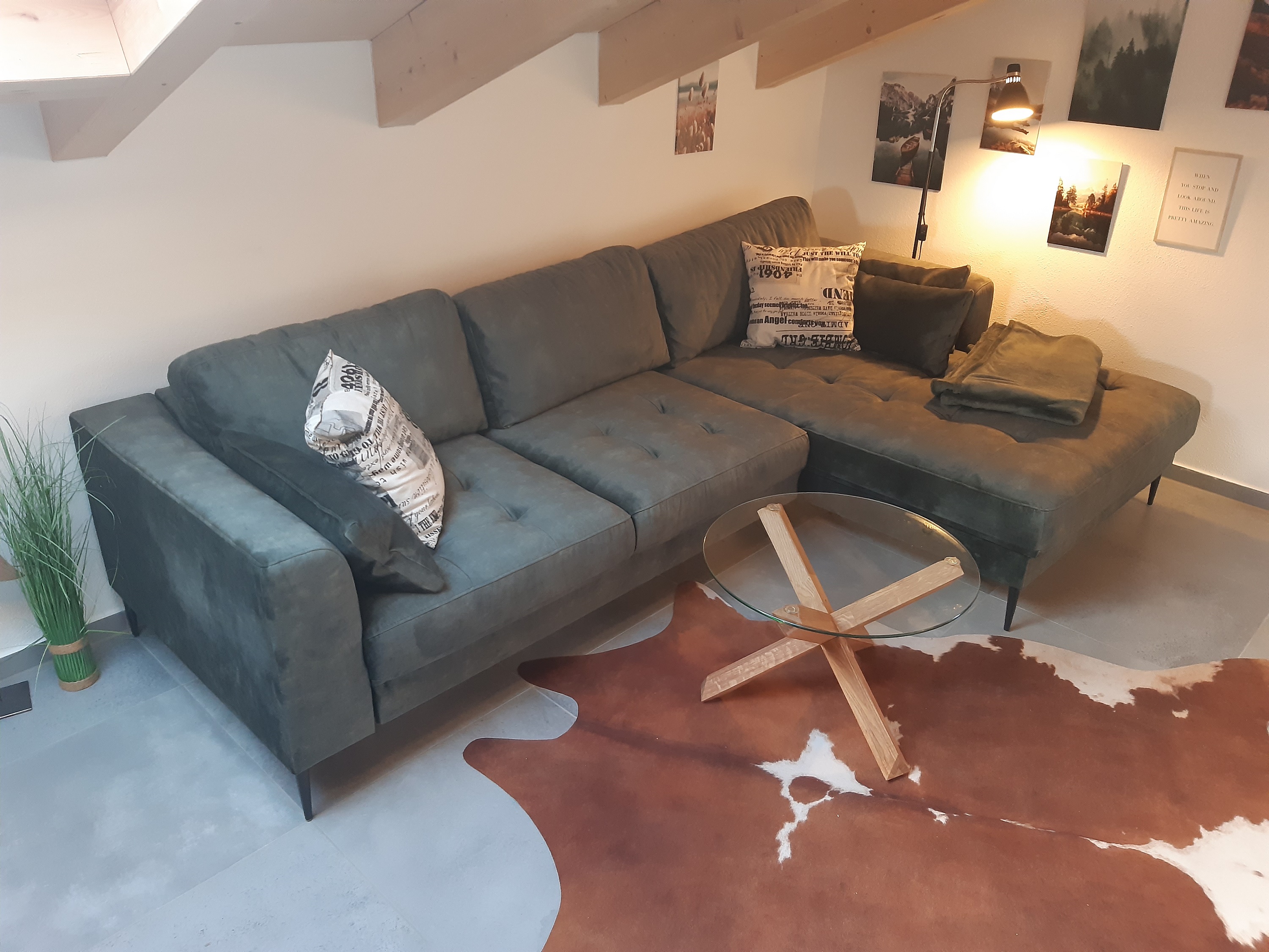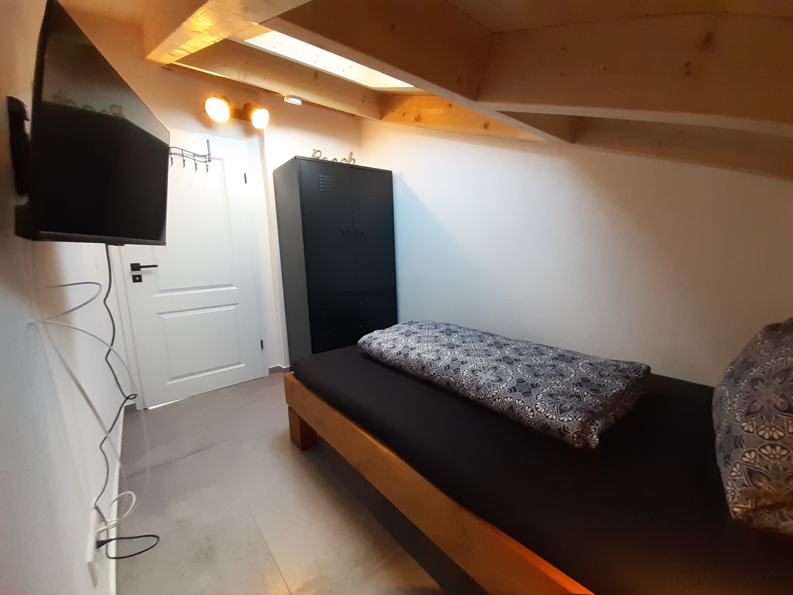 Die Wohnung ist komplett gefliest mit Fußbodenheizung, dezentrale Belüftung, offener Dachstuhl, abdunkelbare Dachfenster, großer Esstisch für 6 Personen, 2 Barhocker, Couch (mit Ausziehfunktion), Leseliege, Garderobe im Treppenhaus, Weingläser, WLAN.