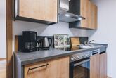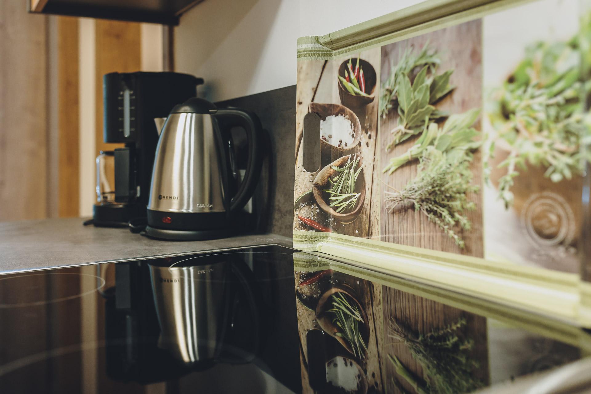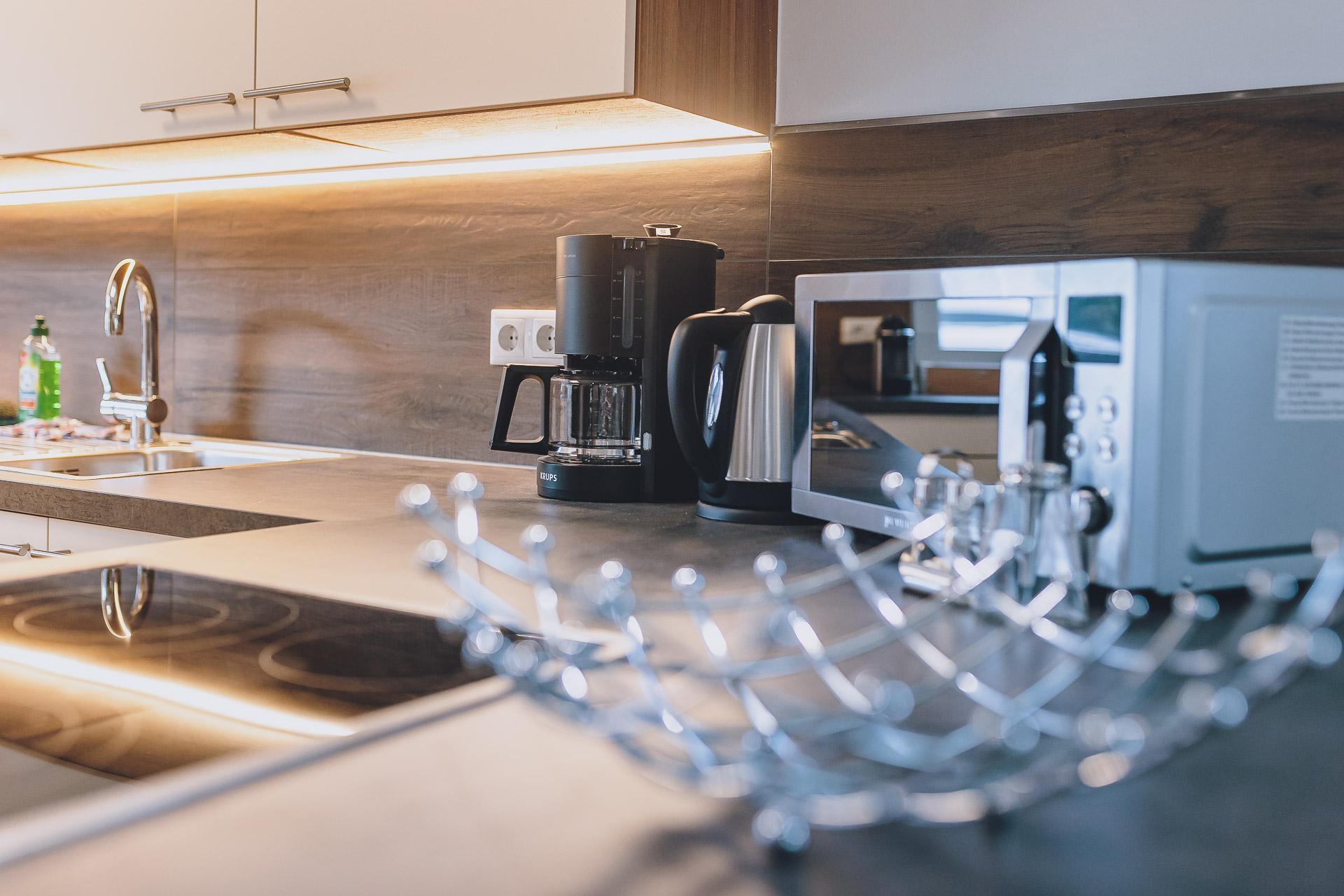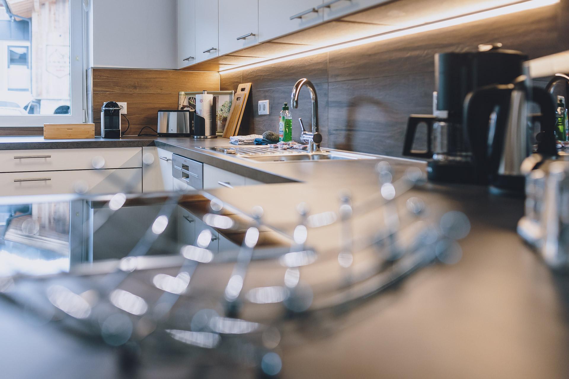 Die offene Küche bietet alles was unsere Gäste zum Zaubern ihrer Gerichte benötigen: Kühl/Gefrierschrank, Backofen, Spülmaschine, Geschirr/Besteck, Kochutensilien, Kaffeemaschine (Tabs), Toaster und einen Wasserkocher. Zentralheizung und klimatisierter Boden sorgen immer für die richtige Temperatur. Bügeleisen, Waschmaschine und Trockner sowie ein Parkplatz vor dem Haus komplettieren das Angebot.
