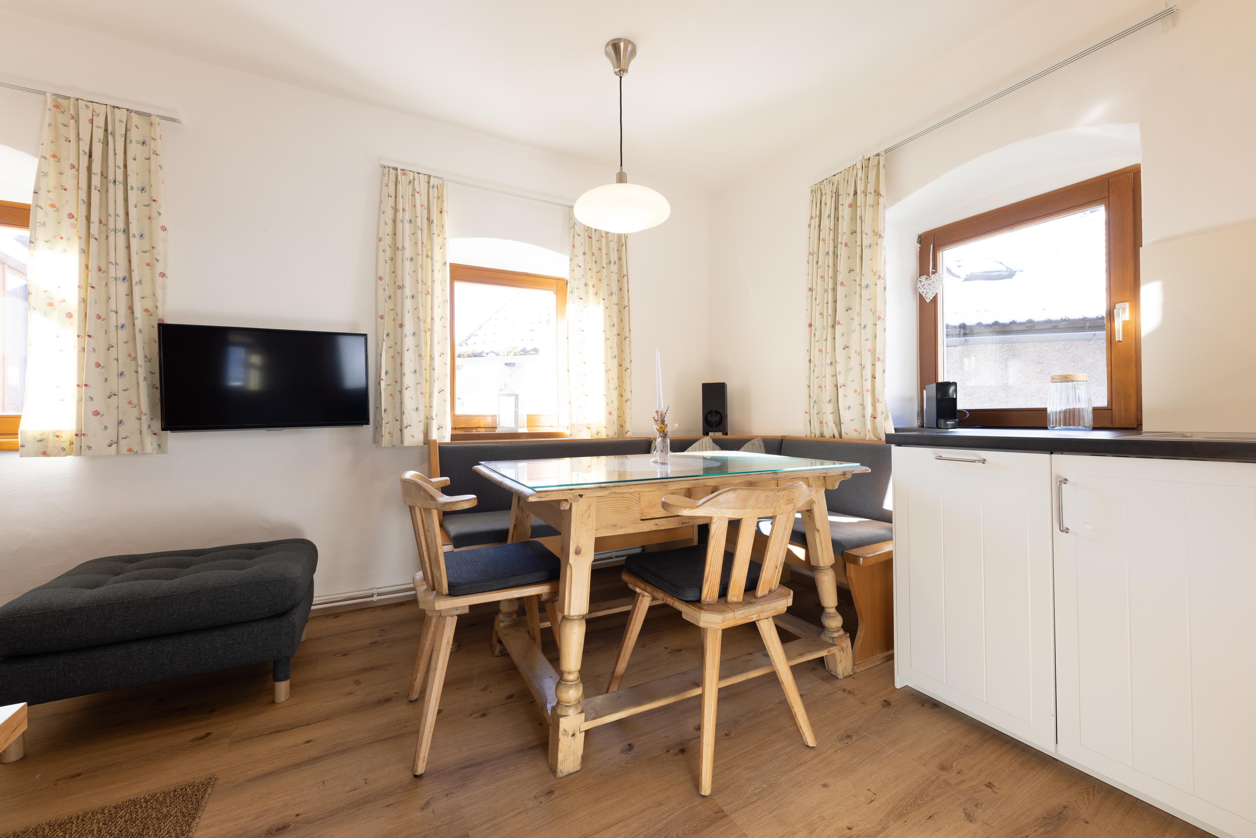 Großes Schlafzimmer (1) mit Doppelbett und Zimmersafe; Schlafzimmer (2) mit komfortablem Etagenbett; Wohnküche mit Couch und Sitzkissen sowie Esstisch für 4 Personen; Küchenzeile mit kompletter Küchenausstattung (Geschirrspüler, Backofen, Kühlschrank mit kleinem Gefrierfach, Wasserkocher, Nespresso- und Filter-Kaffeemaschine, 4-Herdplatten, komplette Geschirr- und Kochausstattung, etc.); kleiner-feiner nach Süden ausgerichteter Balkon mit atemberaubenden Ausblick auf die Stubaier Bergwelt; kostenloses WLAN, SAT-TV;